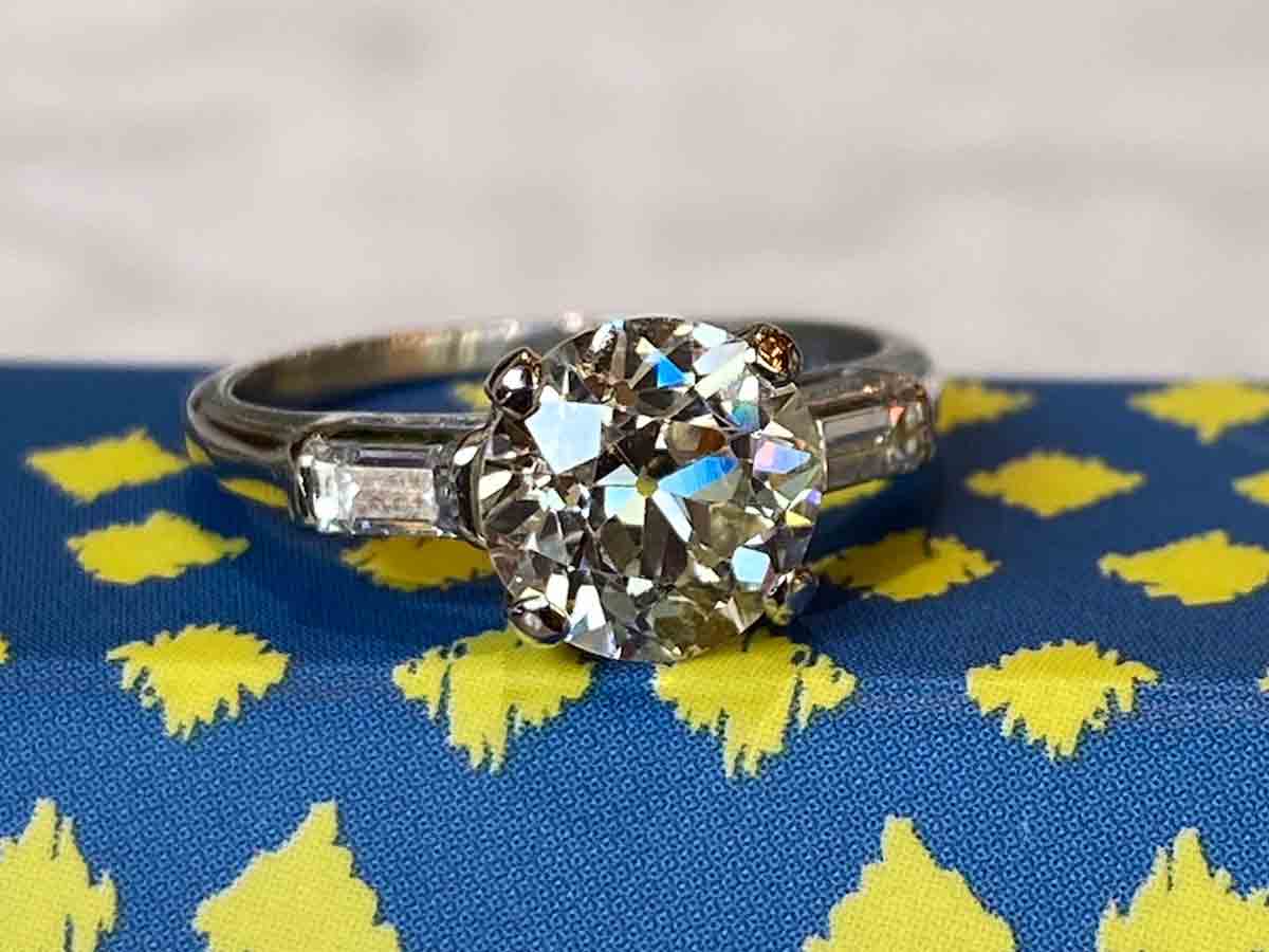 2.11 Old European Cut Diamond Engagement Ring in Platinum. This stunning 2.11 carat Old European cut diamond engagement ring is finished in platinum and comes from the Art Deco period. The primary stone is slightly warmer with an N color, and is flanked on each shoulder by thin baguettes. This special vintage ring fits inside a wonderful size range that is large enough to have a tremendous presence, but retains a classic and clean appearance.
