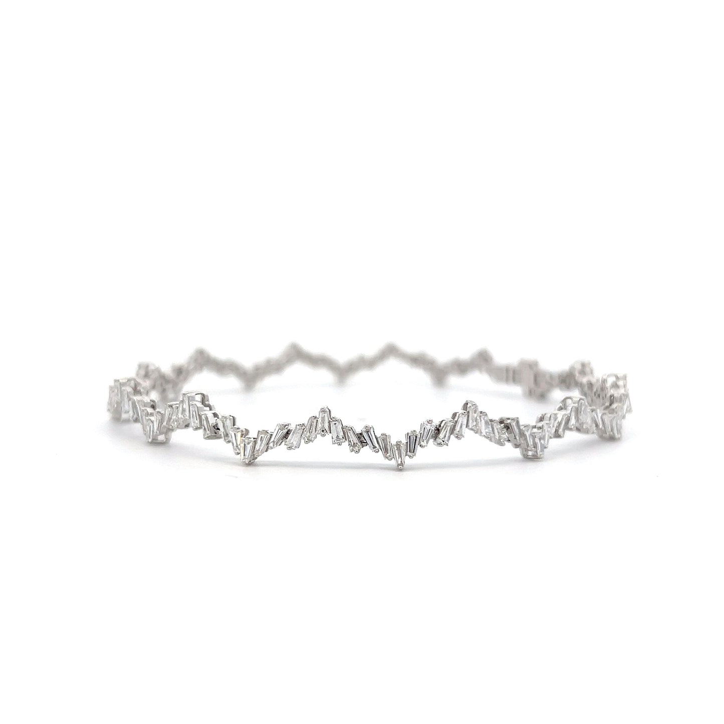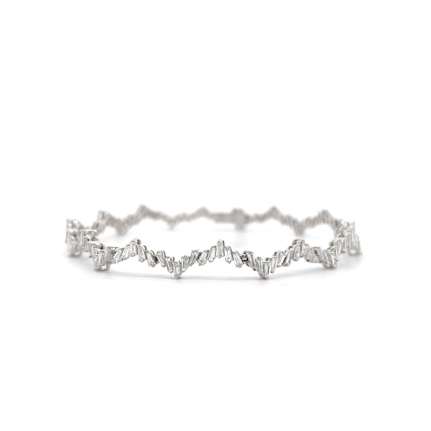 This modern tapered baguette diamond bracelet is a standout addition to any collection. Crafted in 18 karat white gold, the bracelet features a unique zig-zag design adorned with prong-set baguette diamonds. The diamonds have an H-I color and VS2-SI1 clarity and sparkle brilliantly from every angle. The polished white gold enhances the clean lines and sharp angles of the diamonds, making this bracelet perfect for stacking with other pieces or wearing solo. Versatile enough for both special occasions and everyday wear, this bracelet combines playful design with refined elegance.
