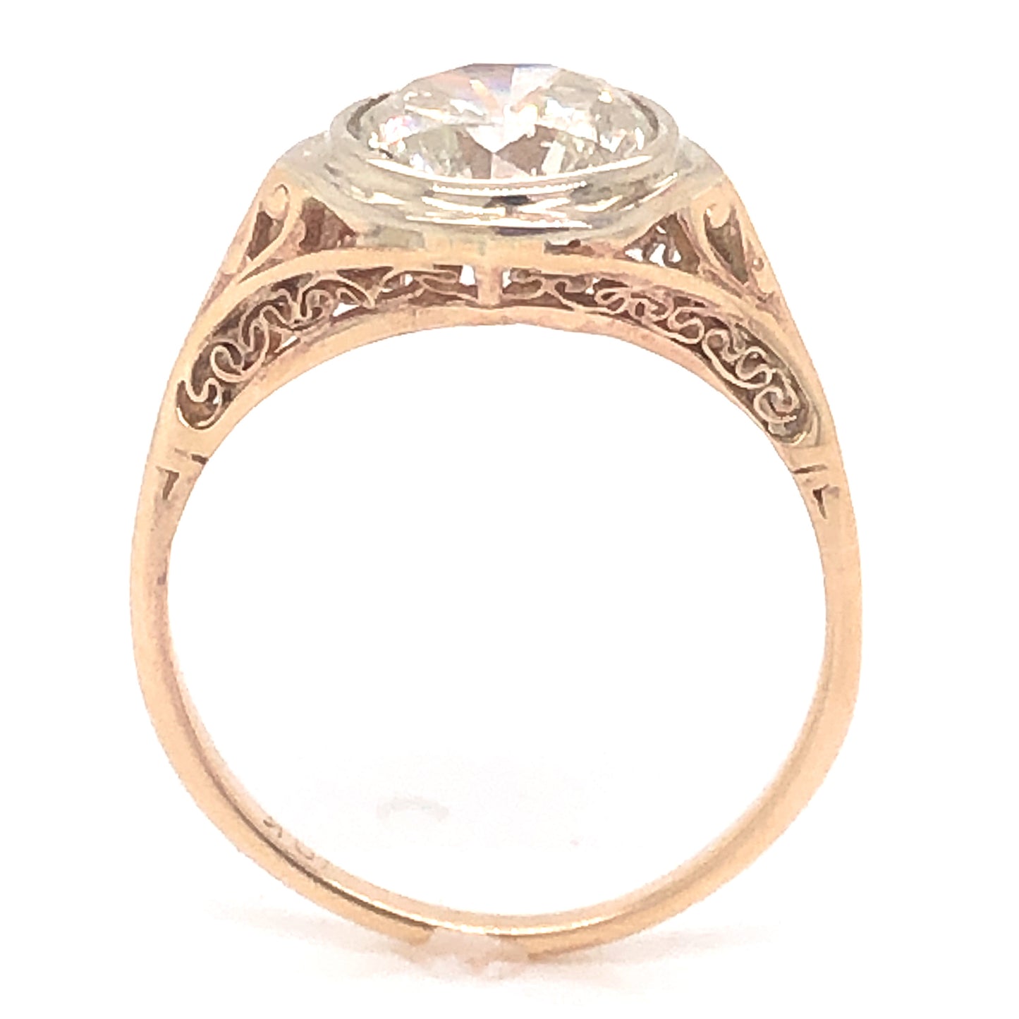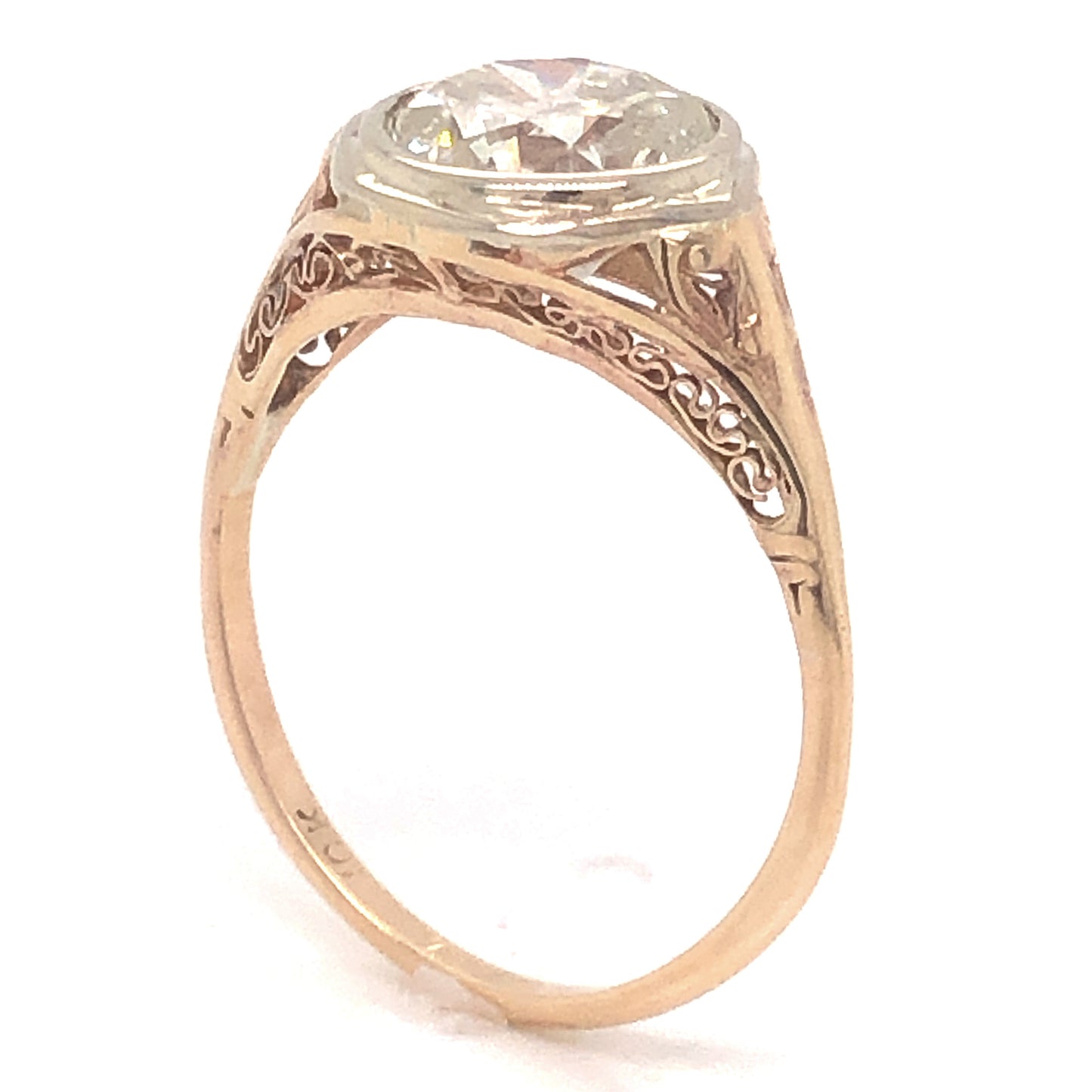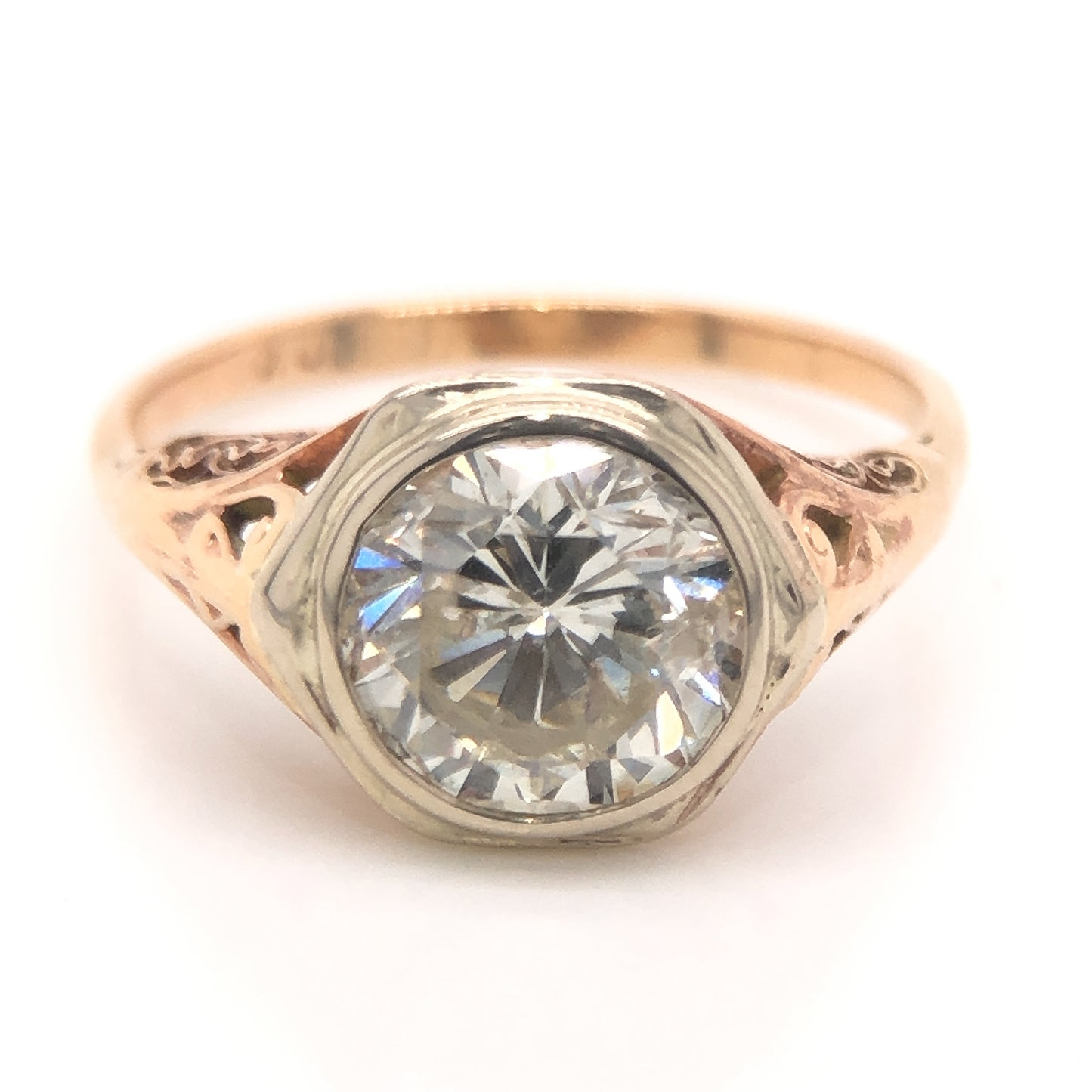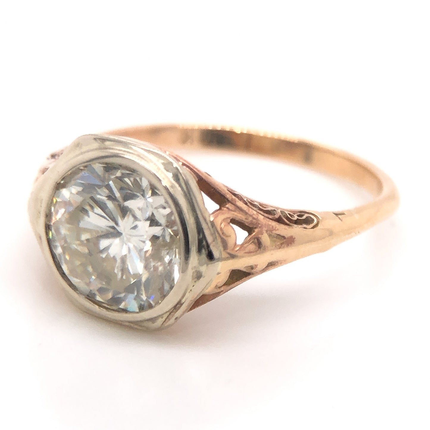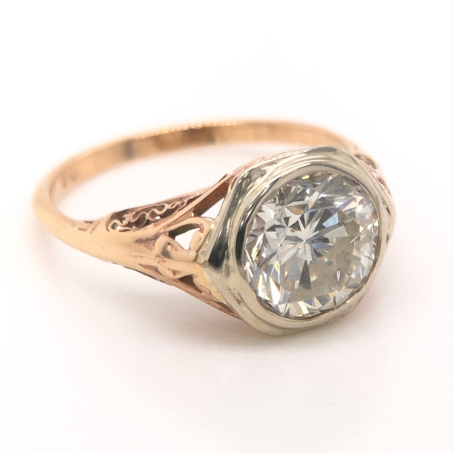 2.15 Vintage Diamond Engagement Ring in 10k Yellow Gold. This lovely Mid-Century engagement ring features a 2.15 carat Round Brilliant cut diamond finished in two-toned 10 karat white and 10 karat yellow gold. The center diamond has a soft, champagne hue and is cut for maximum brilliance. The diamond is bezel set in 10k white gold. From the profile, filigree engravings decorate the gallery rail and shoulders of the 10k yellow gold band. Created in the Mid-Century era, this engagement ring will bring a touch of beautiful history into your modern ceremony!