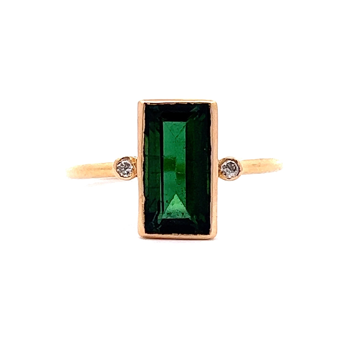 This modern statement ring is a beautiful blend of bezel-set green tourmaline round brilliant cut diamonds. It features a timeless, bezel-set 2.15 carat emerald cut green tourmaline. The tourmaline has a soft, light green hue, which is complimented by two round brilliant cut accent diamonds totaling .03 carats. A simple, classic design that can be worn easily everyday.
