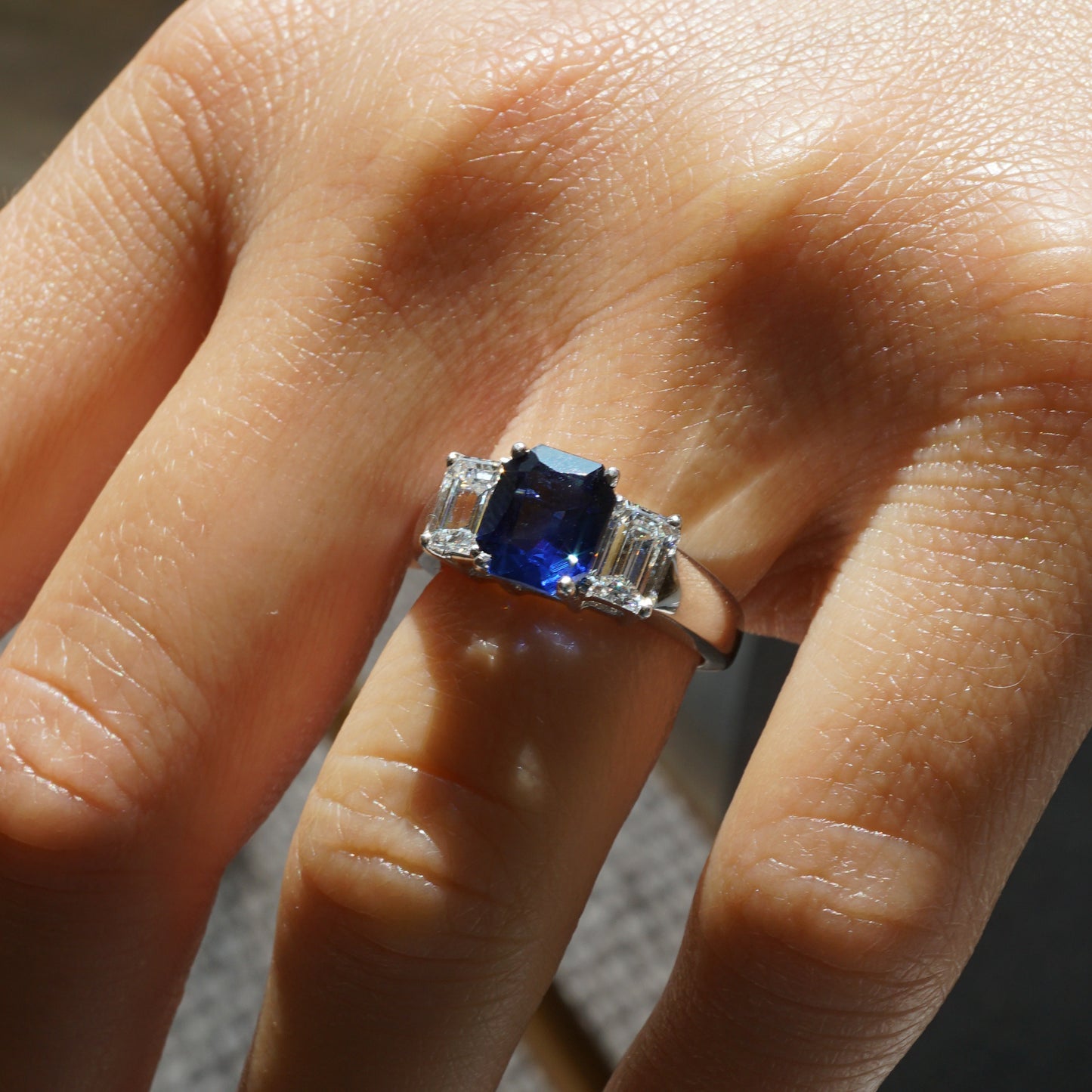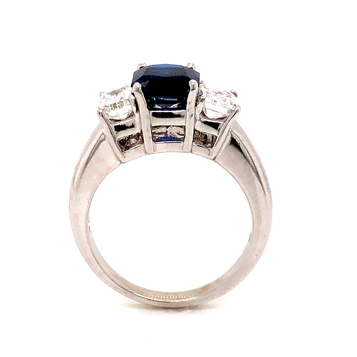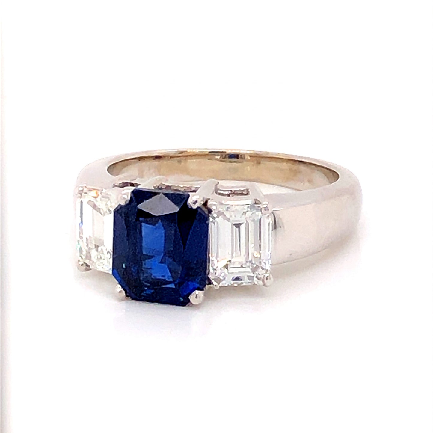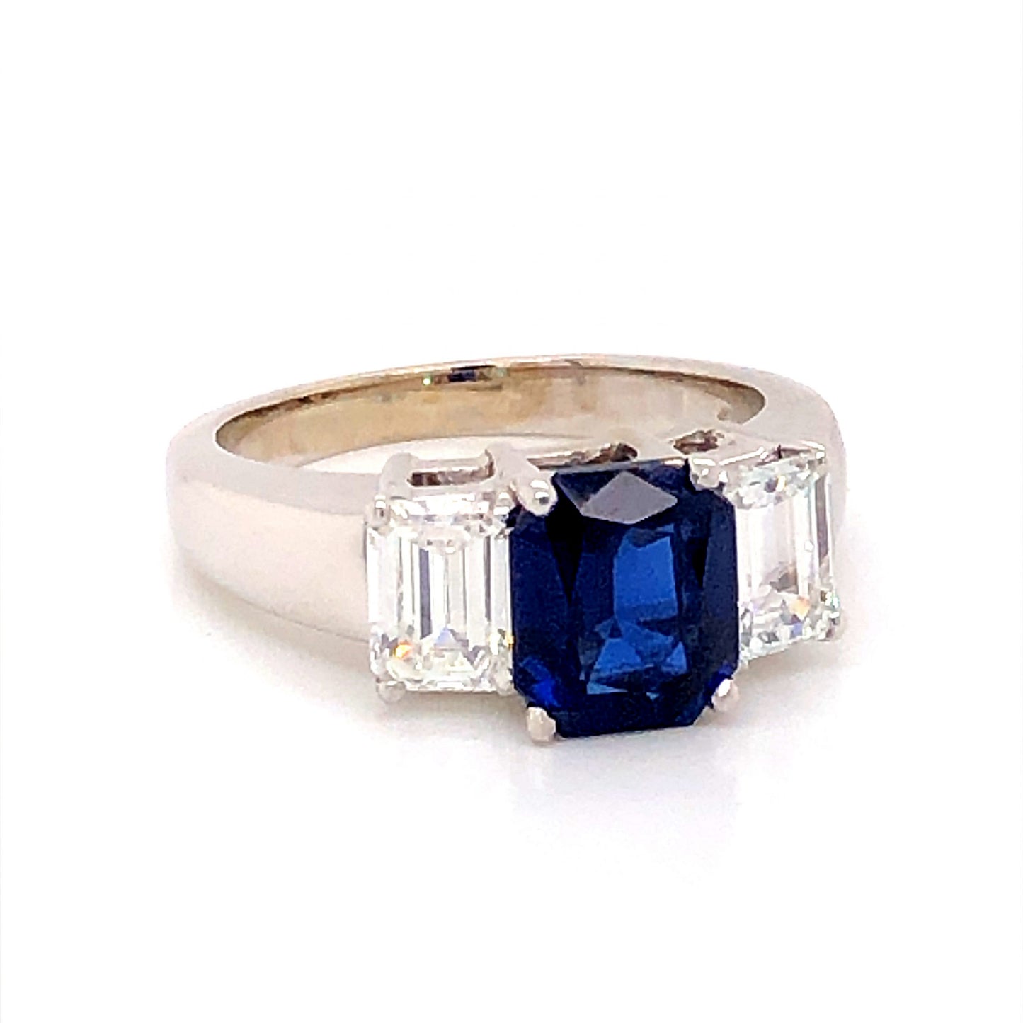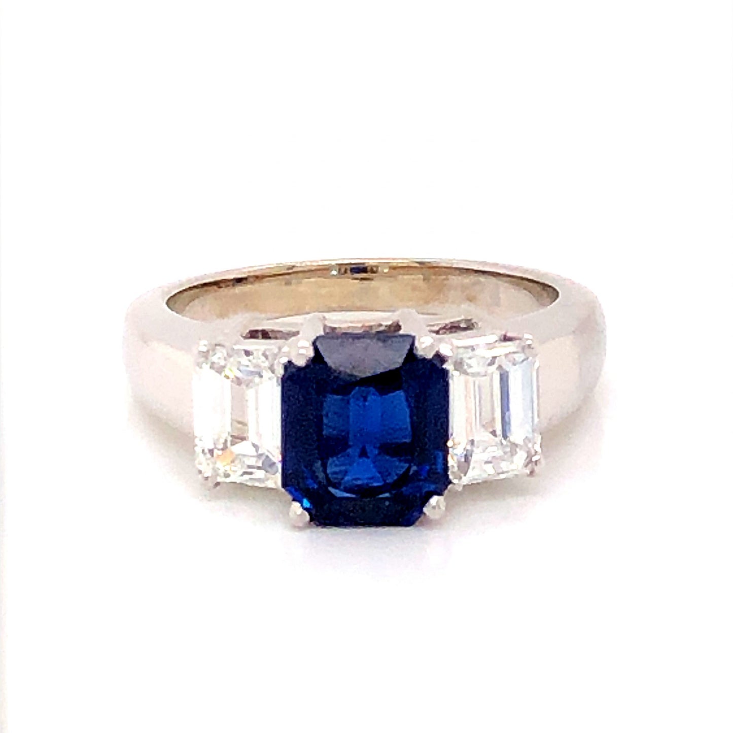 2.18 Cushion Cut Sapphire and Diamond Ring in 14k White Gold. This modern engagement ring features a 2.18 carat Cushion Cut sapphire and 1.30 carats of accent diamonds in shimmering 14 karat white gold. The blue sapphire has highly saturated Admiral blue hue and is set in four prongs. The center stone is flanked by two (2) .65 carat baguette diamonds. The colorless diamonds bring elegance and brilliance to the fire of the sapphire, thanks to the precision of the Cushion Cut facets. From the profile, the sapphire and diamonds are set in a sleek basket mounting and finished on a tapered 14 karat white gold band. This sensational engagement ring is a true future classic!