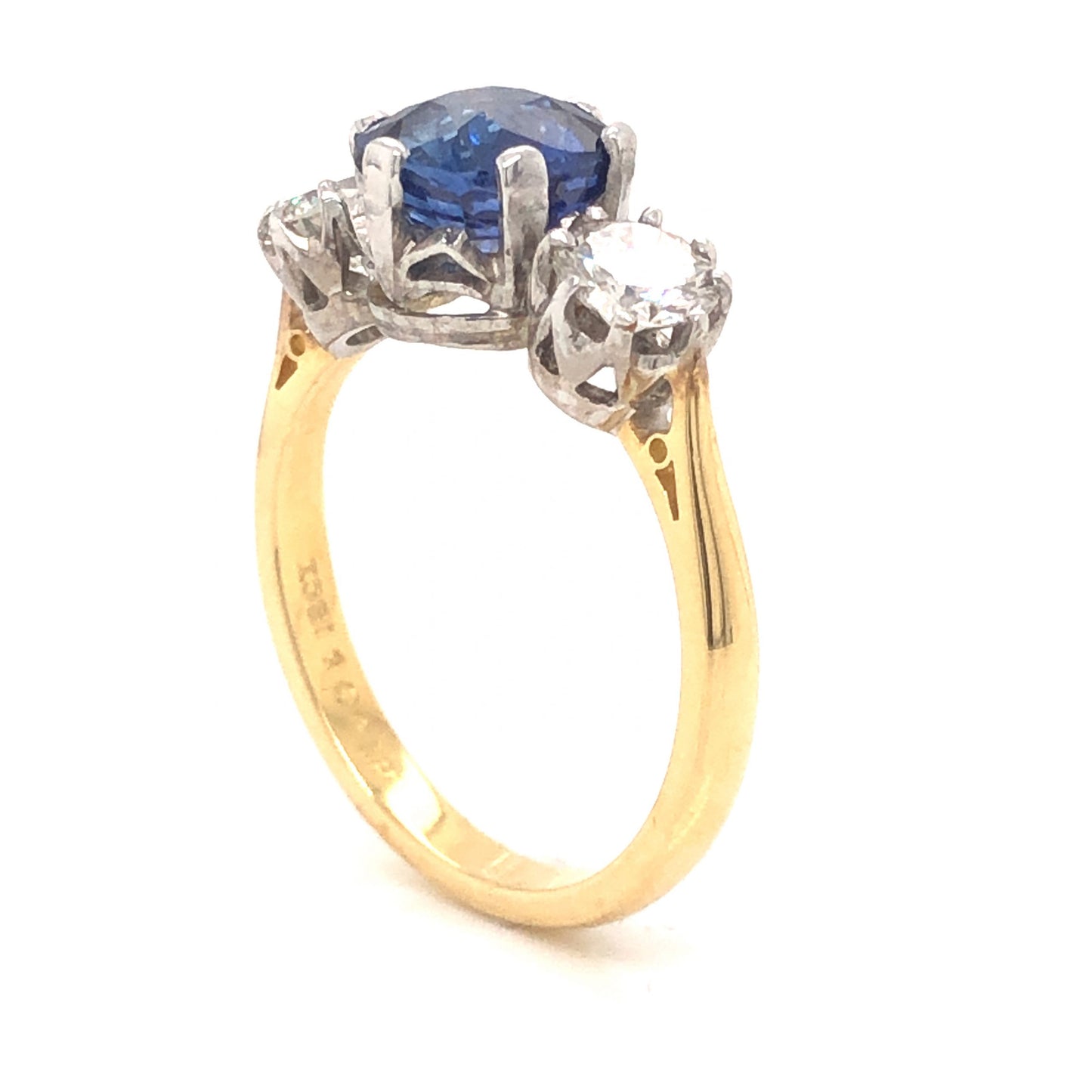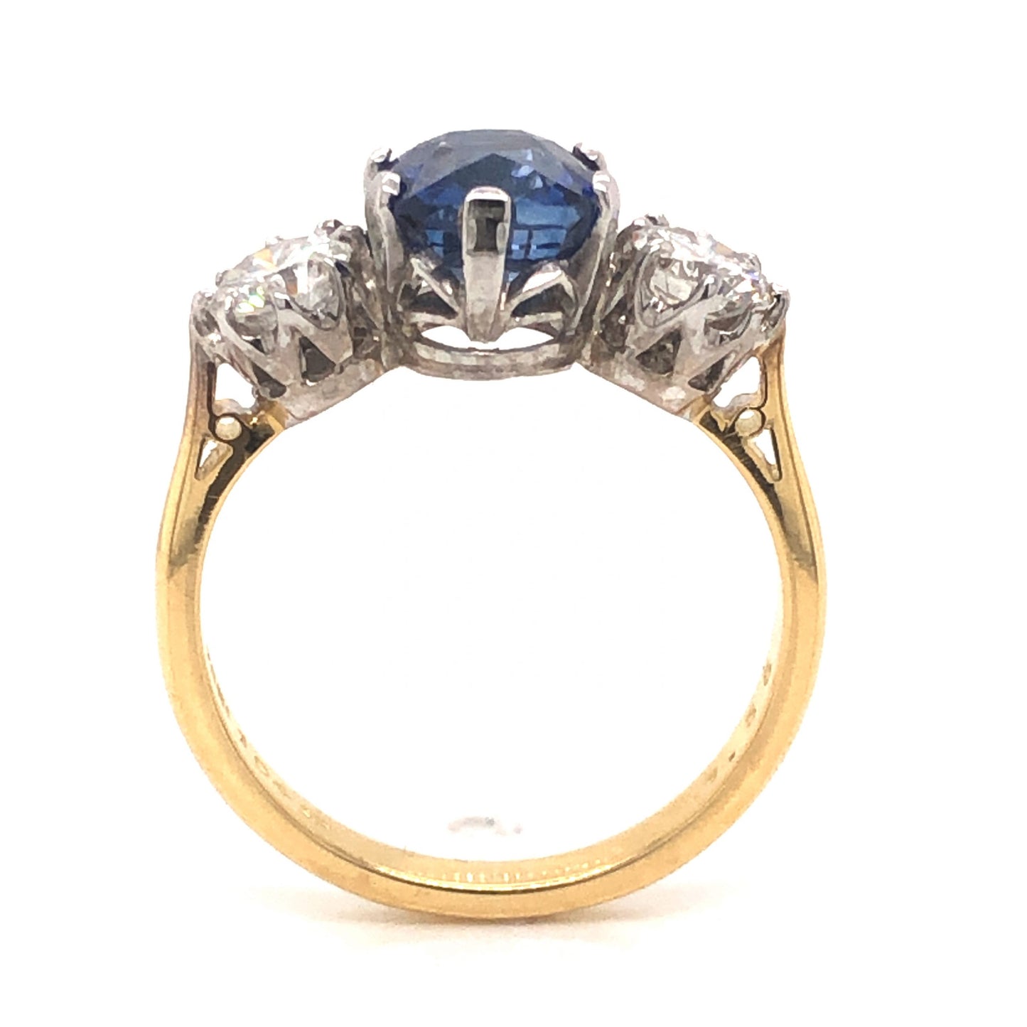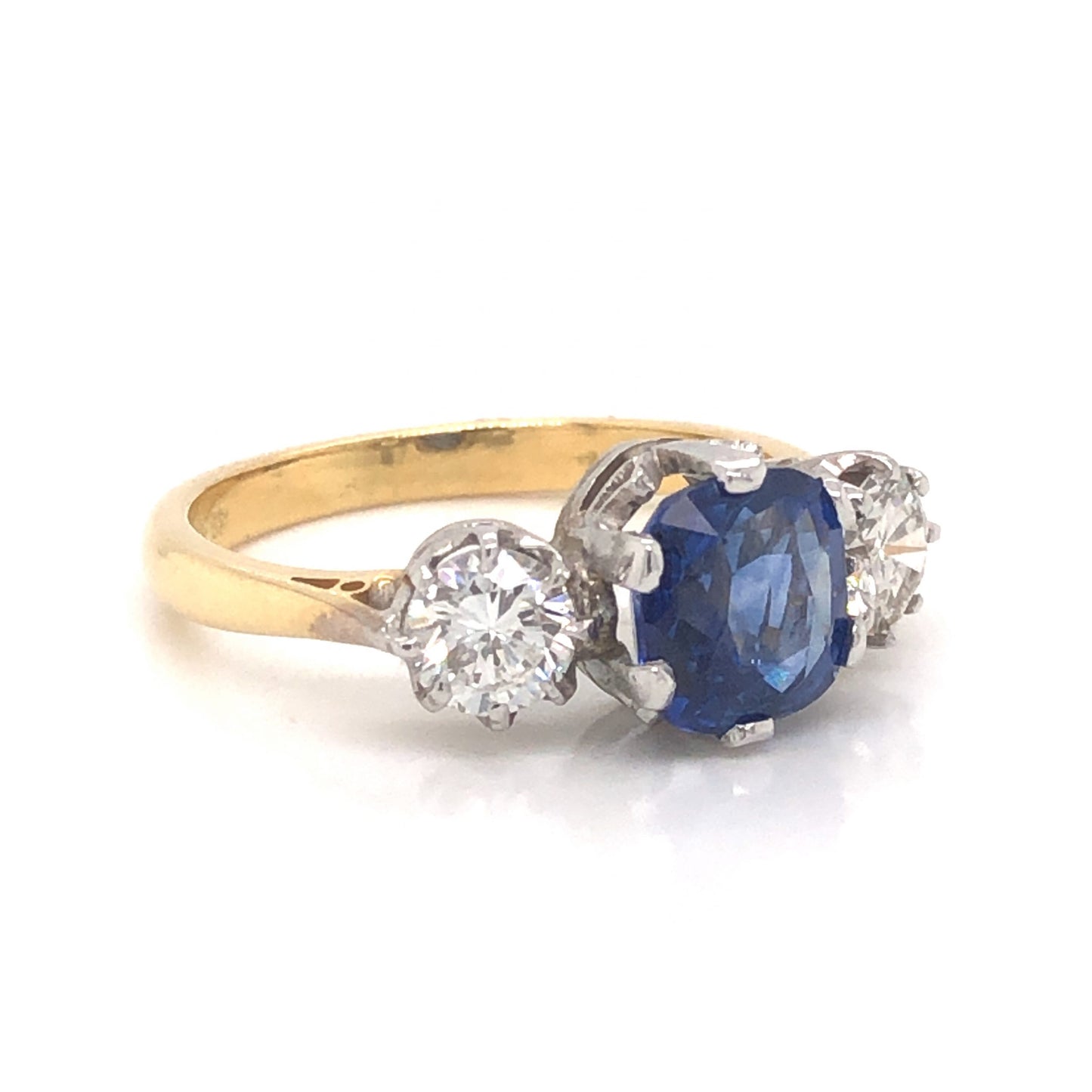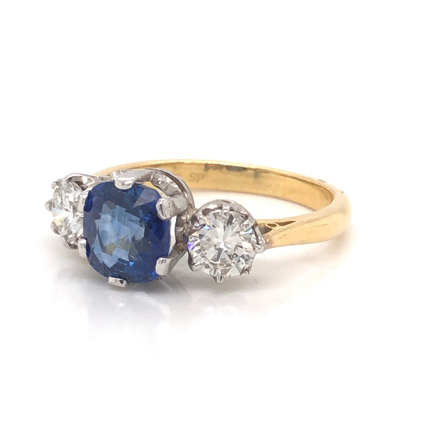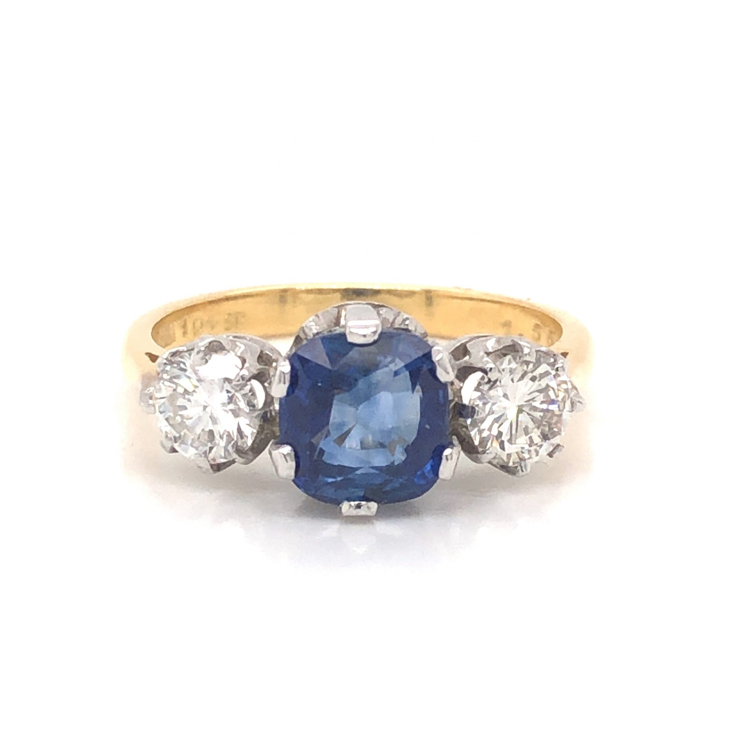 2.18 Sapphire Diamond Engagement Ring in 18k Platinum. This Mid-Century three stone engagement ring features .90 carats of Round Brilliant cut diamonds and a 2.18 carat cushion cut blue sapphire finished in platinum and 18K yellow gold. Two (2) .45 carat diamonds sparkle against the cushion cut center sapphire. Set in platinum prongs, the blue sapphire has a radiant, royal blue hue. From the profile, vintage crown baskets support the gems, finished on a polished 18K yellow gold band.