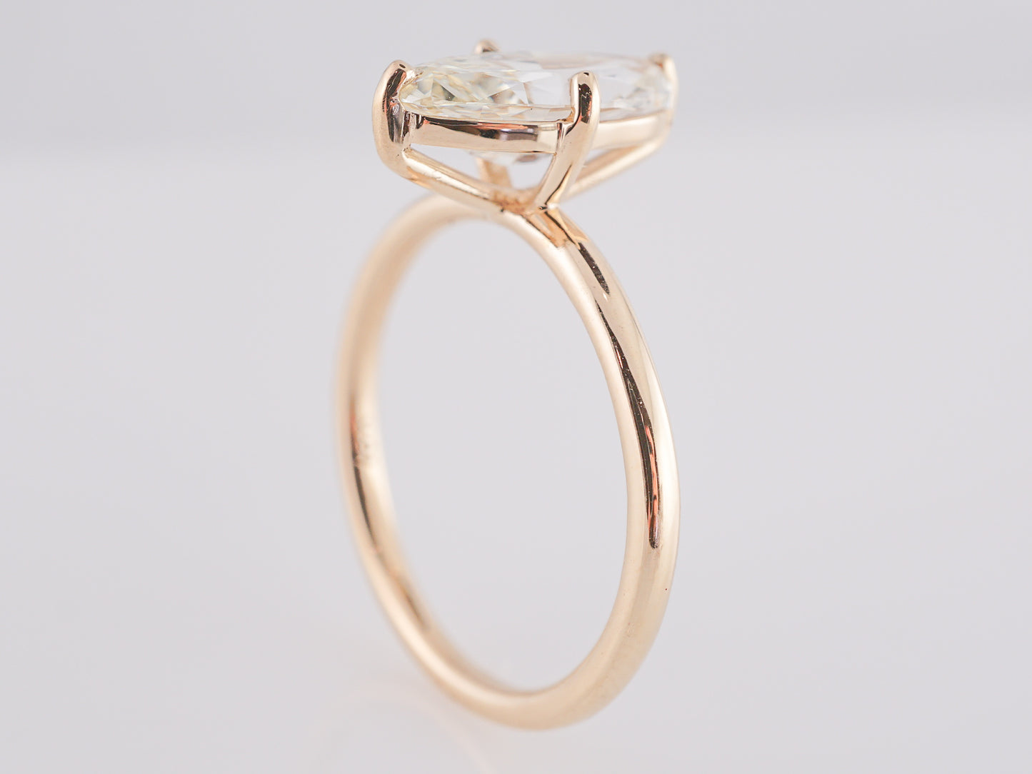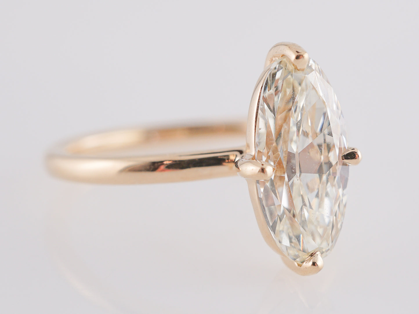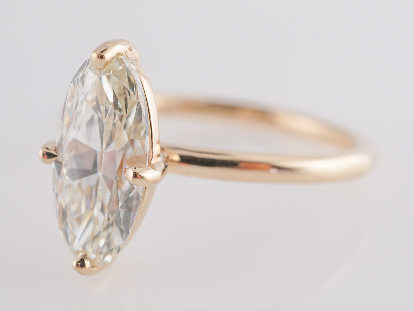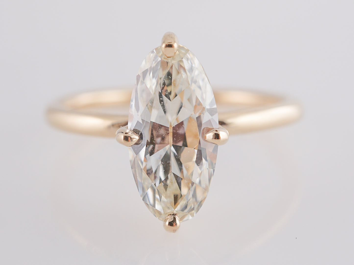 2.18 Solitaire Marquise Cut Diamond Engagement Ring. This GIA-certified diamond engagement ring features a dazzling 2.18 carat marquise cut diamond in 14k yellow gold. The marquise diamond has unique, slightly rounded points and elongated facets that fit perfectly into four prongs. The diamond is near colorless with a clarity of SI2. The golden basket cradling the stone melts into a gorgeous, 14k yellow gold band. This ring is a true feast for the eyes!