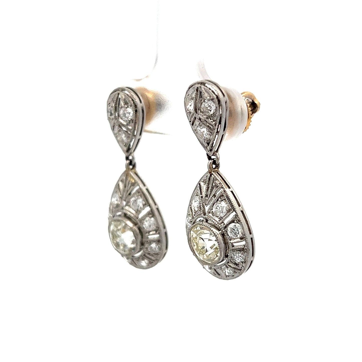 These Art Deco drop earrings are crafted from platinum and feature a pair of Old European cut diamonds at the center. Each diamond weighs 1.52 carats, with SI1 clarity and K color. Surrounding these central diamonds are 22 accent stones, also Old European cuts, each measuring 2.0mm and weighing .03 carats, for a total accent weight of .66 carats. The earrings are detailed with milgrain work, adding texture and sophistication. The pear-shaped studs flow into pear-shaped drop dangles, creating an elegant silhouette. They are secured with screw back posts for comfort and security, making them suitable for any occasion.