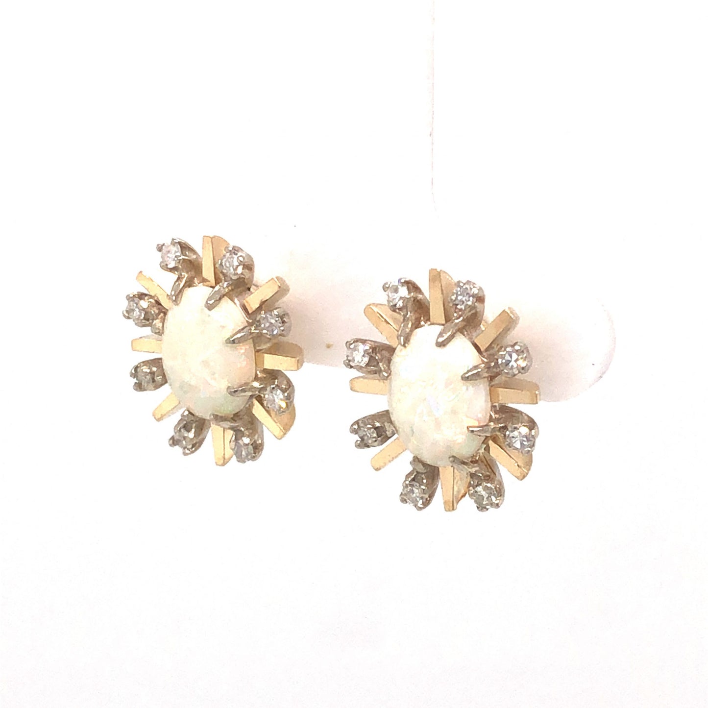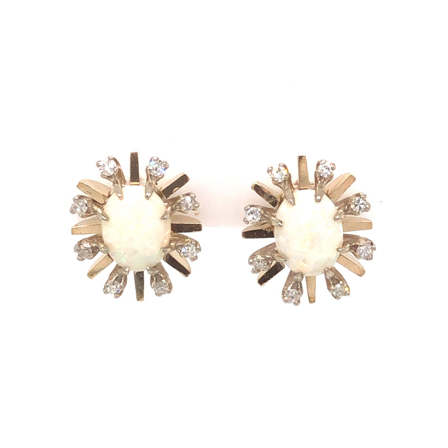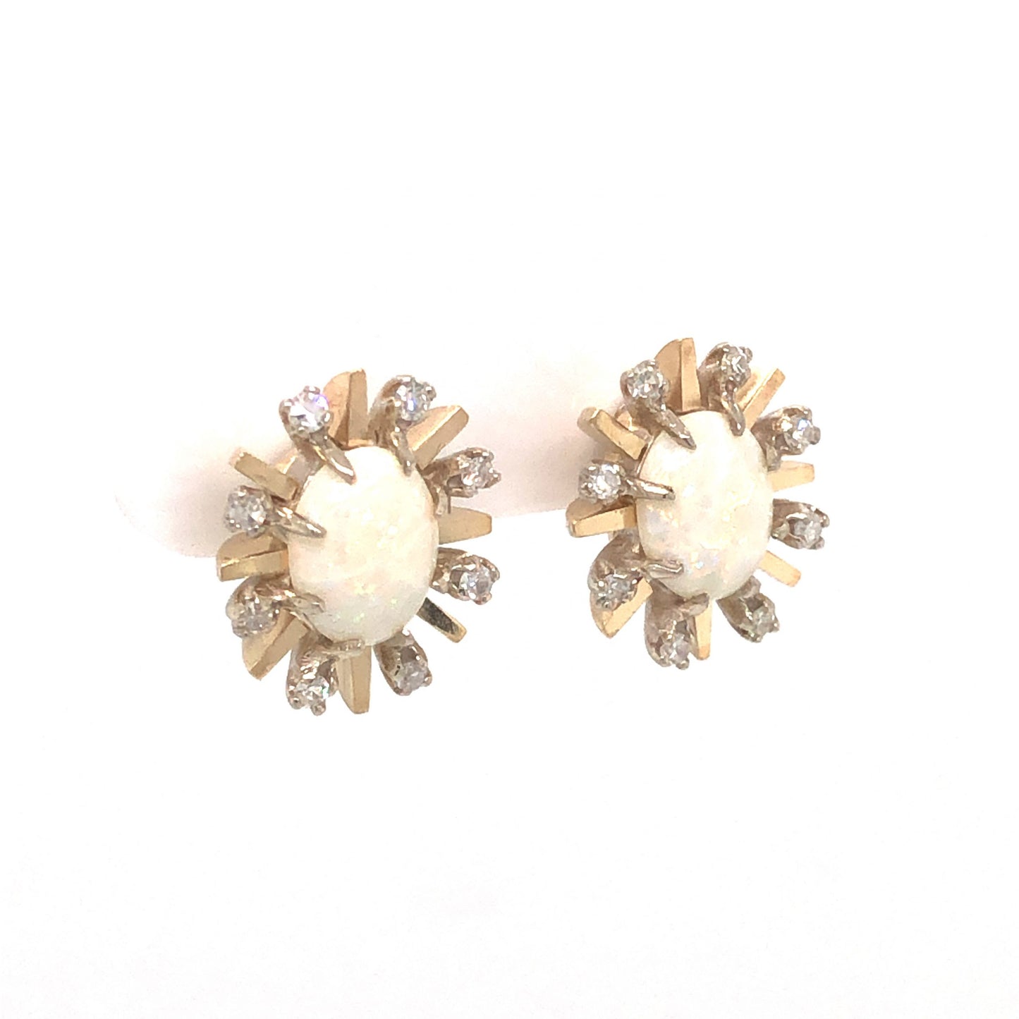 2.20 Victorian Opal Diamond Earrings in 14k Yellow Gold. These romantic, Victorian stud earrings feature 2.20 carats of opals and .288 carats of accent diamonds finished in 14k yellow gold. Two (2) 1.10 carat opals with an iridescent, ivory hue are prong set at the center of the earrings. Jutting out from the two opals, sixteen (16) .018 carat single cut diamonds are set on golden starburst forms. The design of these unique earrings are streamlined and stylish. A shimmering set of vintage earrings to pair with any modern wardrobe!