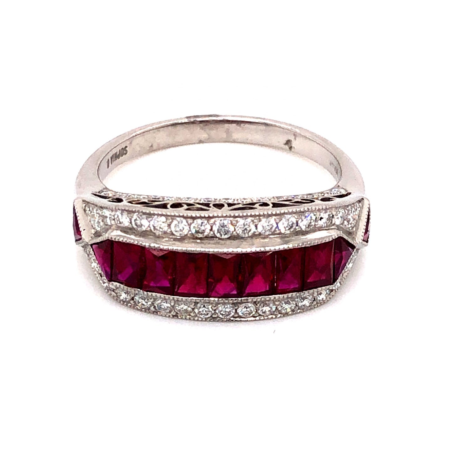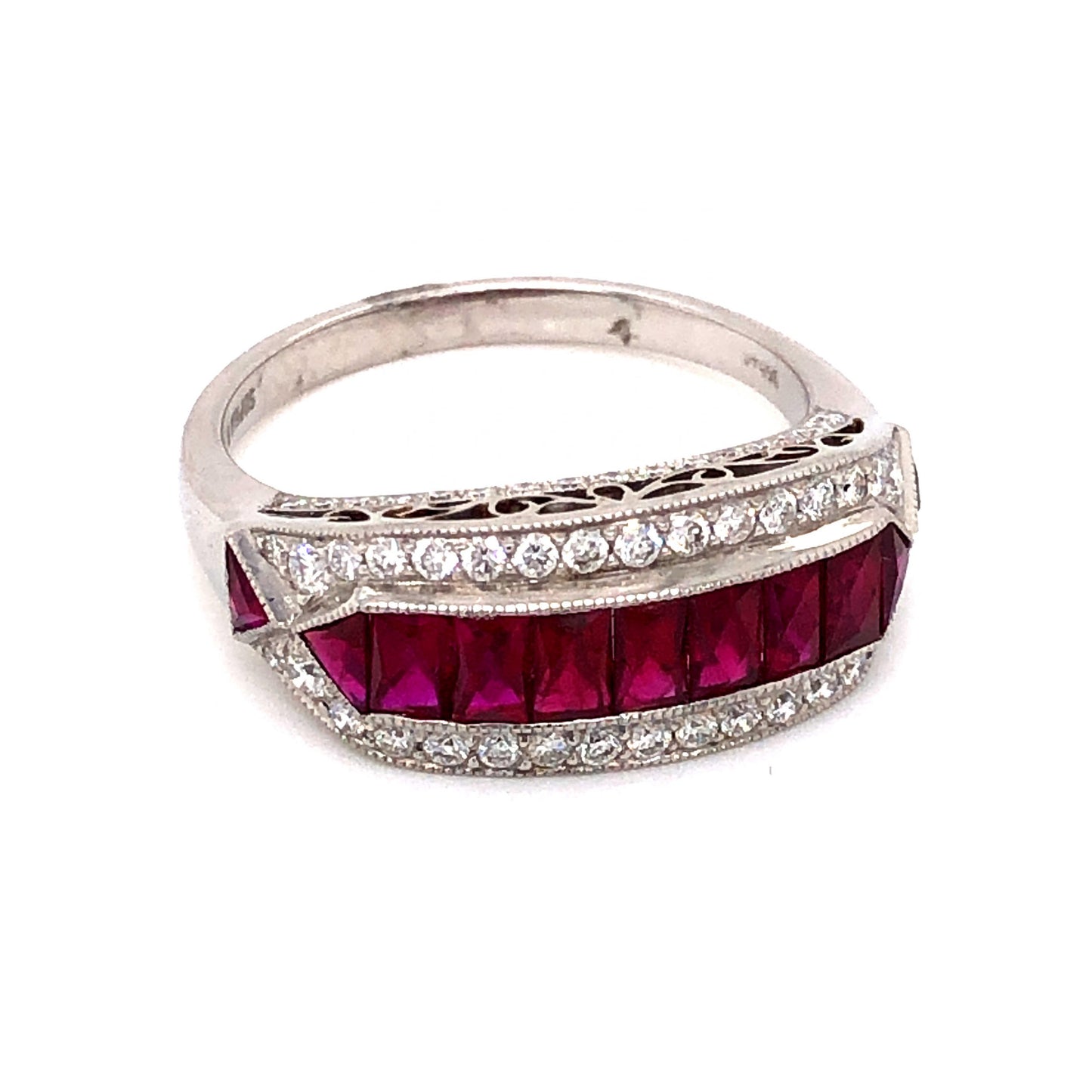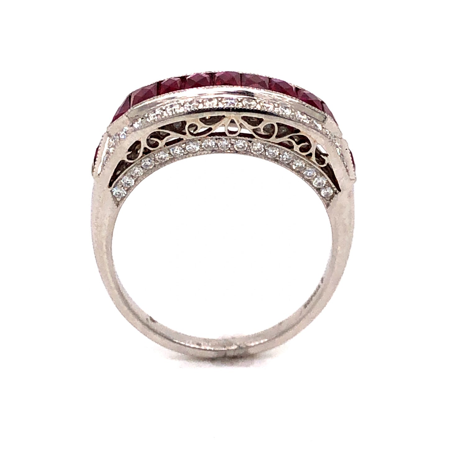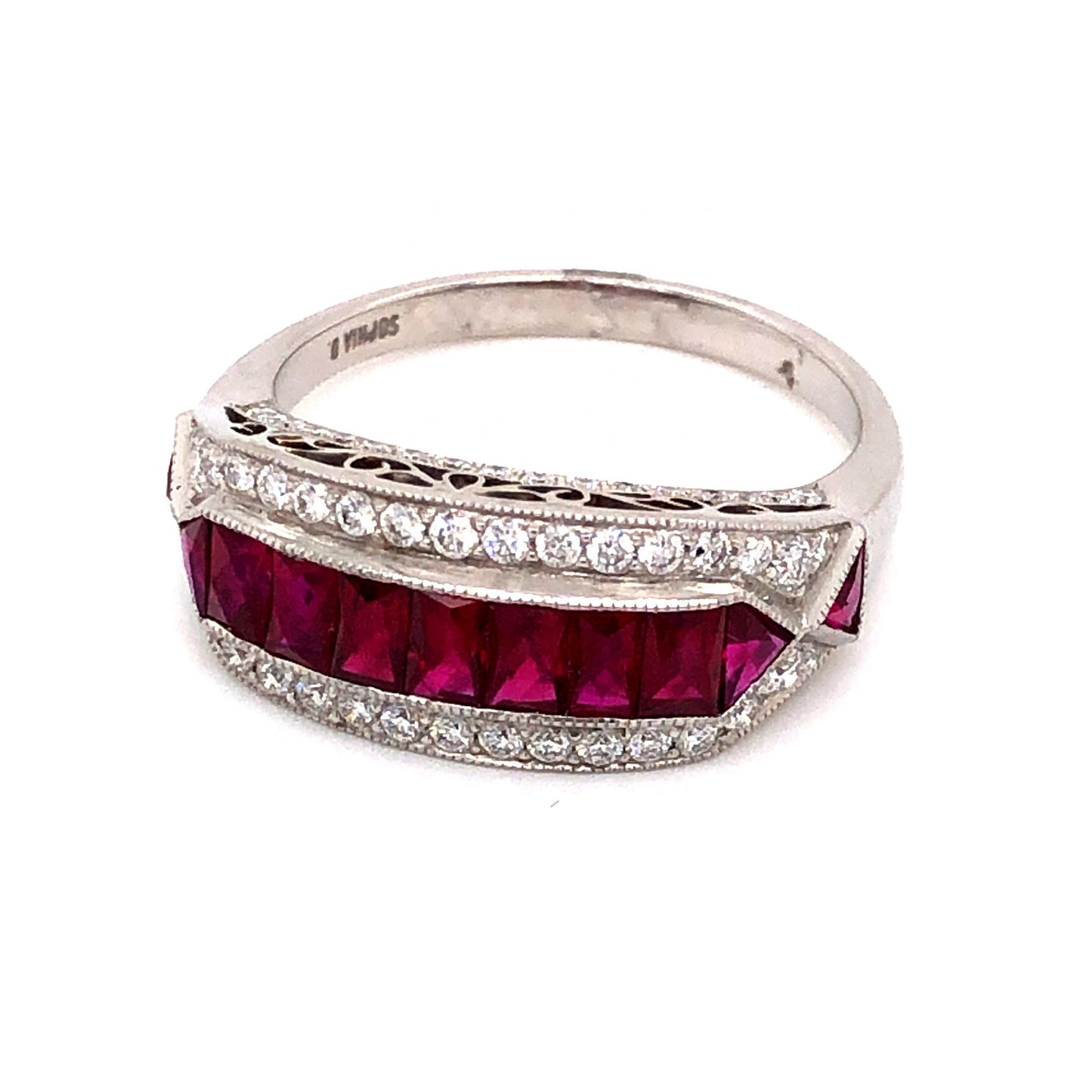2.21 French Cut Rubies Diamond Ring in Platinum. This custom right hand ring features 2.21 carats of French cut rubies and .49 carats of diamonds finished in platinum. Eleven (11) .20 carat rubies, with slender French cut facets, are channel set at the head of the ring. The rubies have a highly saturated, red-magenta hue and are accented by thirty-four (34) .014 carat diamonds. The near colorless diamonds are set in surface prongs at the top and bottom of the rubies. From the profile, a French inspired openwork mounting with diamond accents on the gallery rail completes this gorgeous platinum ring.