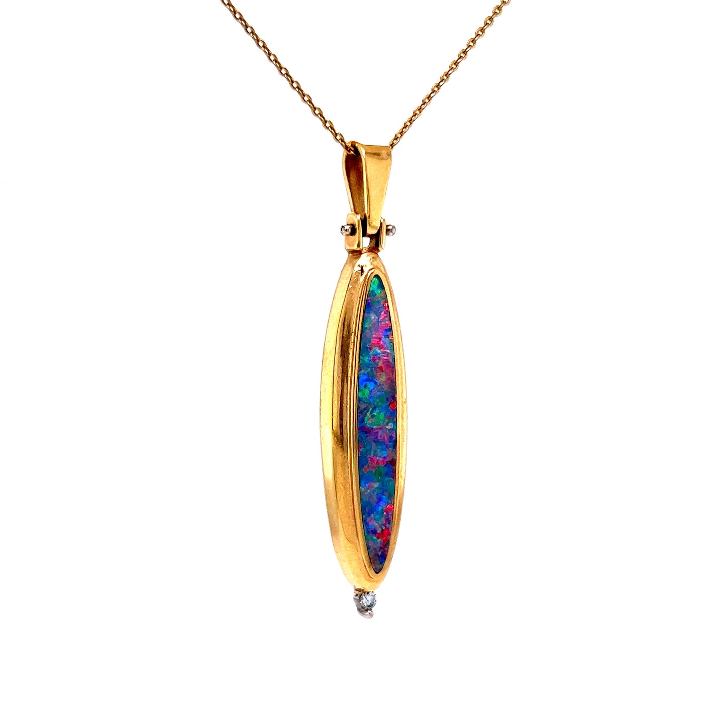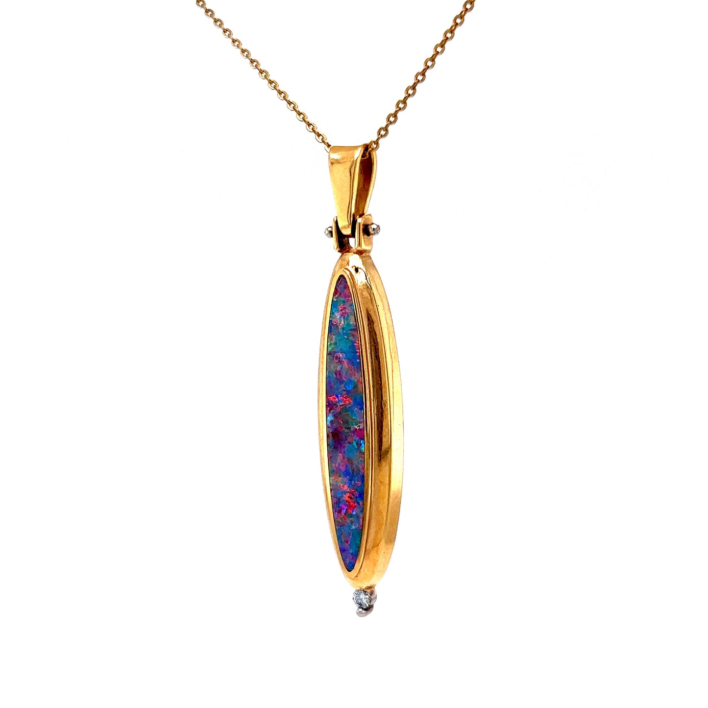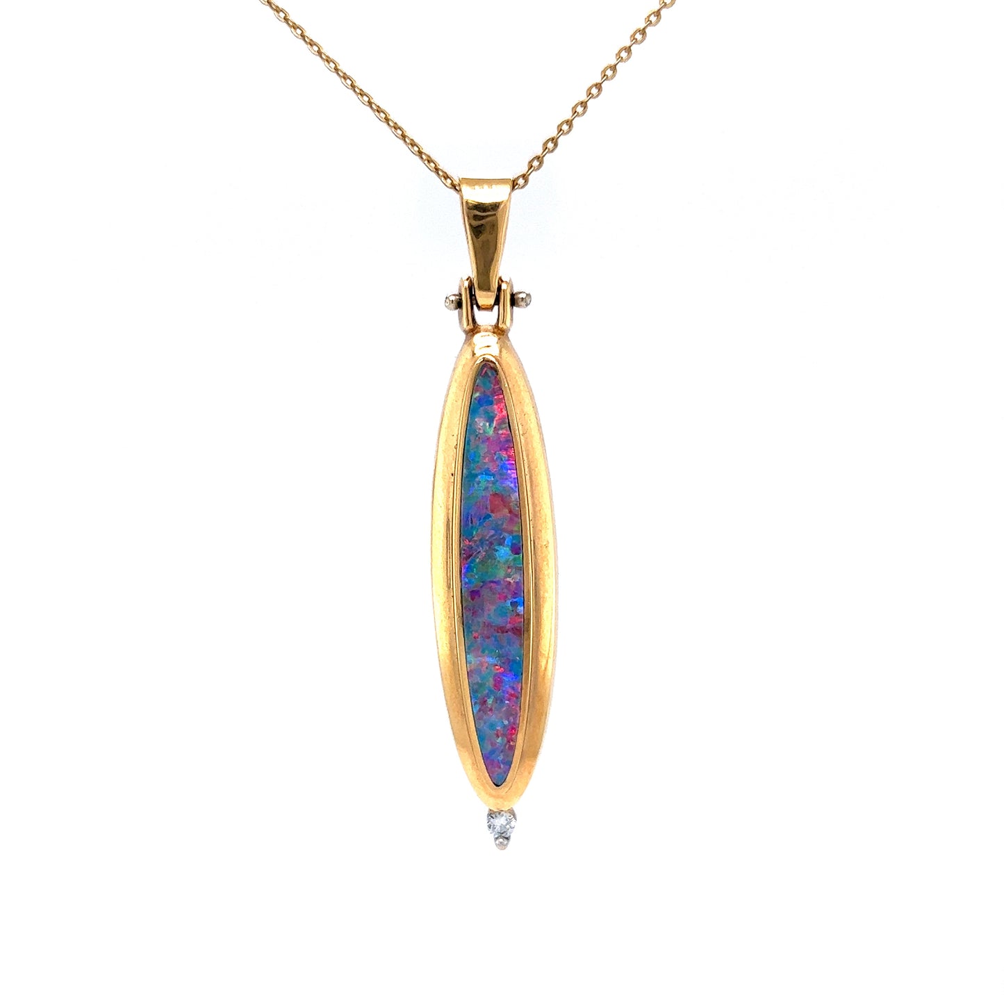 Crafted with 14 karat yellow gold, this pendant features a stunning bezel-set opal with an elongated shape. The opal has a weight of 2.23 carats with measurements of 31.25 x 5.56 x 2.25 mm. Its vibrant colors add a beautiful contrast to the warm yellow gold setting. Additionally, it is accented with a collection of round brilliant cut diamonds that total .04 carats. A perfect and versatile piece that can be worn in many different situations.