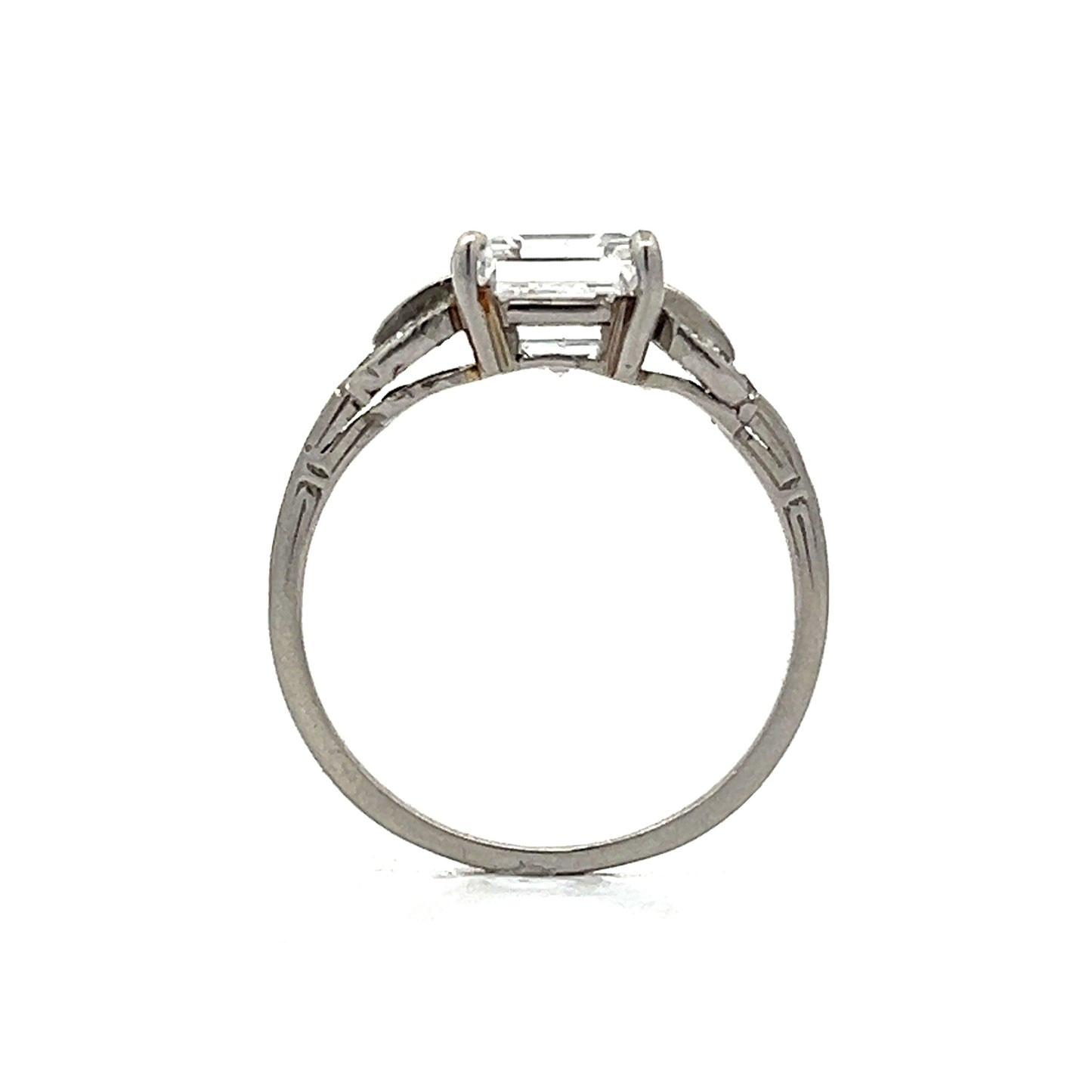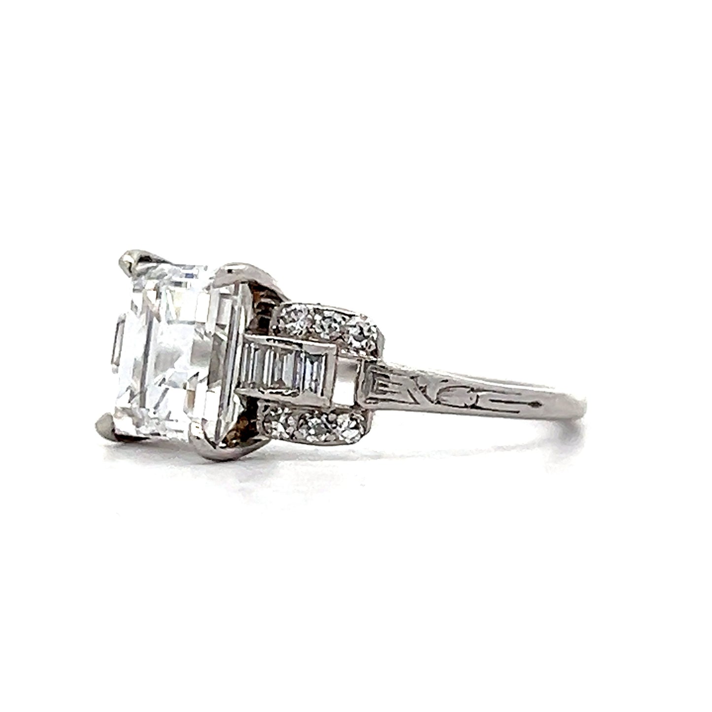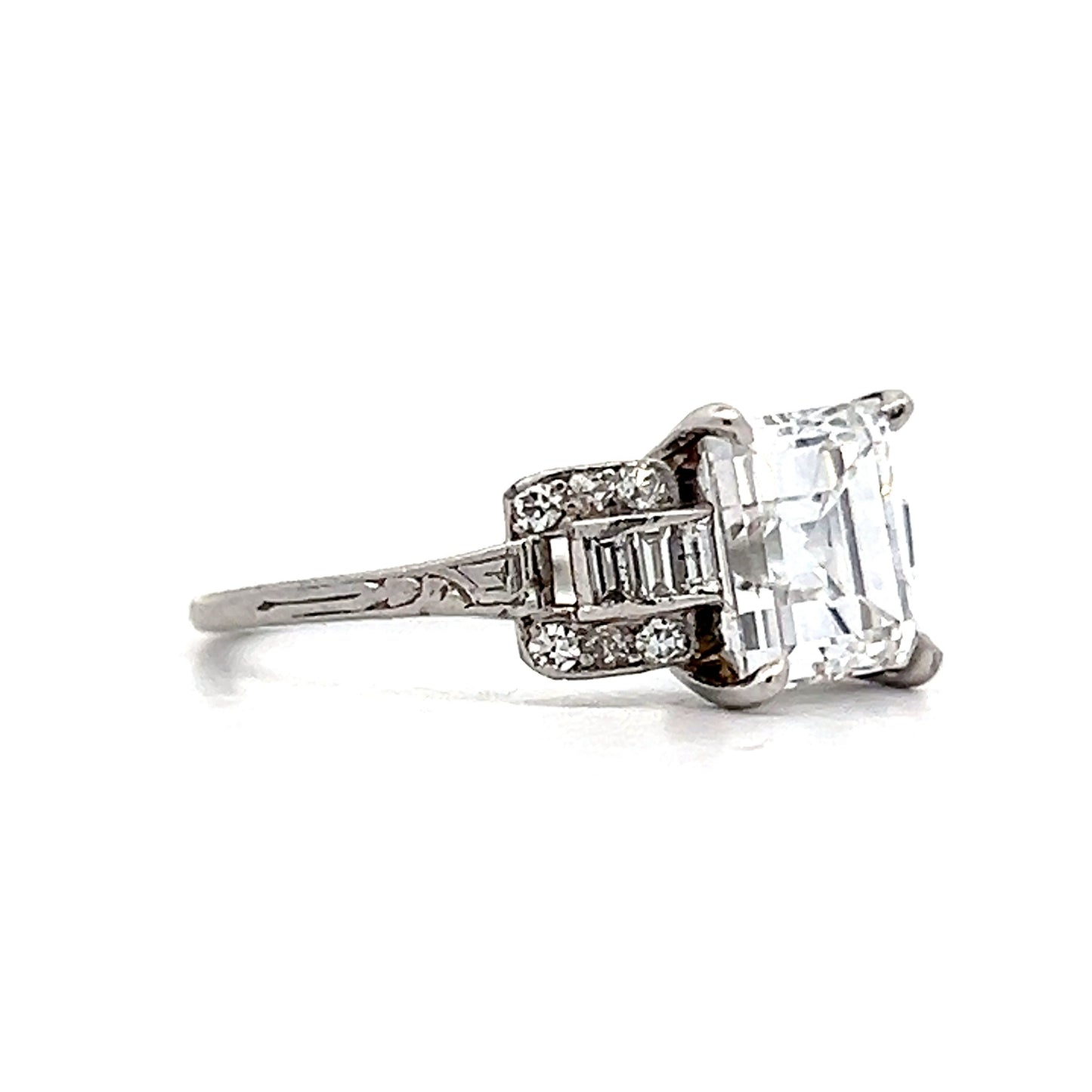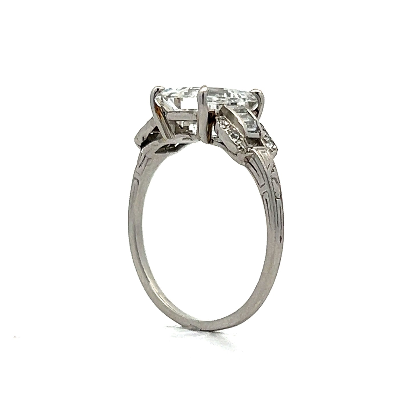 Add a touch of vintage elegance to your special moment with this stunning Art Deco engagement ring. The ring features a breathtaking square emerald cut natural diamond weighing 2.24 carats, with a pristine D color and internally flawless clarity. This center stone is truly a showstopper, radiating with mesmerizing brilliance. The band of the ring is crafted in platinum and boasts intricate engravings, lending to its unique charm and character. Adding to the beauty of this ring are the secondary accent stones, H color and VS2 clarity natural diamonds with a total weight of .24 carats. These stunning gems are arranged in a channel setting, with two sparkling baguette diamonds measuring 2.00 x 1.50 mm and six shimmering single cut diamonds totaling .04 carats.