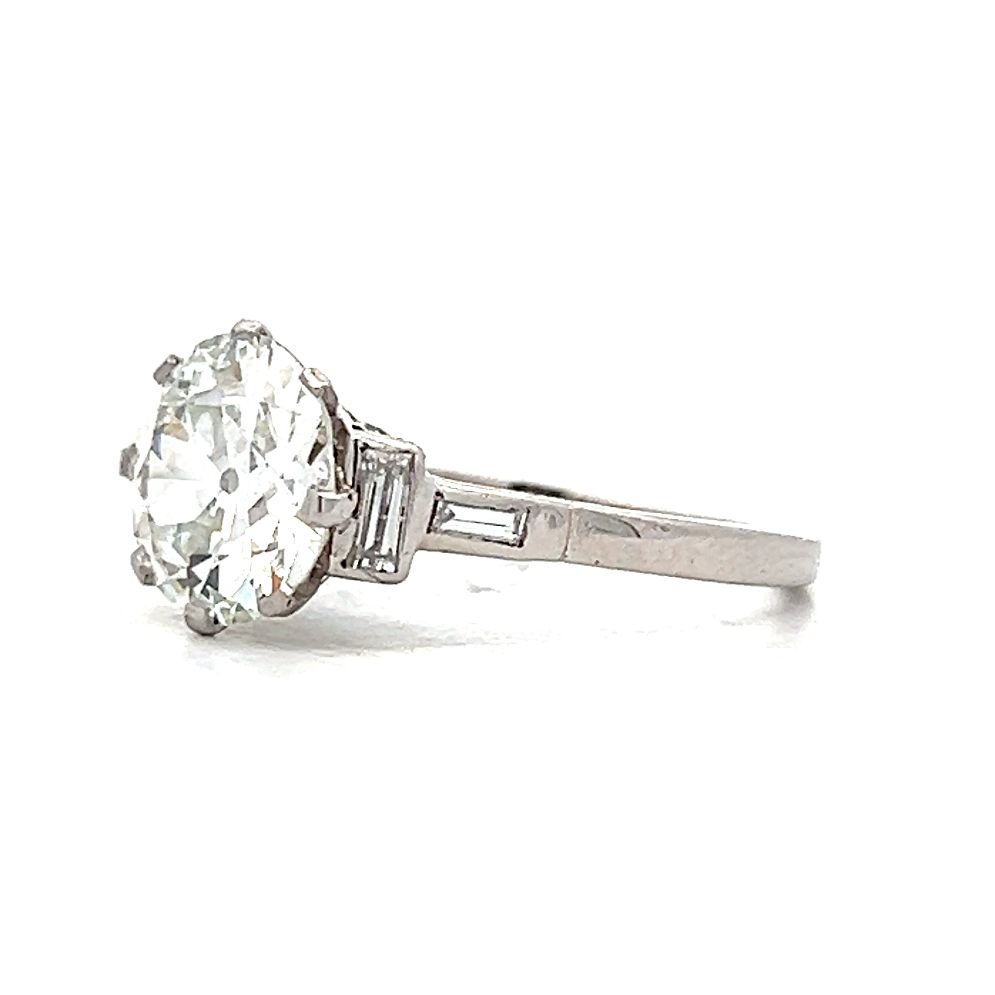 This vintage Art Deco engagement ring features a 2.24 carat old European cut diamond with I color and SI1 clarity, GIA certified and held by eight prongs in platinum. Two baguette cut accent diamonds totaling .26 carats sit bezel-set on either side, measuring 3.65 x 2.00mm each. The total diamond weight comes to 2.62 carats. Platinum setting and old European cut diamond are hallmarks of the Art Deco period.