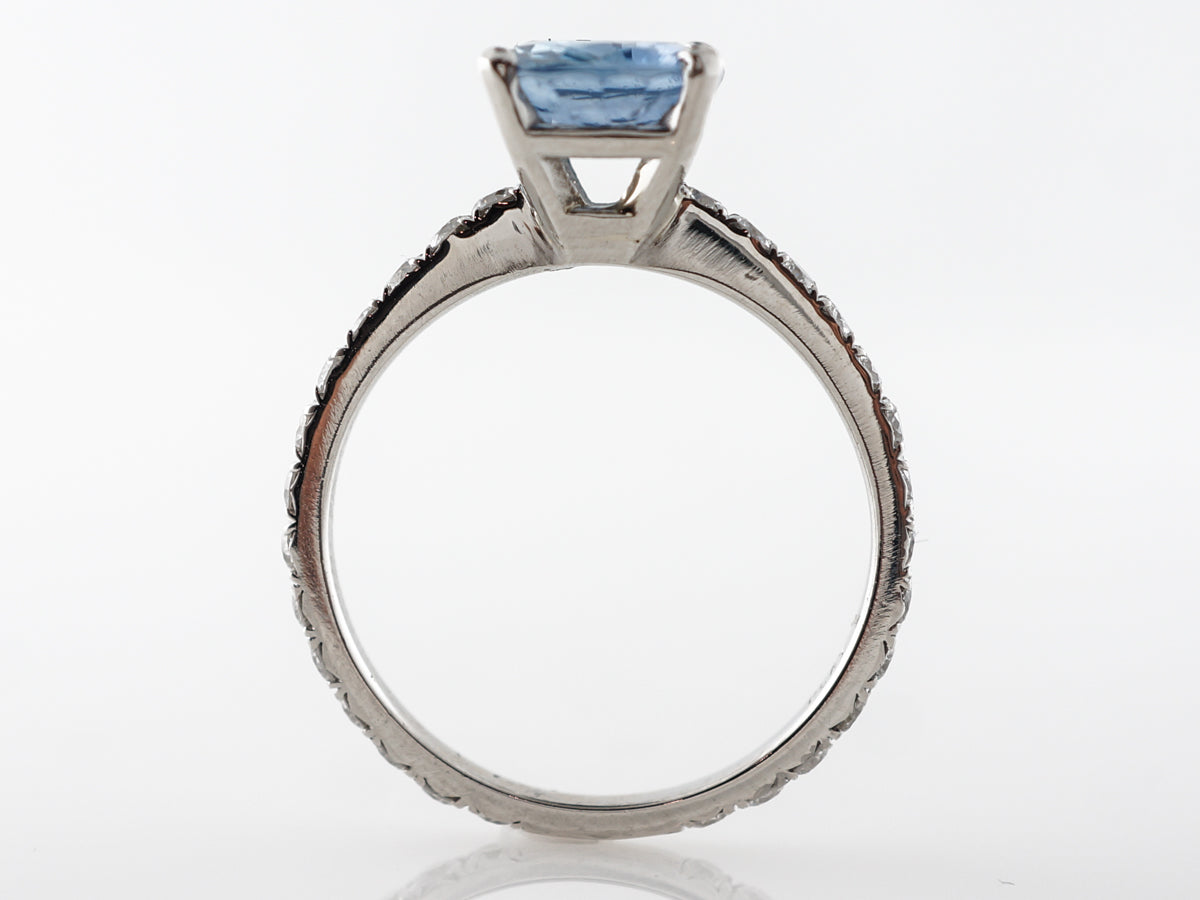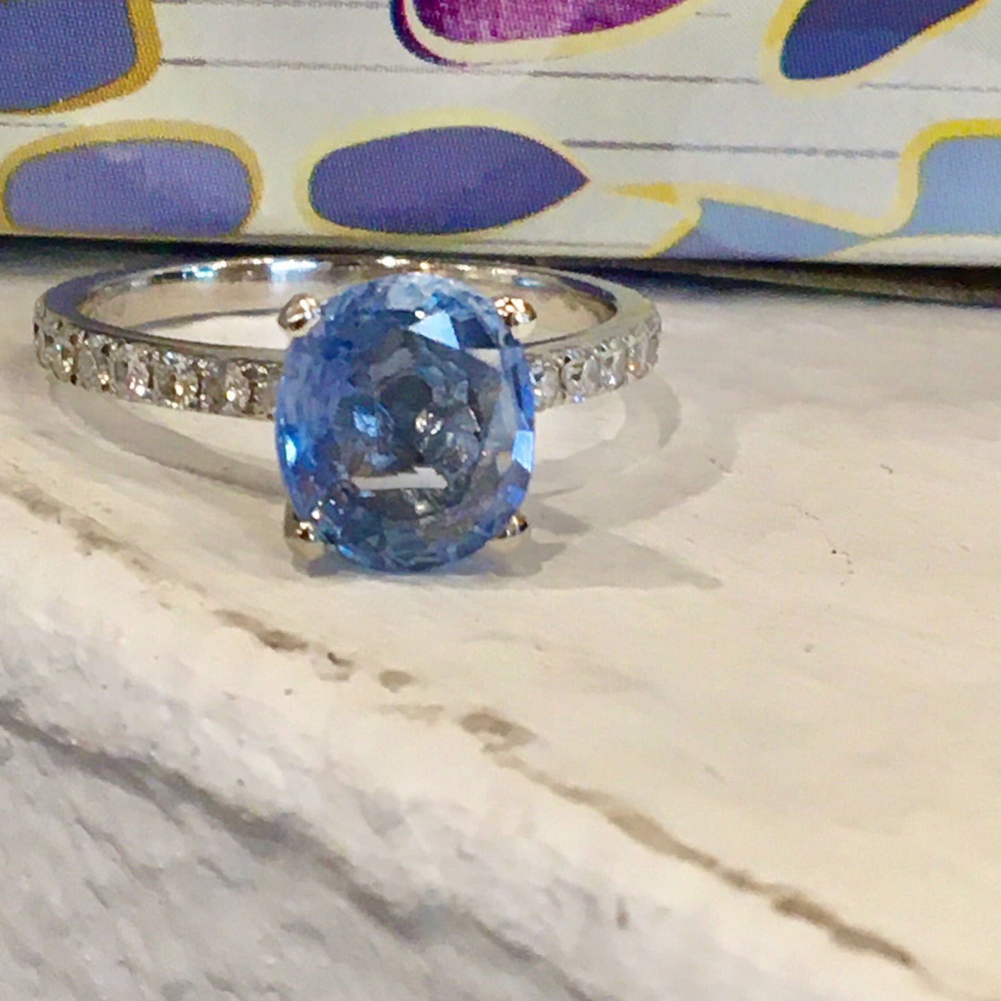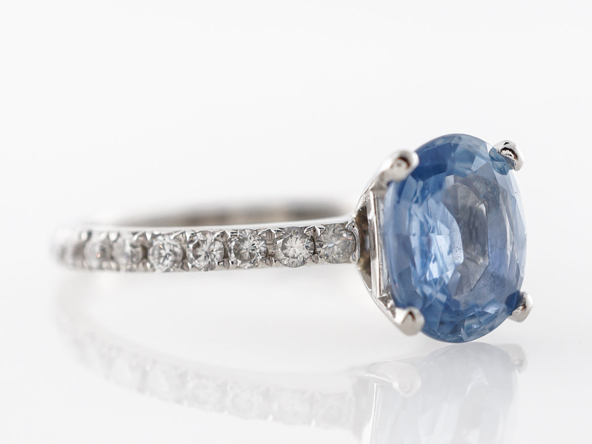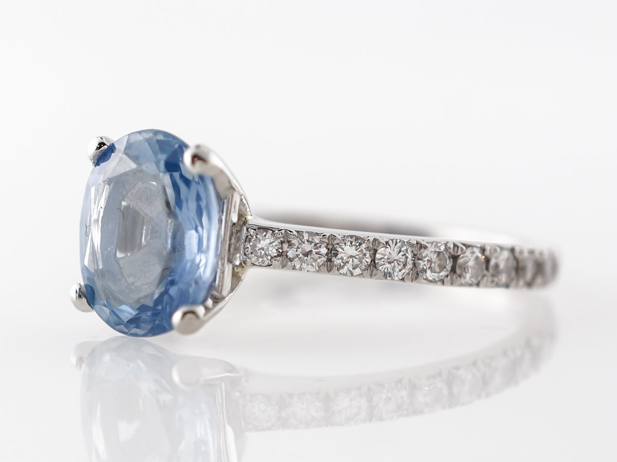 2.25 Carat Oval Sapphire Engagement Ring in Platinum. This gorgeous modern engagement ring features a 2.25 carat oval cut sapphire and is finished in platinum. The sapphire has a lovely sky blue color that is accented by .75 carats of diamonds up the shoulders. This classy design features sparkle and gorgeous contrast of color to create a very special look.