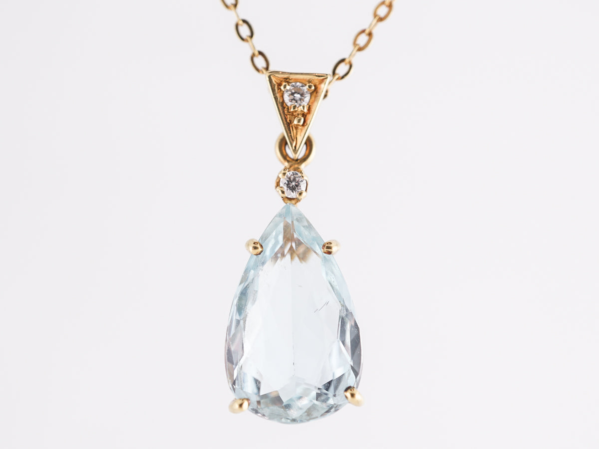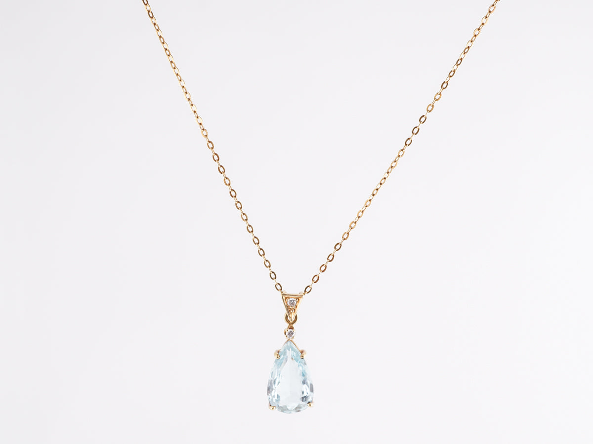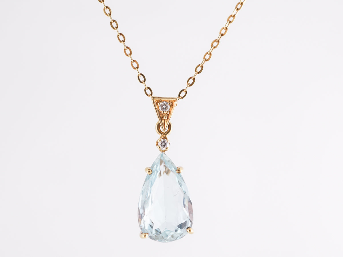 2.26 Pear Aquamarine Necklace in 18K Yellow Gold. This pear cut aquamarine necklace features an icy, pale blue natural aquamarine weighing 2.26ct. Set in four (4) prongs, the top of the pear-shaped aquamarine is accented with two (2) .02ct genuine natural diamonds. The chain of this necklace is 14k yellow gold and the mounting is made of 18k yellow gold. This necklace measures 16” in length. Come see this stunning piece in our showroom or order online before its gone!