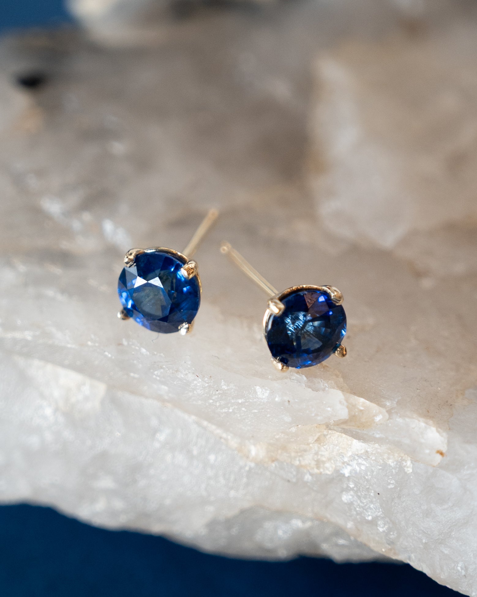 Sapphires in this carat weight range deliver substantial presence and rich color saturation without excessive size. Each sapphire sits in a four-prong basket setting that holds the stone securely while allowing light to enter from the sides and bottom, enhancing the gem's natural glow. The yellow gold setting adds warmth that complements the cool blue tones of the sapphires when worn. The round shape and modest profile make these earrings comfortable for all-day wear while providing bold color at the ears.