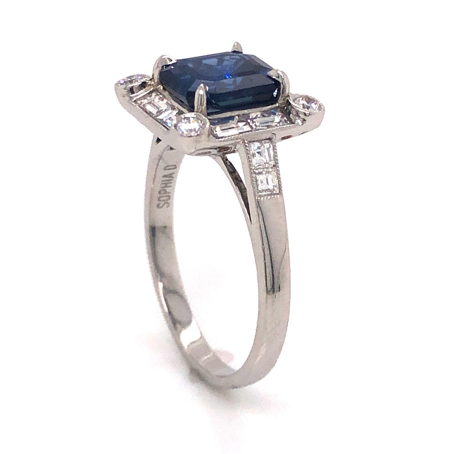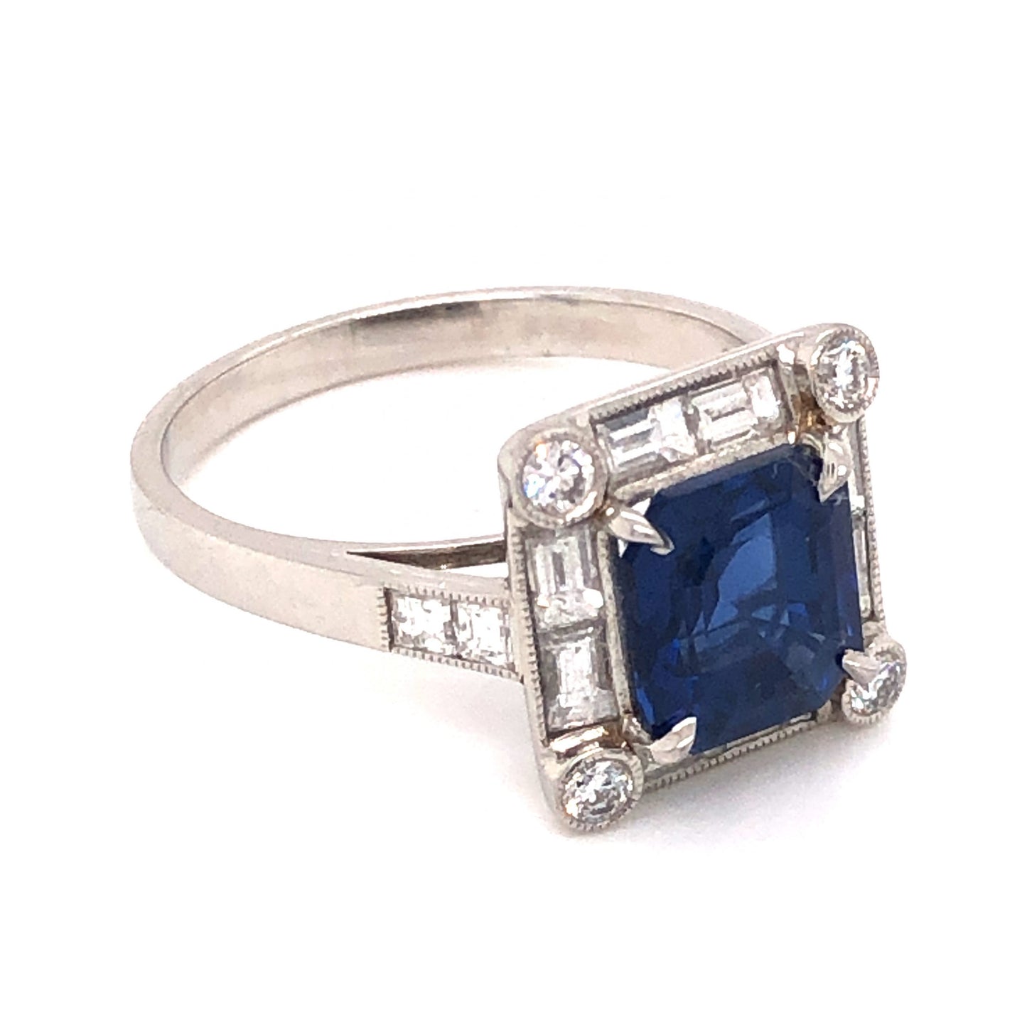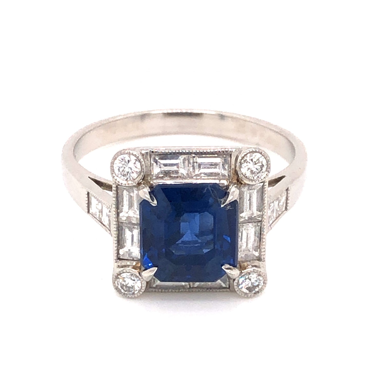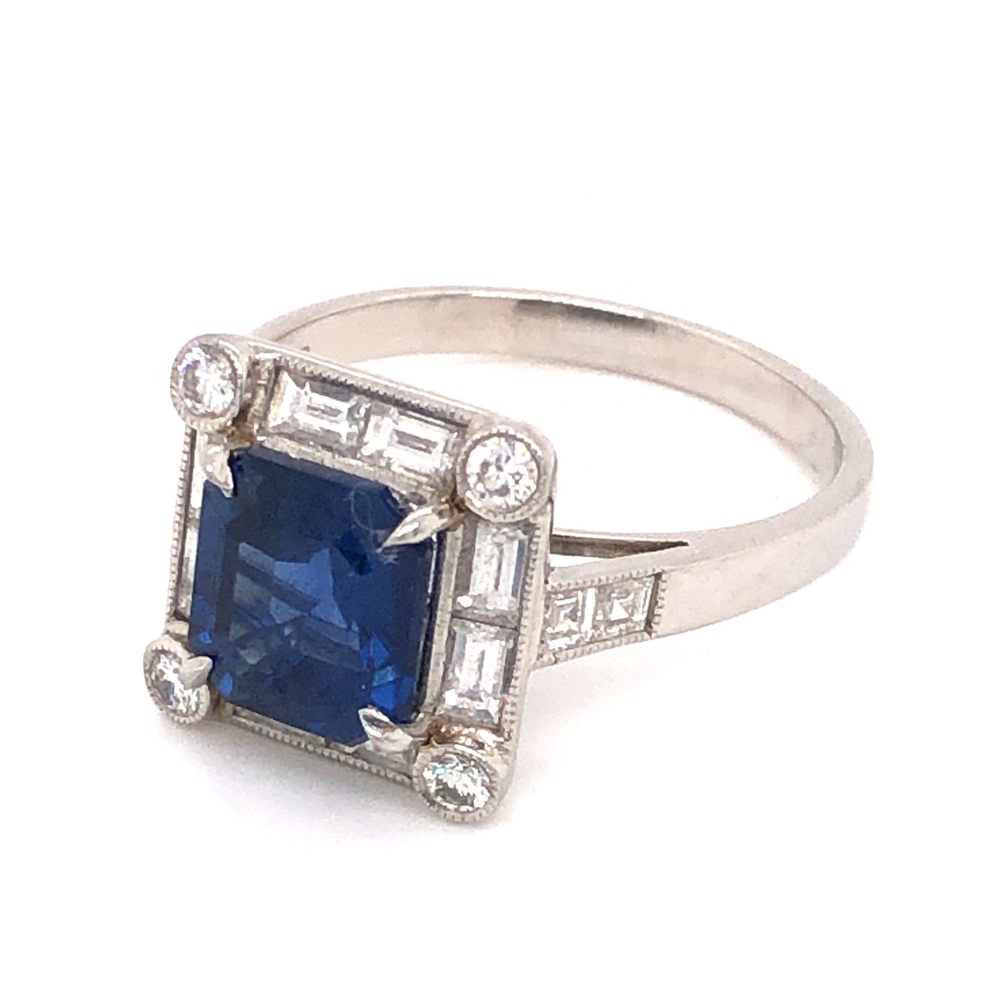 2.35 Sapphire Diamond Engagement Ring in Platinum. This modern engagement ring features a 2.35 carat blue sapphire and .76 carats of near colorless diamonds finished in polished platinum. The center sapphire has a deep blue hue and is set in four (4) platinum prongs. The rich blue sapphire is accented by eight (8) .06 carat baguette diamonds and four (4) .04 round cut diamonds. The square wreath of baguettes and round cut diamonds give the mounting of the ring a structured, geometric look. On the shoulders of the band, four (4) .03 carat diamonds bring even more sparkle to the center stones. The platinum band is complete with soft milgrain engravings, giving a fine texture to this elegant engagement ring!