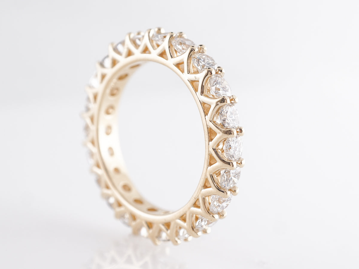 2.42 Carat Diamond Eternity Band in 14k Yellow Gold. This modern eternity wedding band features 2.42 carats of round brilliant cut diamonds. Twenty-two (22) diamonds are in a shared prong setting around the entirety of the band, allowing for maximum brilliance from every angle. Finished in 14 karat yellow gold, this versatile band could serve as a wedding band, engagement ring, or even a right hand ring.