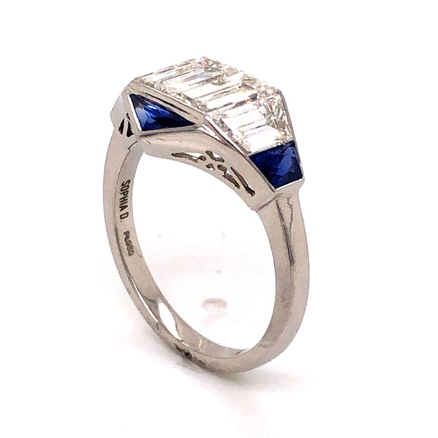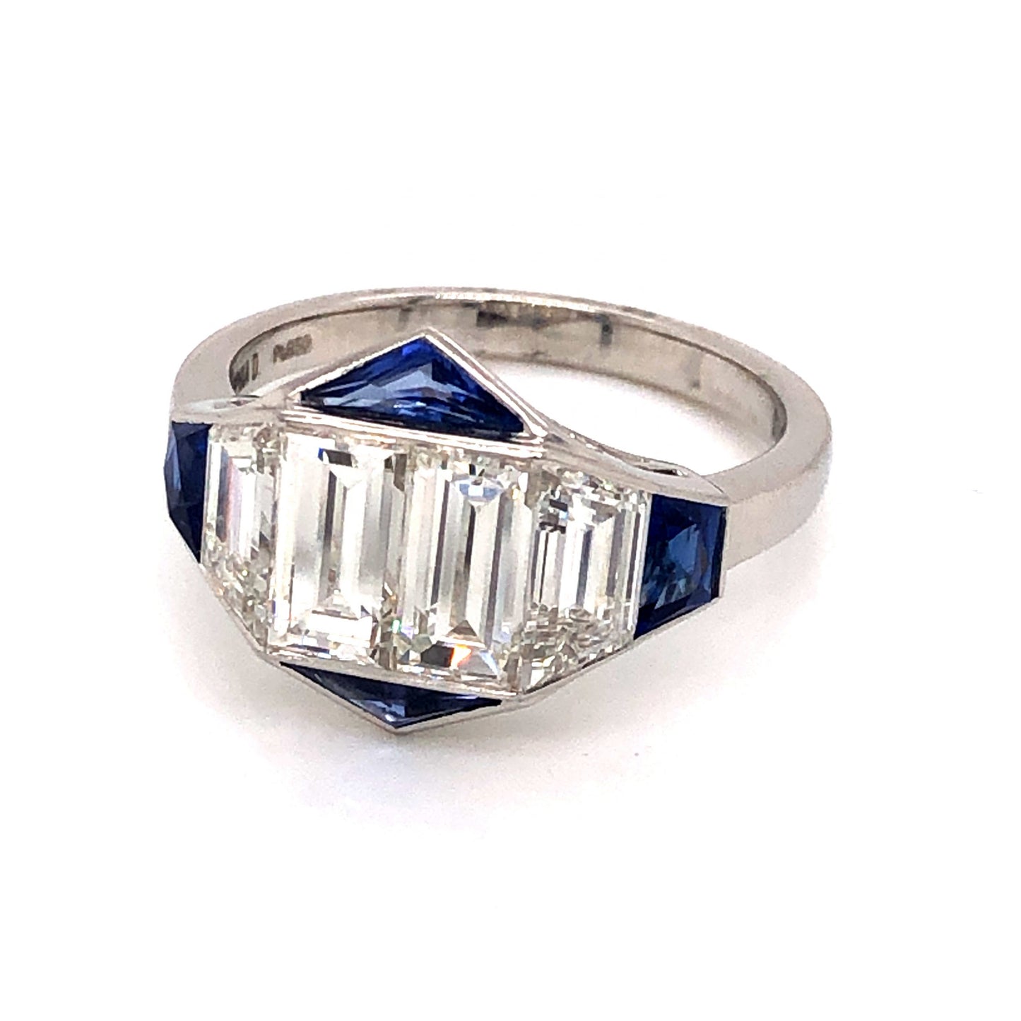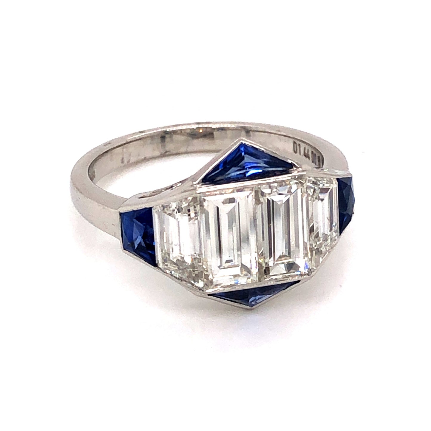 2.42 Diamond Sapphire Cocktail Ring in Platinum. This one of a kind ring features 2.42 carats of diamonds and .72 carats of blue sapphires finished in platinum. Two (2) .72 carat near colorless diamonds are channel set at the head of the ring. The primary diamonds are flanked by two (2) .49 carat accent diamonds. At the cardinal points of the diamonds, two (2) .20 carat and two (2) .16 carat blue sapphires are set around the center stones. The sapphires have a rich, navy blue hue and are cut to fit inside a dynamic channel setting in platinum. From the profile, the gallery rail has a geometric openwork design, finished on a polished platinum band. The structural sapphires and elongated, sparkling diamonds showcase the craftsmanship and unique style of this modern platinum ring!