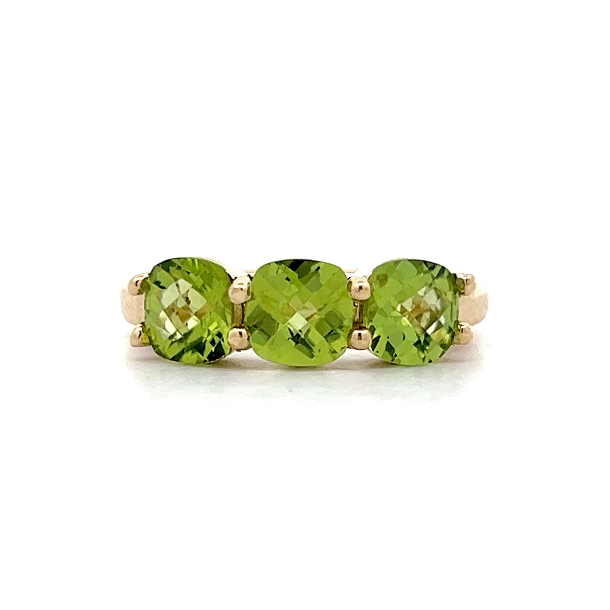 This stacking ring features a 2.43 carat cushion-cut peridot with checkerboard faceting that enhances its vibrant green color. Set in polished 14 karat yellow gold, the ring showcases a three-stone design. The peridot's are prong-set to allow maximum light to enhance their natural beauty. Whether worn alone or with other rings, this fun ring adds a bright touch of color to any outfit.