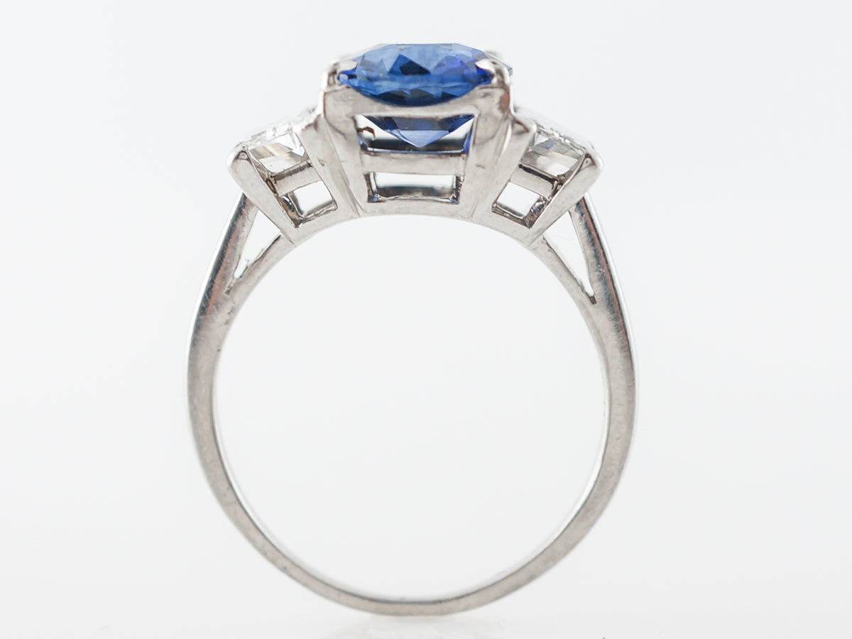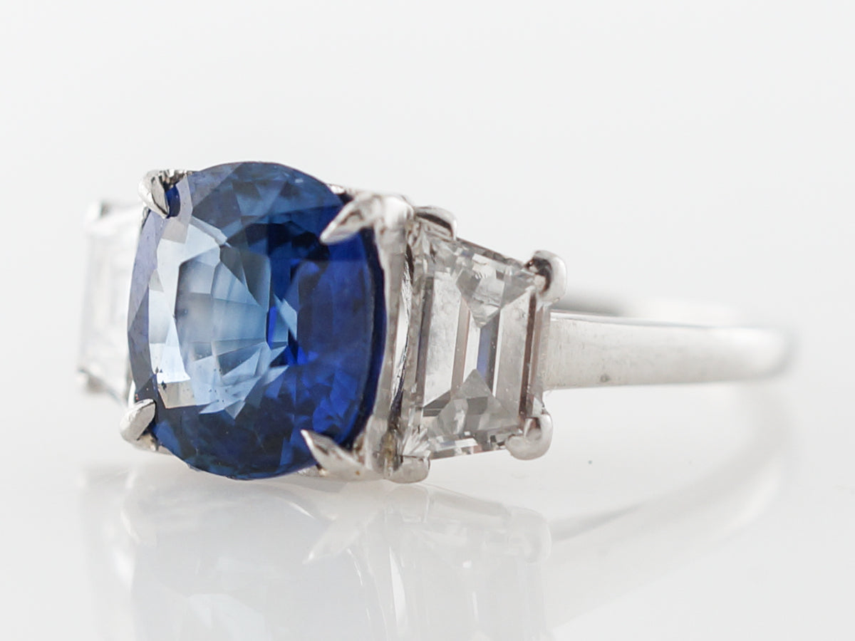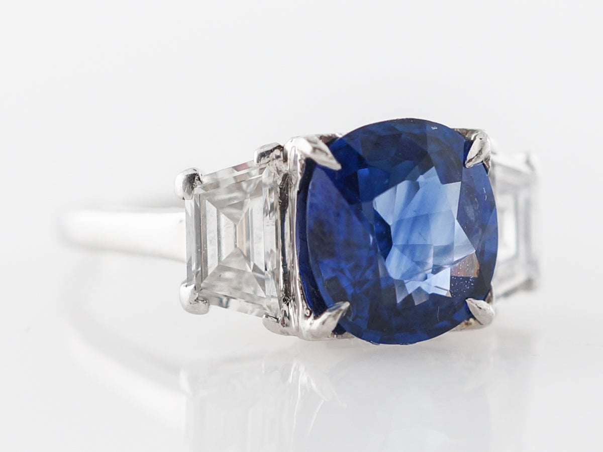 2.5 Carat Cushion Cut Sapphire Engagement Ring in Platinum. This Modern cushion cut sapphire ring features a royal blue 2.51 carat sapphire with great saturation. The sapphire is accented with large step cut trapezoid diamonds in platinum. The total diamond weight is .91 carats. This classic ring is perfect for a right hand ring or an engagement ring.