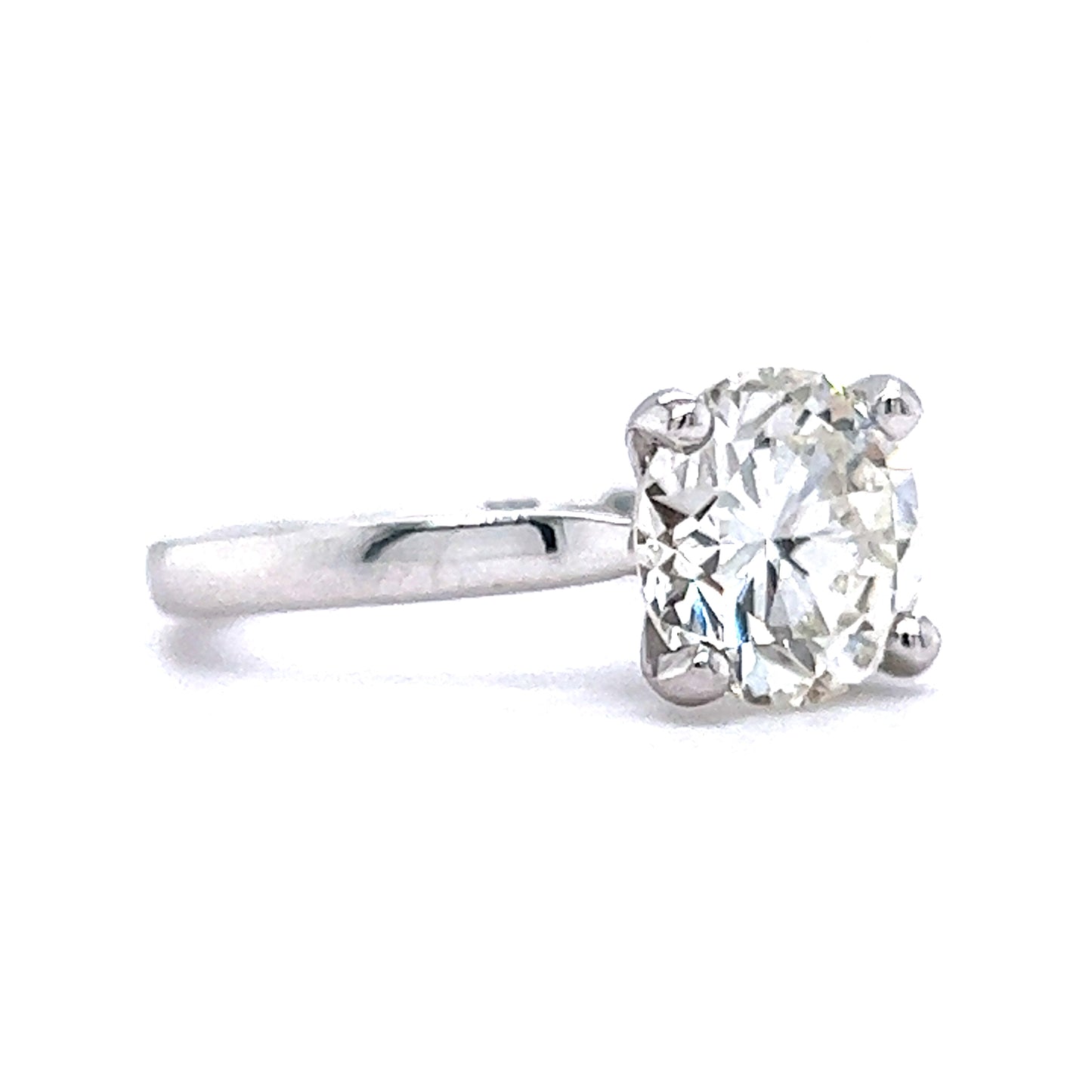 This dreamy solitaire engagement ring features a GIA-certified 2.55 carat Round Brilliant cut diamond finished in 14 karat white gold. The center diamond is eye clean and near colorless, with facets that allow for the maximum amount of brilliance and fire. The diamond is set cathedral style, with four white gold prongs. Finished on a polished 14 karat white gold band, this modern engagement ring is a timeless beauty.