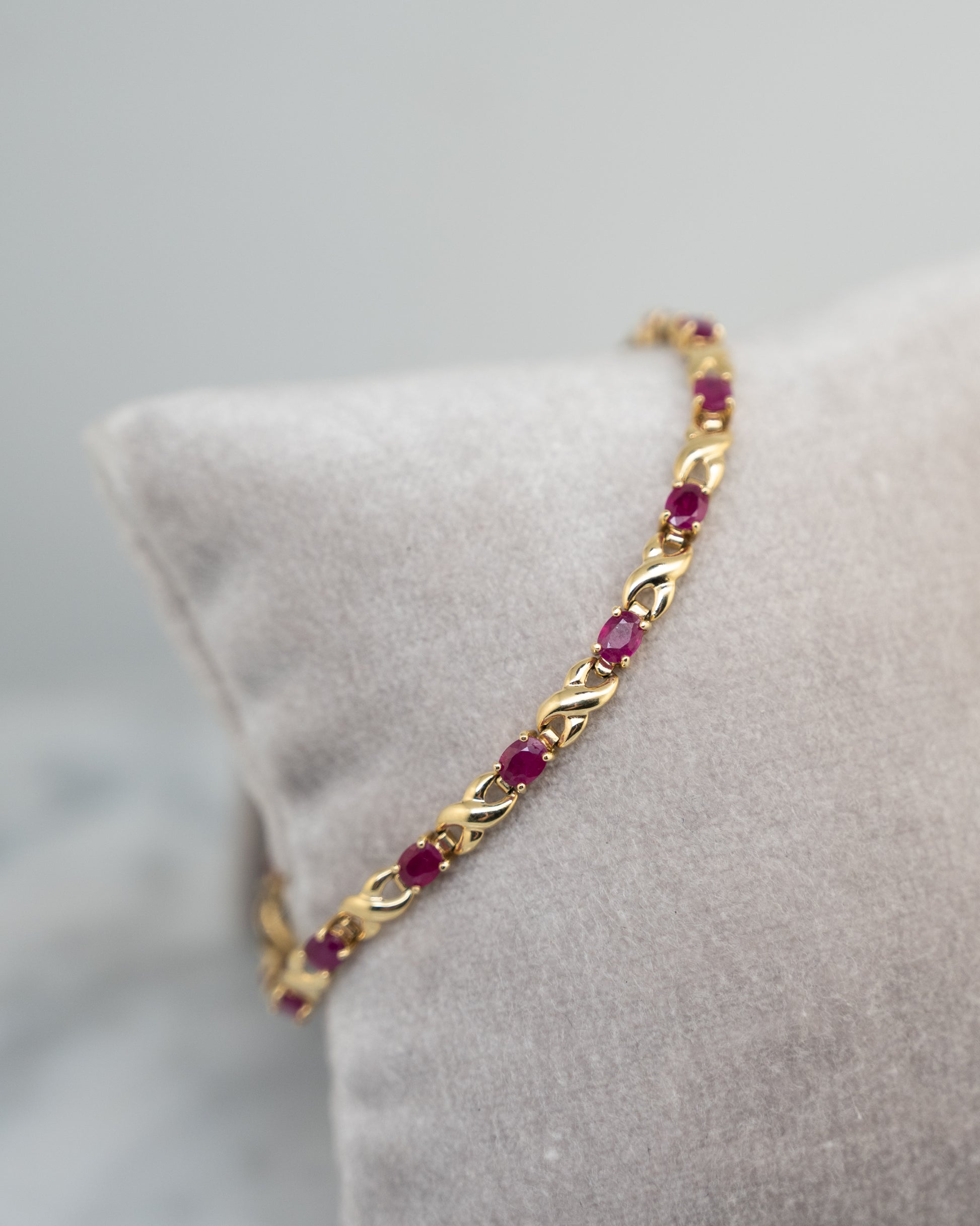 This 14 karat yellow gold chain bracelet features oval cut rubies with a total carat weight of 2.55, all set in prong settings. The design consists of infinity gold links connected together, giving the bracelet a flowing appearance. A secure locking clasp keeps the bracelet safely on the wrist for both daily wear and special events. The deep red rubies create a bold color contrast against the warm yellow gold background. The combination of the infinity link pattern with the rich color of the rubies makes this a noticeable piece that works well as either a personal purchase or a gift.