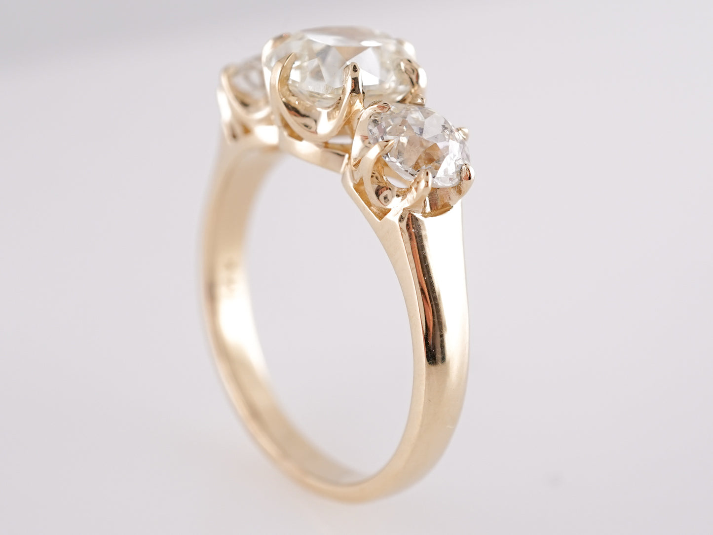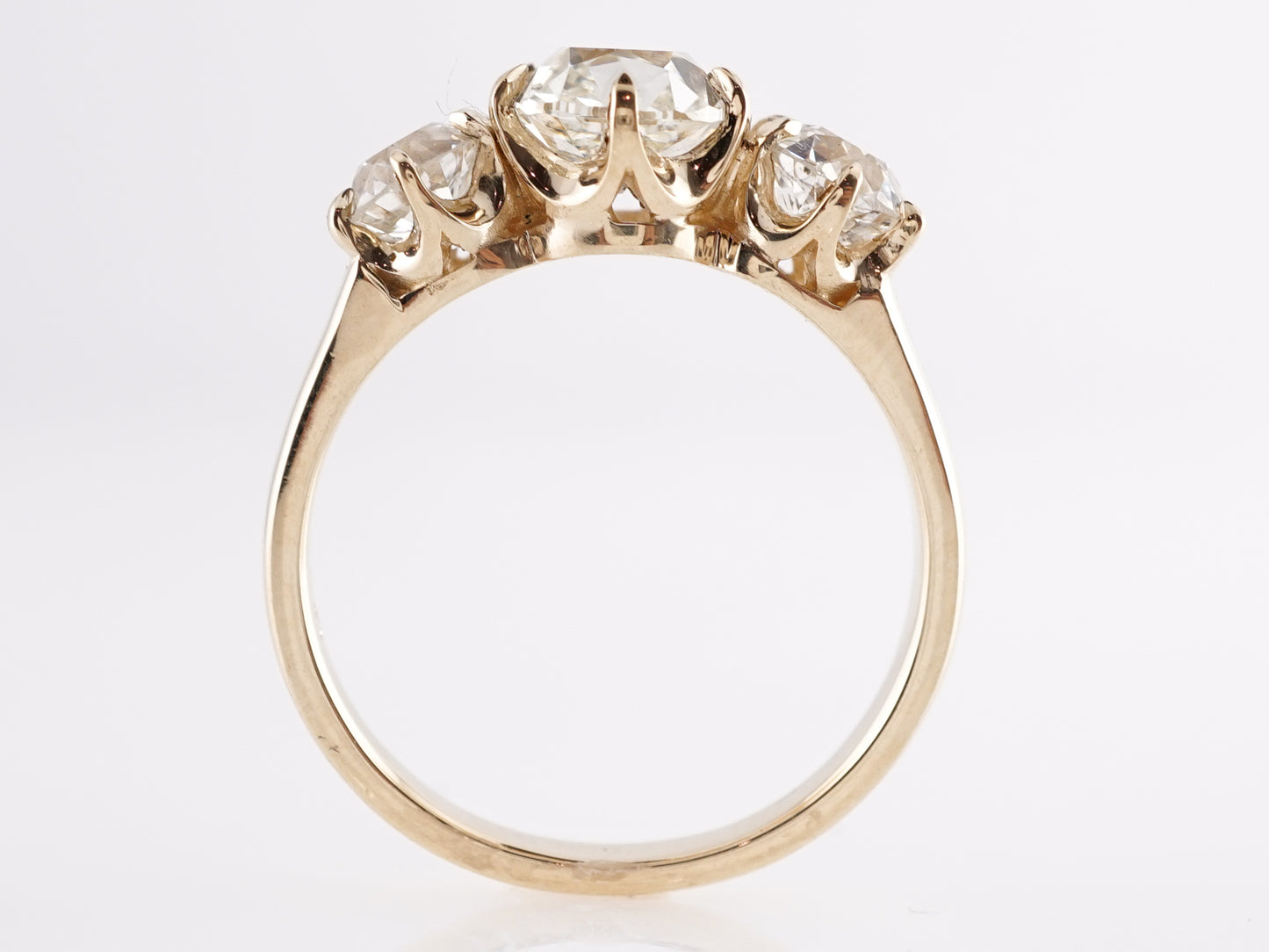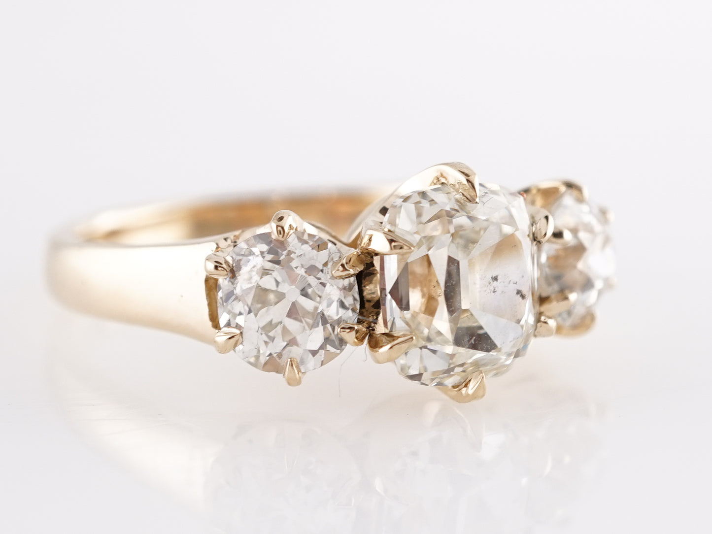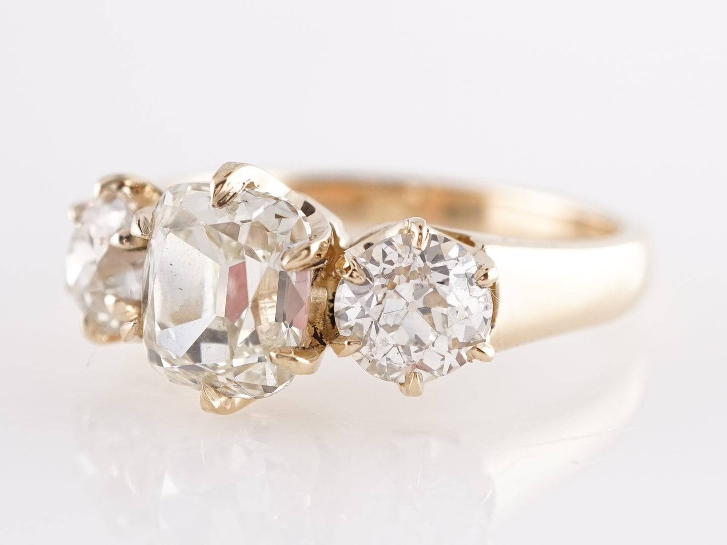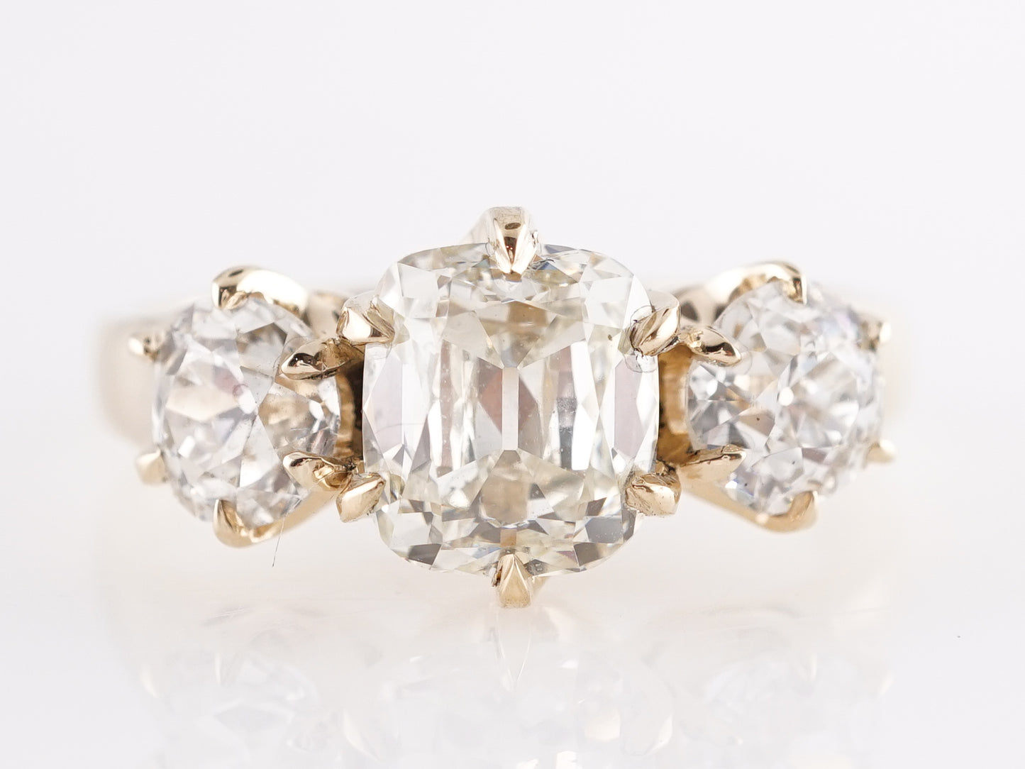 2.56 Three Stone Diamond Engagement Ring 14k Yellow Gold. This modern, three stone engagement ring features 2.56 carats of natural diamonds in 14k yellow gold. The GIA-certified, Old Mine Cut center diamond has thicker facets that will allow this stone to glitter even in romantic candlelight. The center stone has a faint champagne hue that brings a subtle dimension to the near colorless accent stones. Two accent diamonds rest on either side of the primary stone, weighing in at .54 carats and .52 carats. All three gemstones are prong set and have a classic style and sensibility. The 14k yellow gold band is slightly tapered and will look beautiful next to a yellow gold wedding band. This engagement ring reaches 5.49 mm above the finger and weighs a total of 3.87 grams.