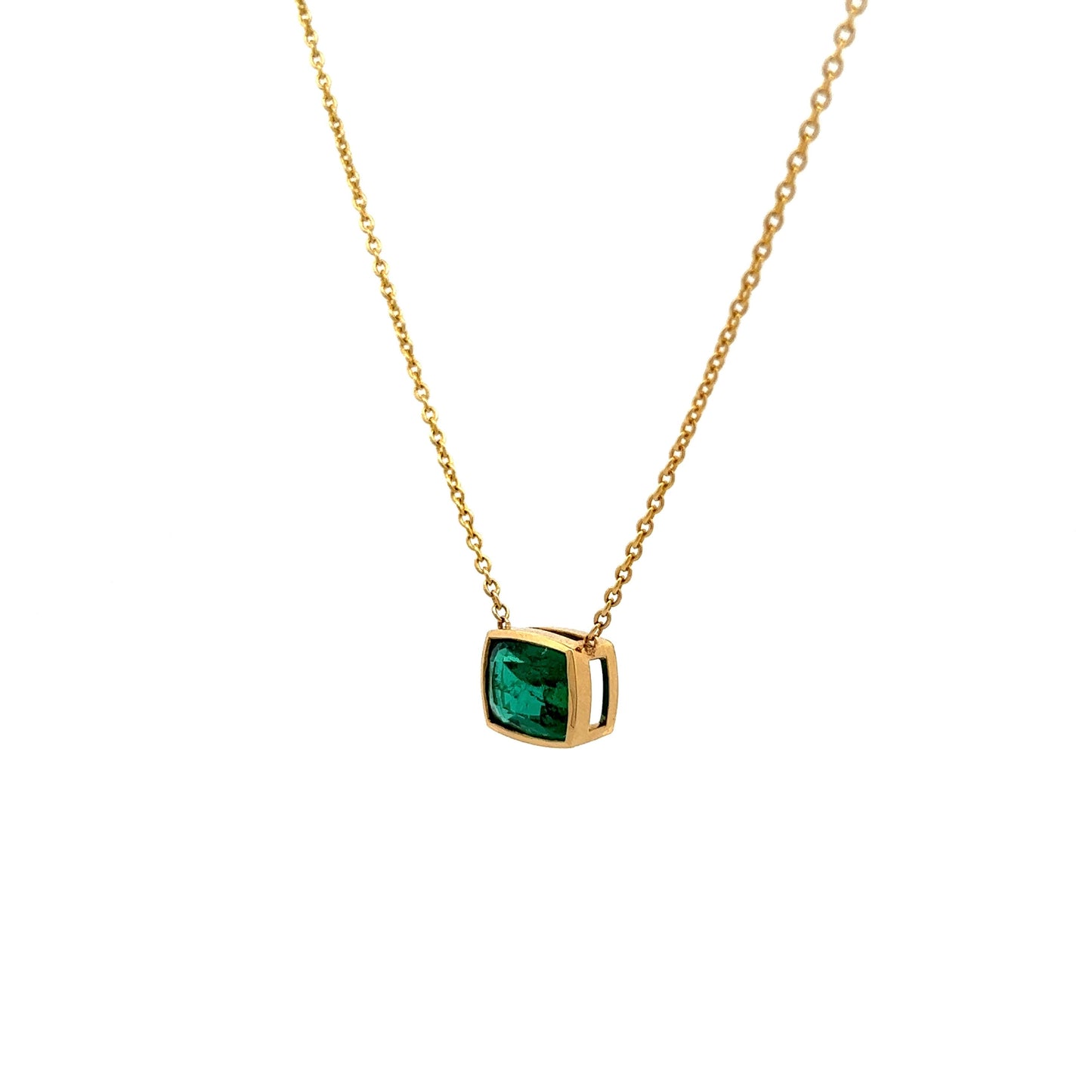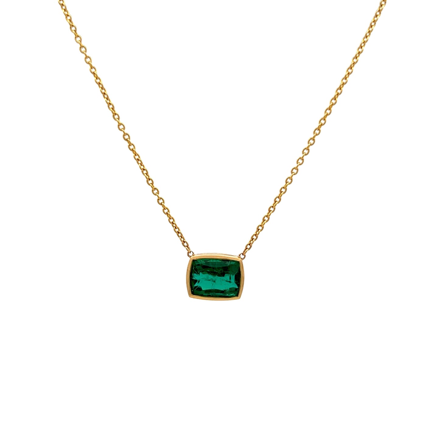 Add a pop of color to your jewelry collection with this stunning emerald pendant necklace. Crafted in 18 karat yellow gold, this necklace features a vibrant emerald cut emerald stone, weighing 2.61 carats. The emerald is bezel set, giving it a clean and contemporary look and is oriented in an east/west direction. This modern pendant necklace is perfect for adding a splash of color to any outfit and is sure to catch the eye with its sleek and stylish design.