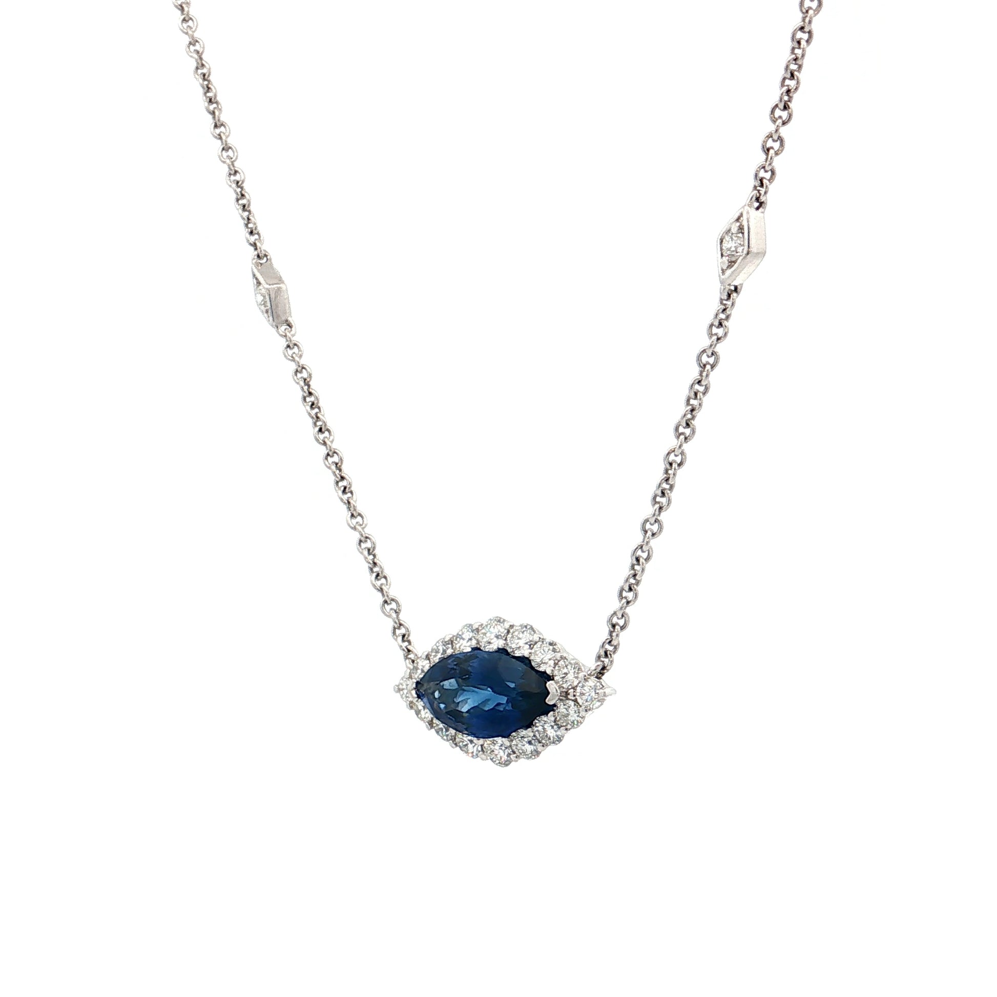 This pendant necklace features a 2.62 carat marquise cut blue sapphire measuring 13.50 x 6.20 x 4.41mm, set in 18 karat white gold with a prong setting. The marquise cut creates a football-shaped stone with pointed ends and brilliant-style facets that maximize the sapphire's deep blue color while creating an elongated, eye-catching profile.