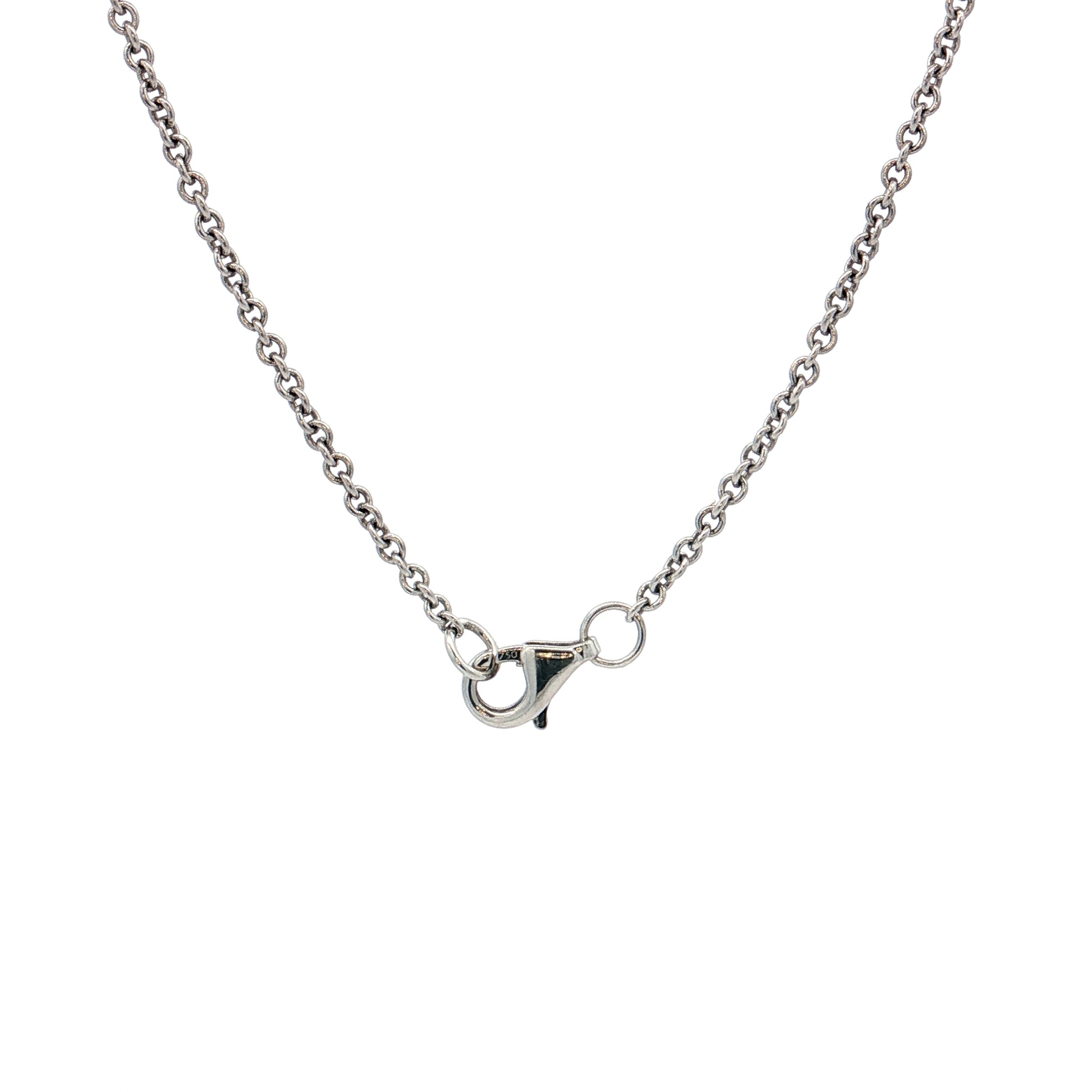Round brilliant cut diamonds totaling .80 carats form a halo around the sapphire, their facets producing maximum sparkle that contrasts with the sapphire's rich color. Two additional diamonds at 2.75mm and .08 carats each are set along the 16-inch chain, adding sparkle near the neckline. The white gold setting keeps the metal bright and neutral, allowing the blue sapphire to stand out without competing warmth from yellow gold.