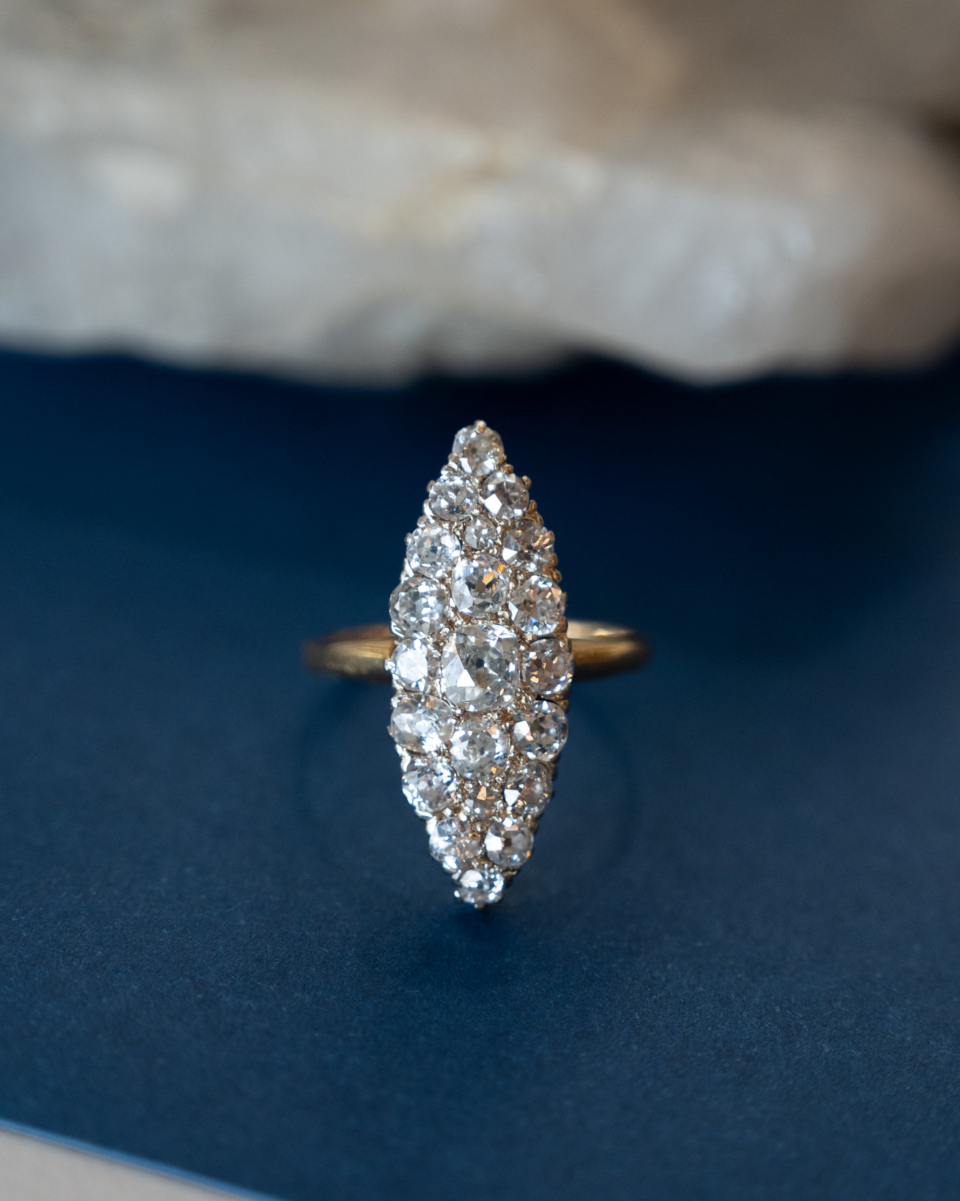 The navette or marquise shape creates an elongated profile across the finger, and the pavé-set accent diamonds—each measuring 3.5mm—create continuous sparkle around the cluster. The yellow gold body with white gold prongs frames the diamonds in bright metal while adding warmth to the overall design.