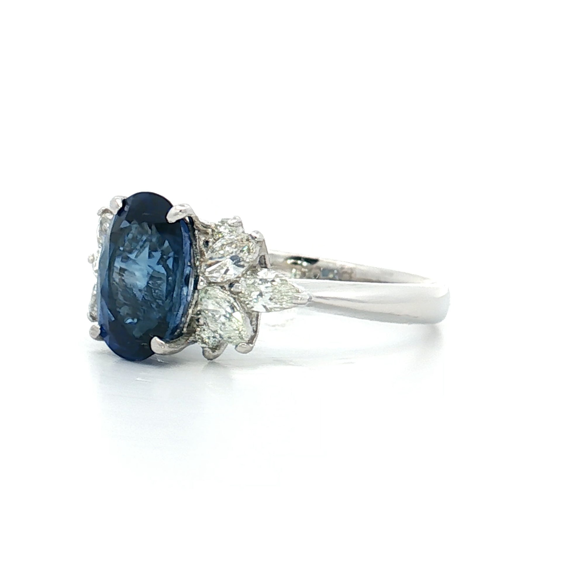 This engagement ring centers on a 2.70 carat oval cut blue sapphire held by four prongs, displaying deep blue color. The sapphire is flanked by diamond clusters featuring both pear and round brilliant cuts totaling .60 carats in H/I color and VS2 clarity. The accent diamonds include four stones measuring 3.75 x 2.00 mm (.08 carats each) and two measuring 4.00 x 2.00 mm (.11 carats each). Set in platinum, this ring offers durability while highlighting both the sapphire's rich blue hue and the diamonds' brilliance.