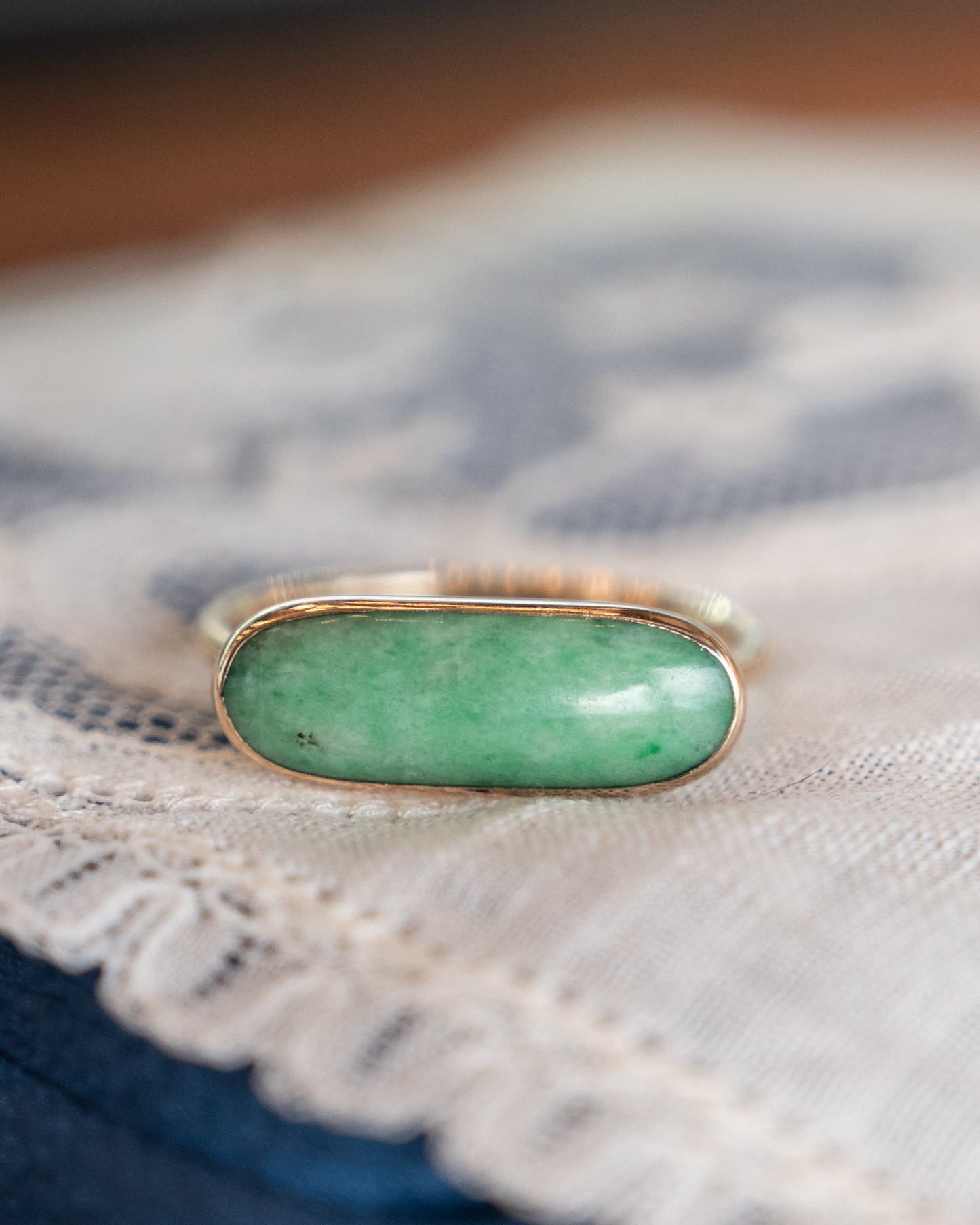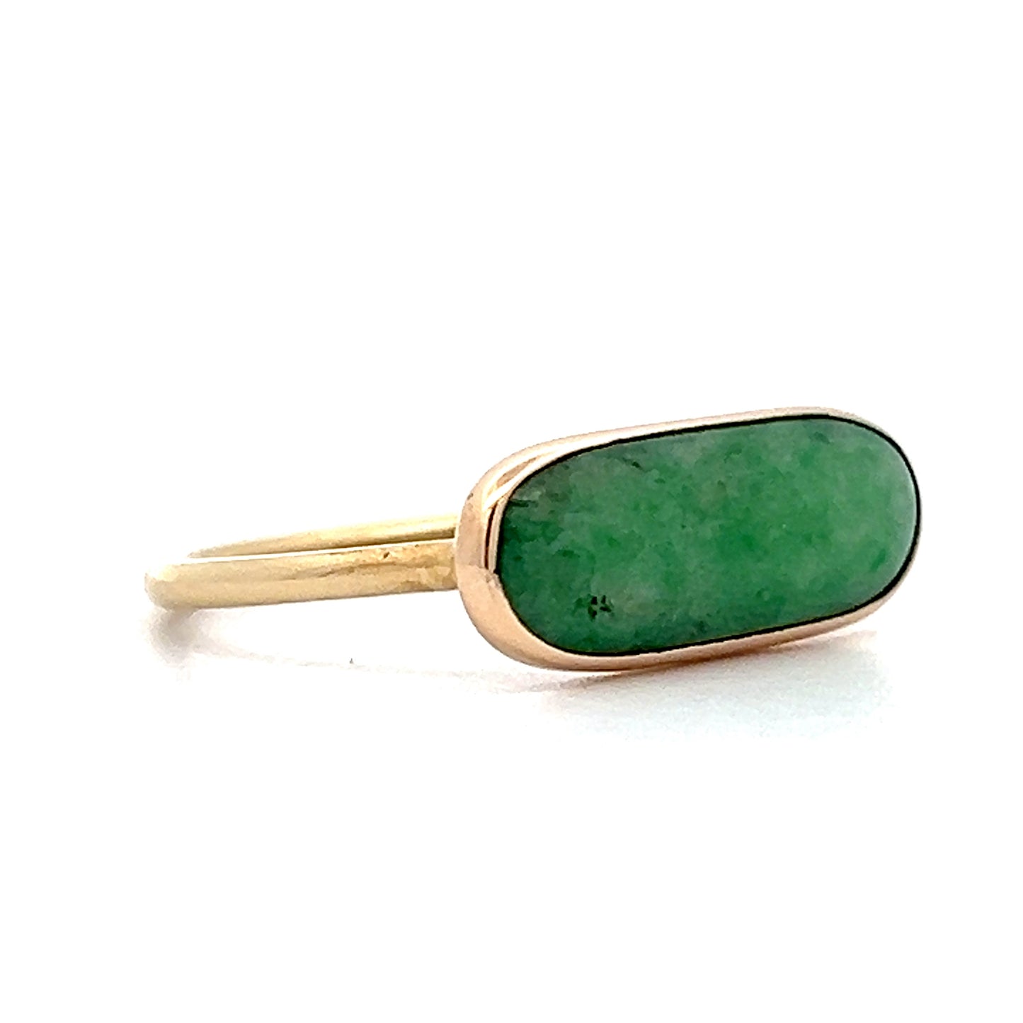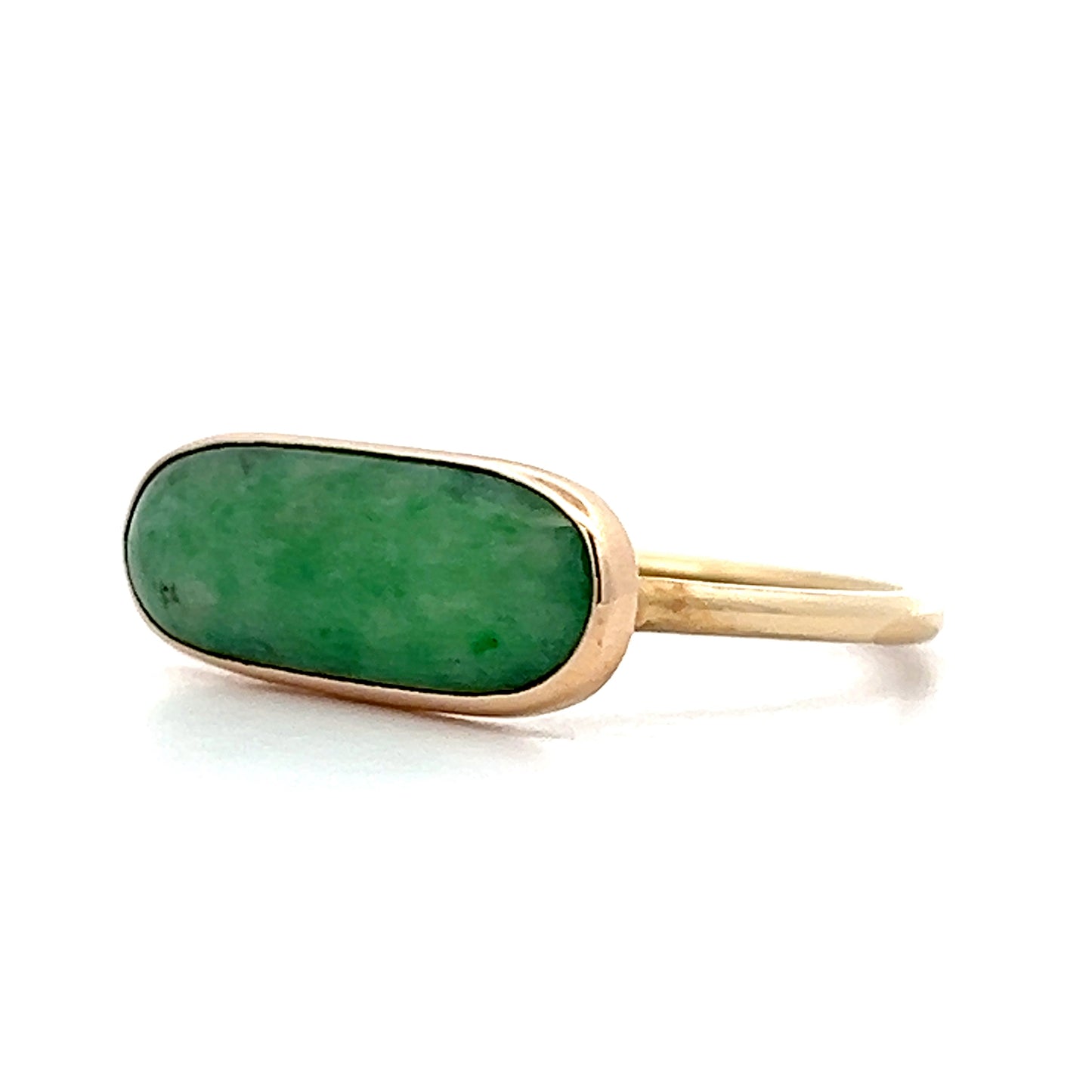 This stacking ring holds an elongated oval cabochon cut jadeite that weighs 2.74 carats and is set in a 10-karat yellow gold bezel. The jadeite is positioned east/west (horizontally) on the ring and shows off its natural green color against the gold setting. The band itself is made from 14 karat yellow gold and measures just 1.4mm thick, making it slim and easy to pair with other rings.