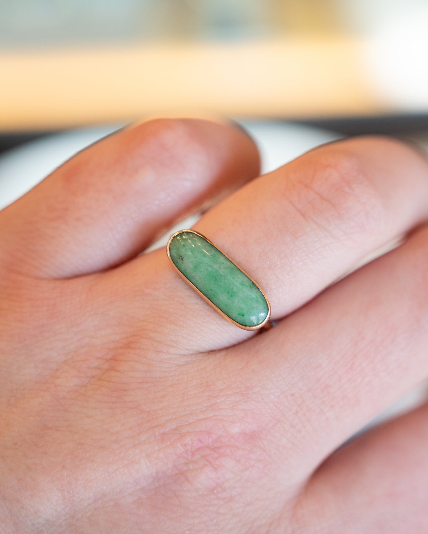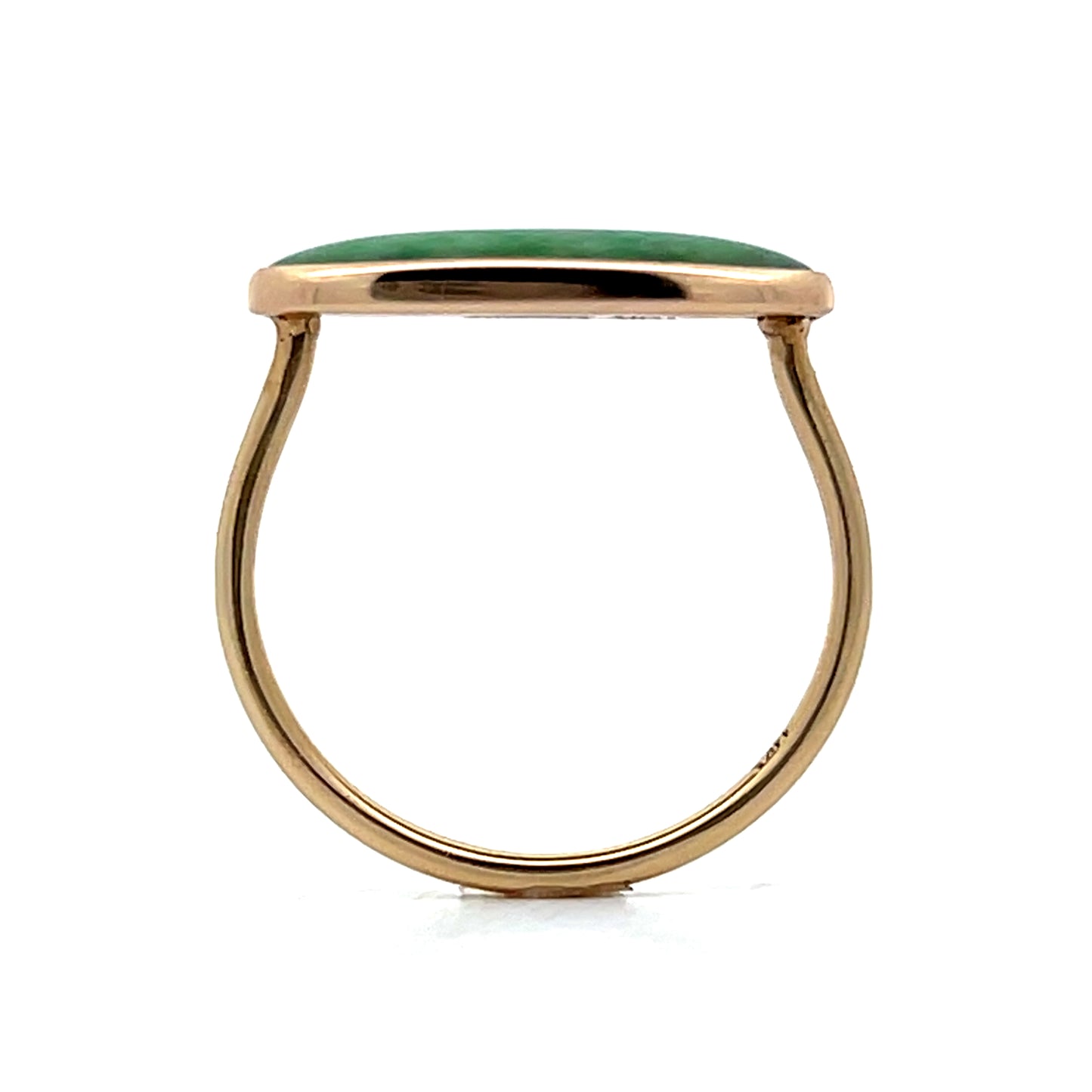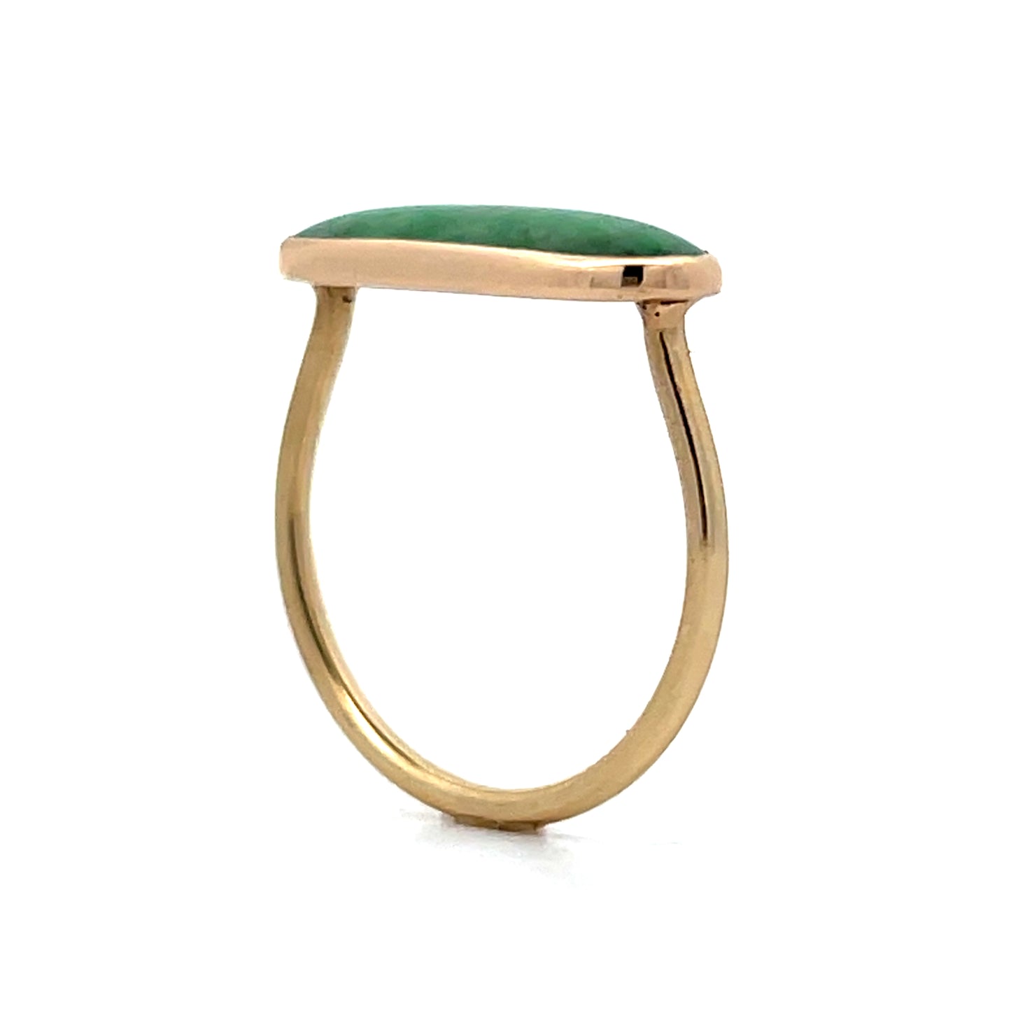 This stacking ring holds an elongated oval cabochon cut jadeite that weighs 2.74 carats and is set in a 10-karat yellow gold bezel. The jadeite is positioned east/west (horizontally) on the ring and shows off its natural green color against the gold setting. The band itself is made from 14 karat yellow gold and measures just 1.4mm thick, making it slim and easy to pair with other rings.