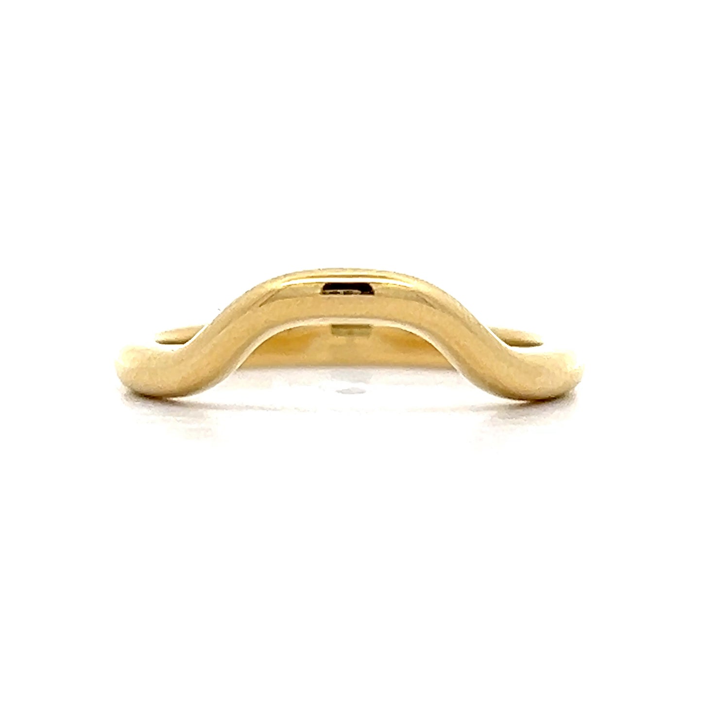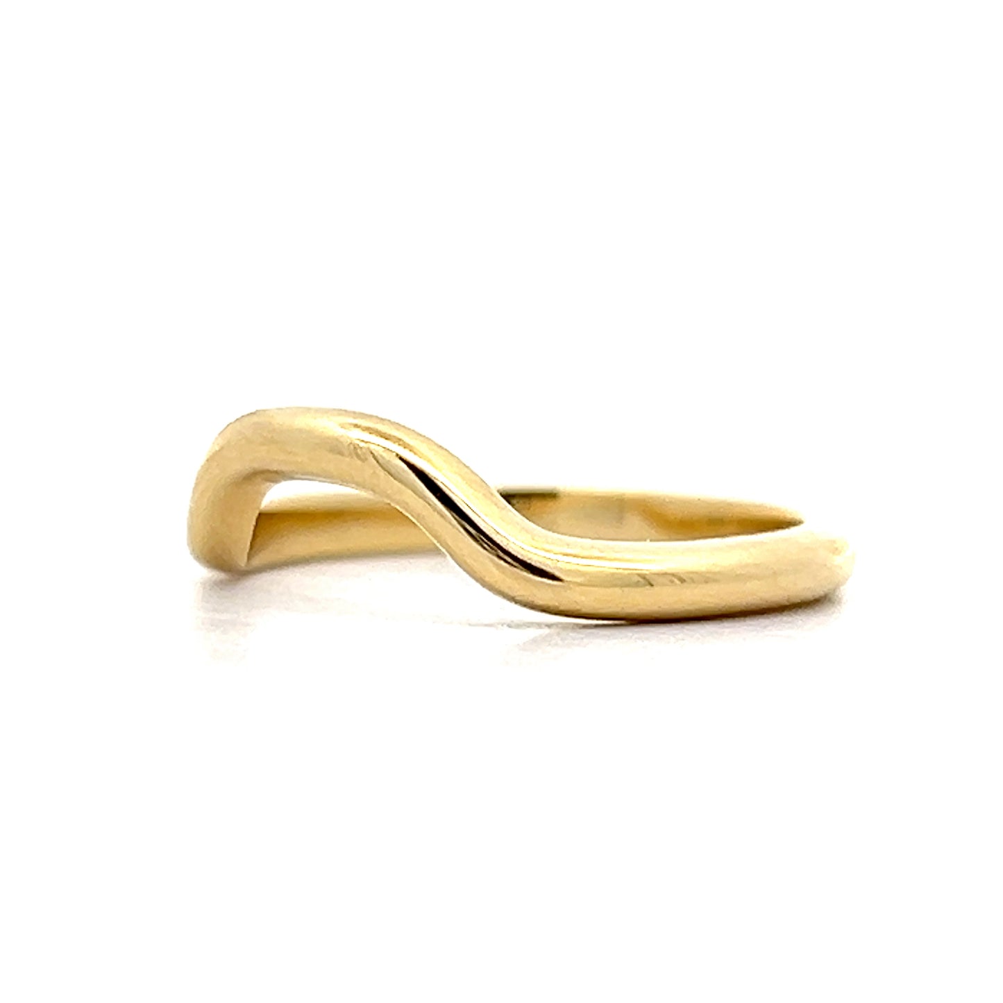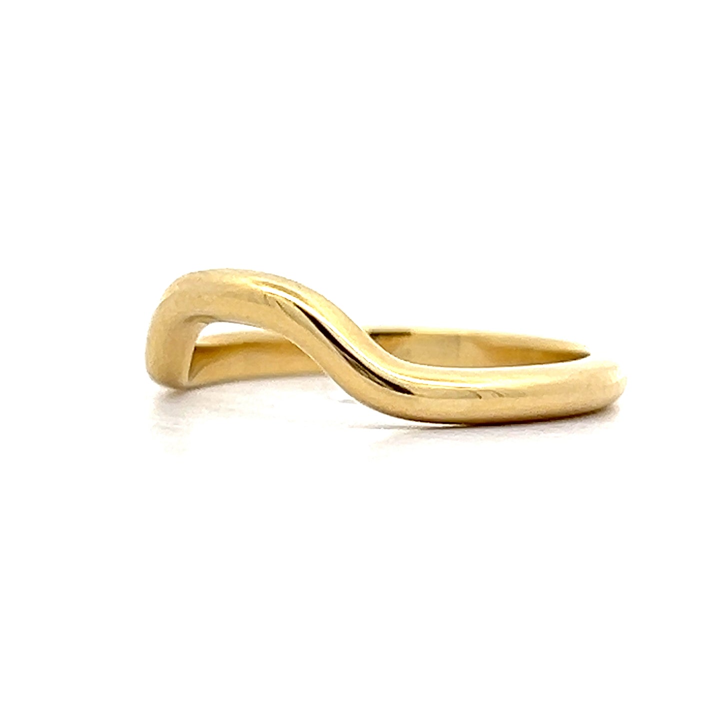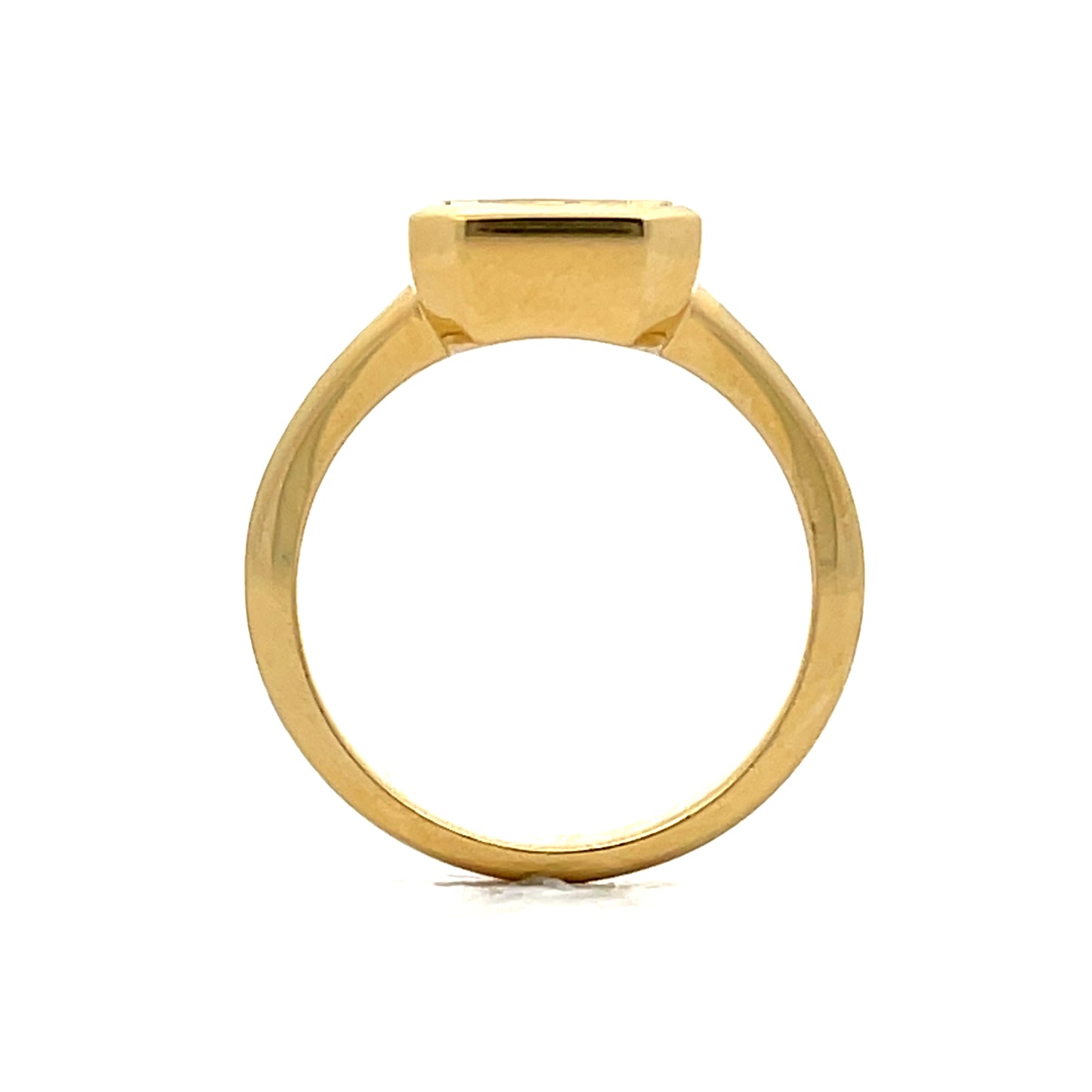 This engagement set is crafted in 18 karat yellow gold and features a 2.75 carat Asscher cut champagne diamond with VS2 clarity. The diamond is secured in a bezel, highlighting its geometric shape. The set includes two matching curved wedding bands designed to frame the engagement ring. The bands follow the contour of the center setting for a seamless fit.