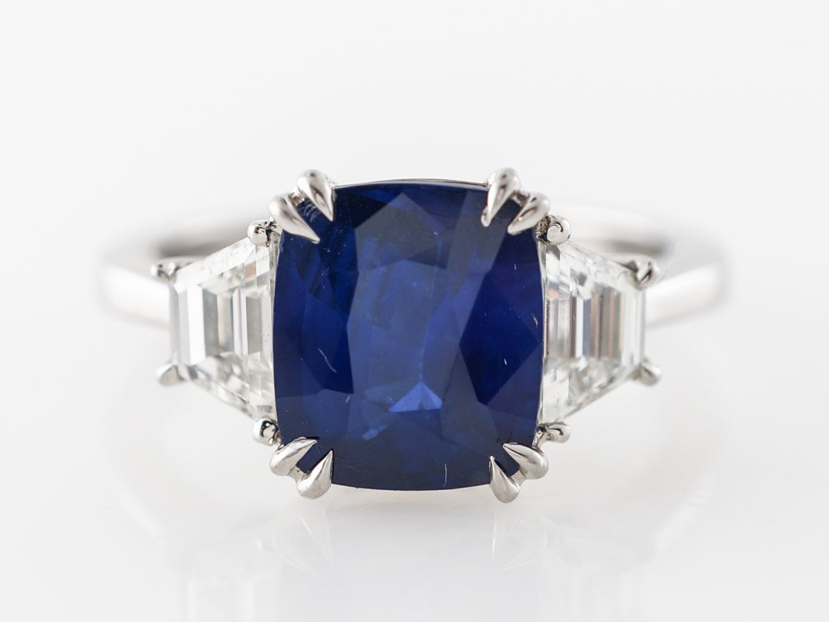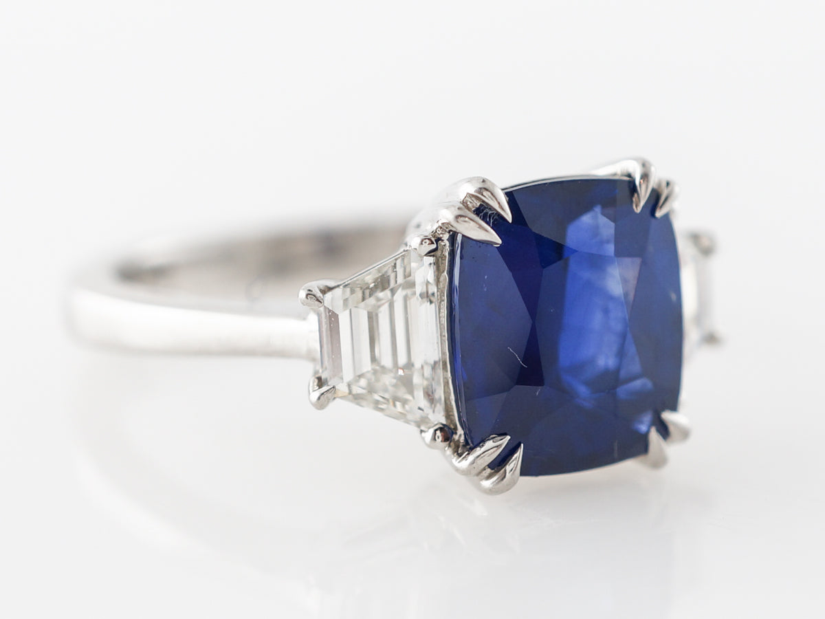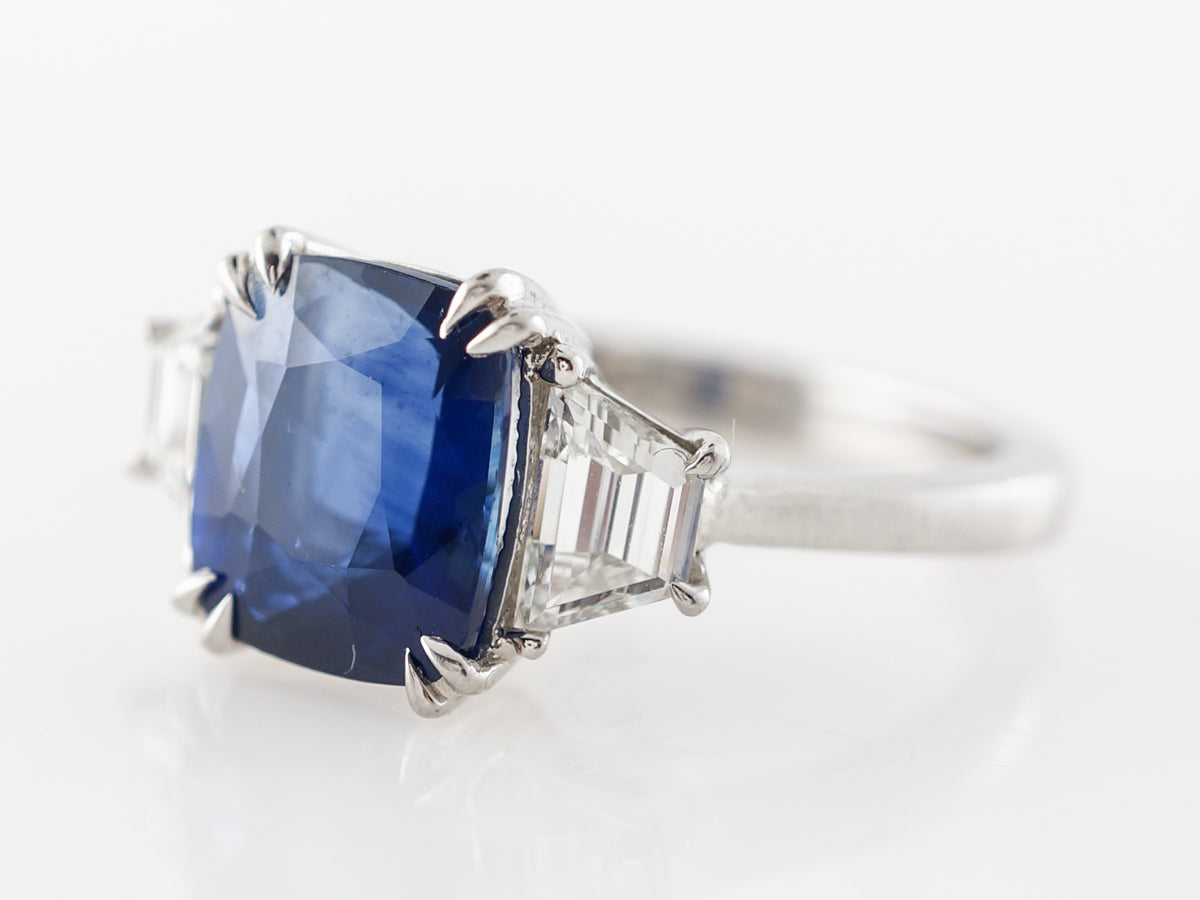 2.85 Carat Cushion Sapphire Engagement Ring in Platinum. This dazzling modern engagement ring features a 2.85 carat cushion cut sapphire with trapezoid shaped diamond accents weighing .80 carats and is set in platinum. The stunning sapphire has a dark cobalt color which stands out even more due contrast with the bright high polish of the double prongs. The lines of the trapezoid diamonds run perfectly into the edges of the cushion cut sapphire and create a very smooth profile from the top view.
