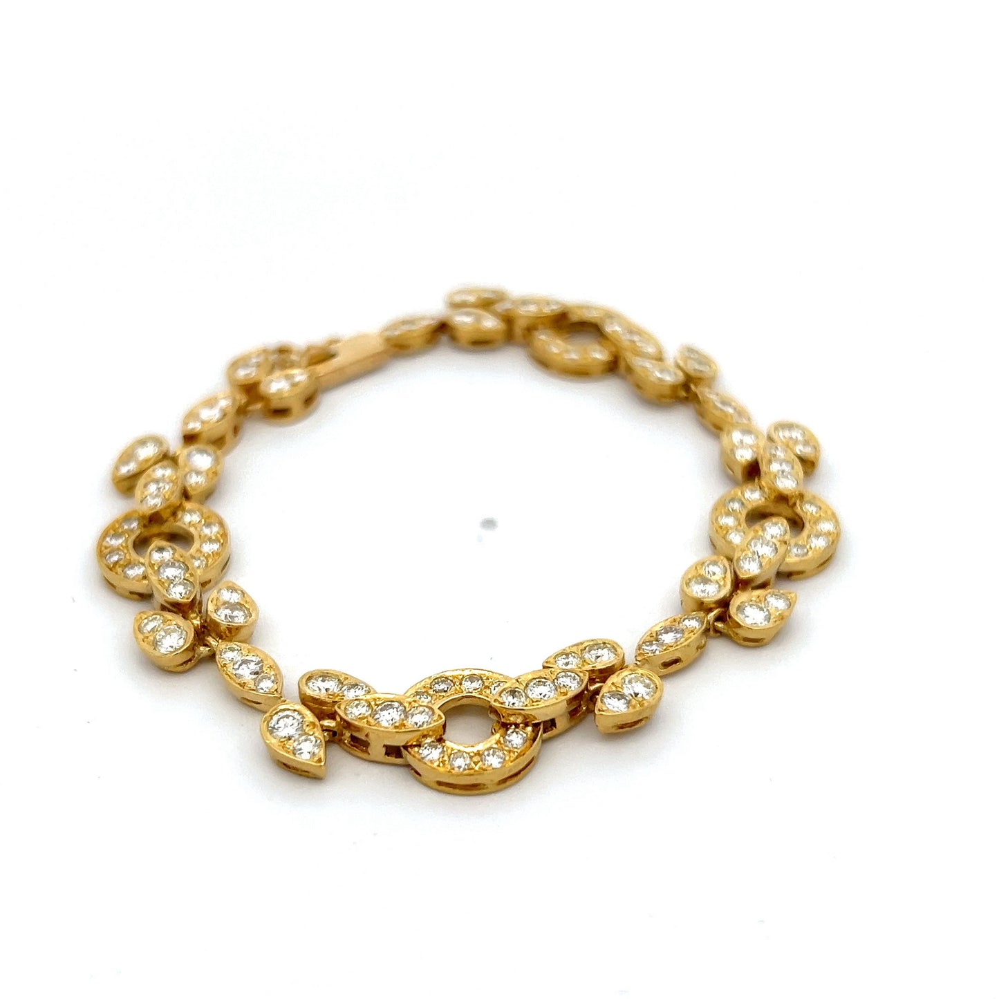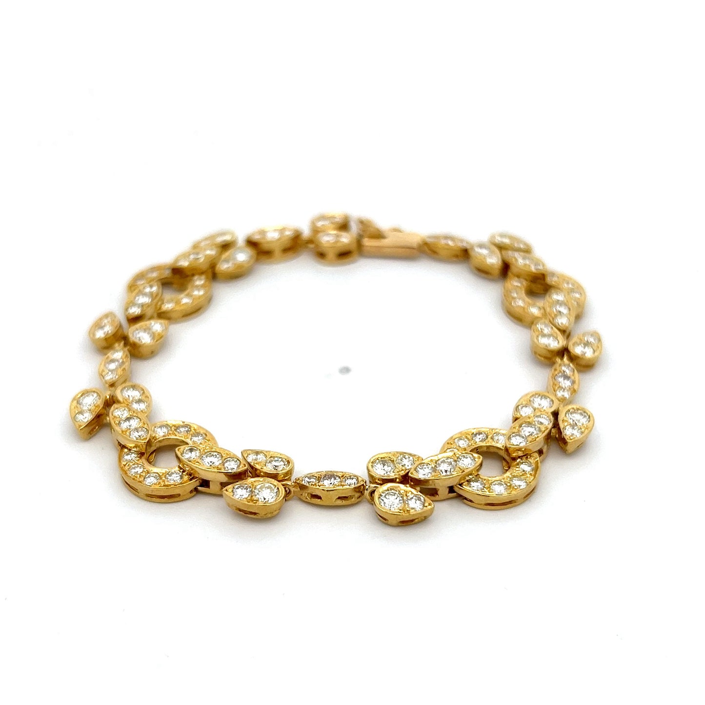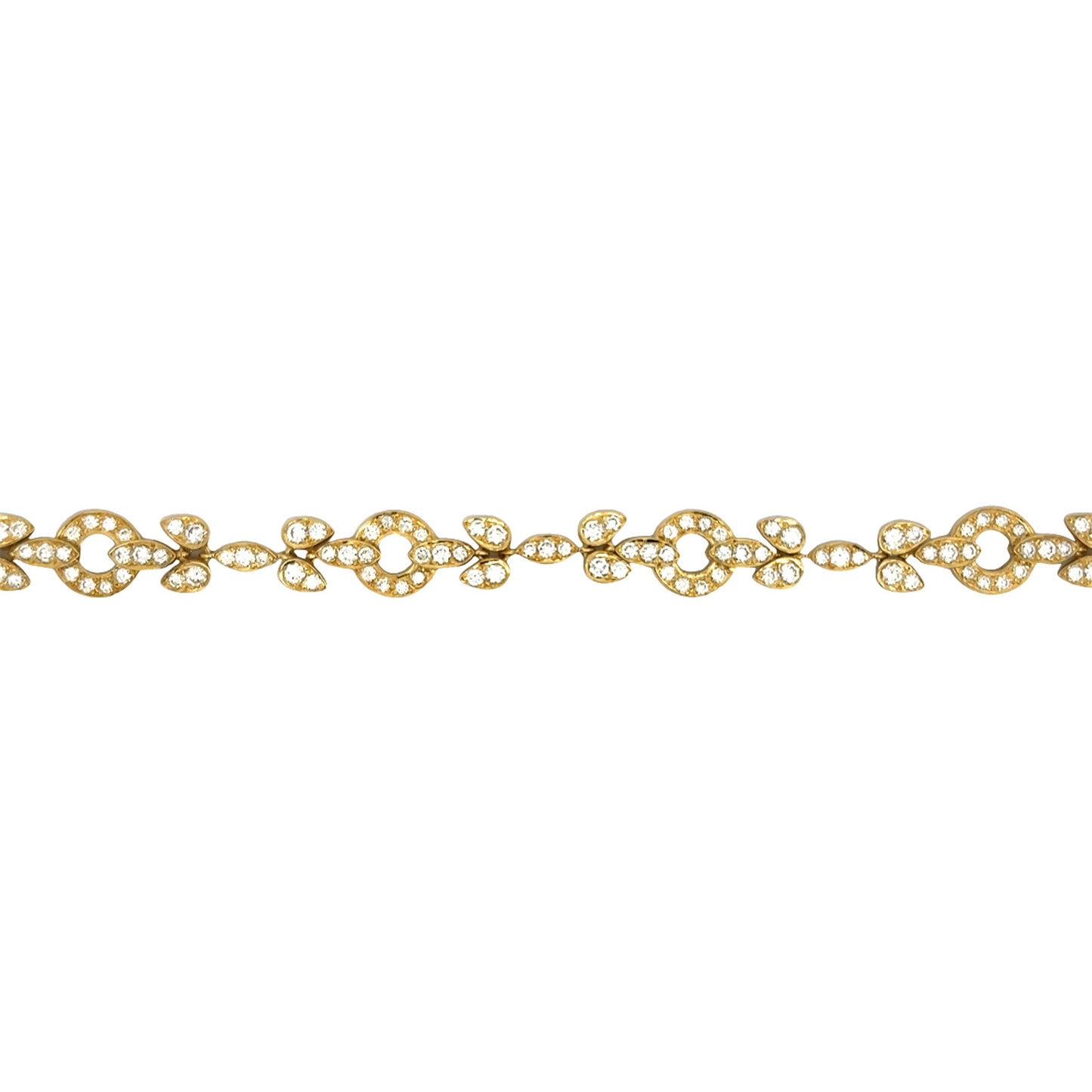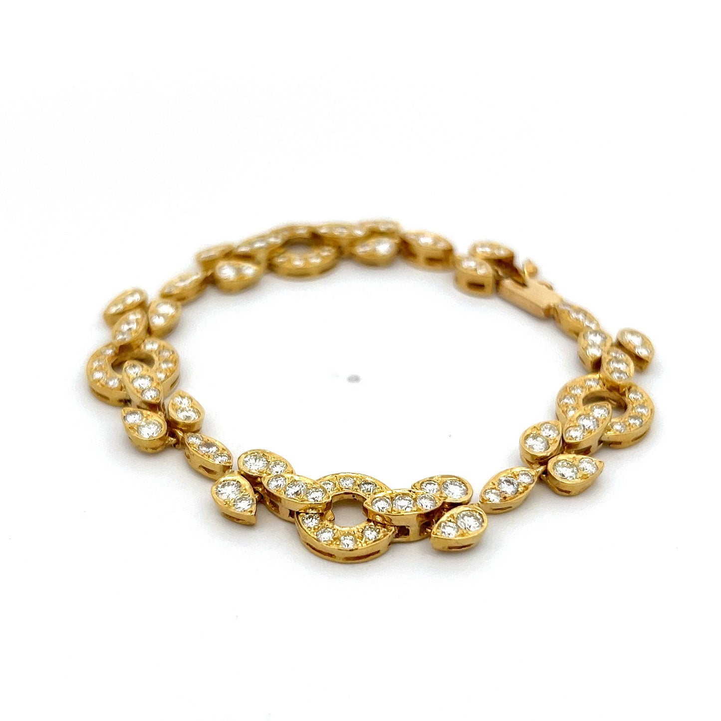 Crafted in 18 karat yellow gold, this unique bracelet features leaf and circle links that give the piece a modern and stylish look. With a clarity grade of VS1 and a diamond color grade of F or G, these natural diamonds are sure to catch the eye with its brilliant sparkle. This bracelet has 2.89 carats total of diamonds with a total count of 76 stones set in polished yellow gold. Whether you're dressing up for a special occasion or adding a touch of glamour to your everyday look, this unique diamond bracelet is the perfect choice.