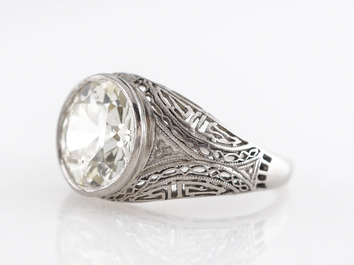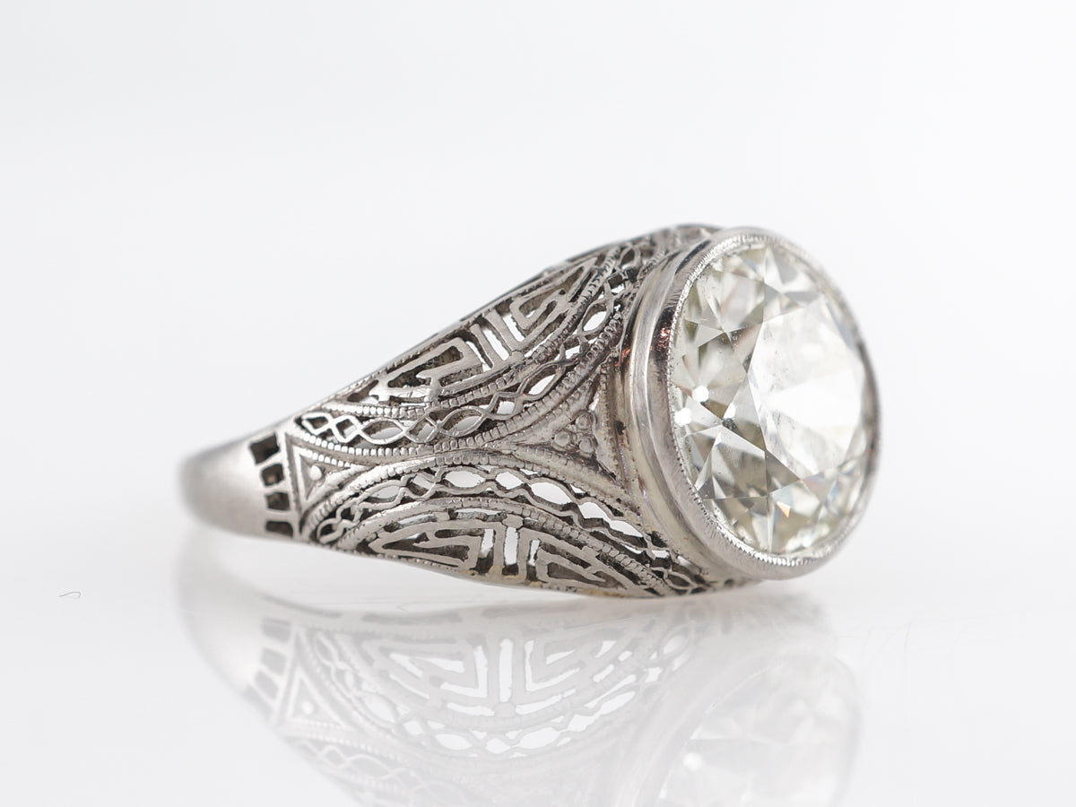 2.93 Carat Old European Cut Diamond Engagement Ring in Platinum. This amazing filigree engagement ring features a GIA certified 2.93 carat Old European cut diamond and is set in platinum. The large center diamond is bezel set atop a smooth contour of intricate filigree wires. The design of the wires overlapping each other is incredible to look at, with the fine detail speaking to the craftsmanship of the Art Deco time period.