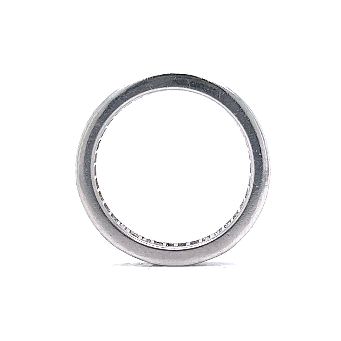 This sleek eternity wedding band features 2.94 carats of sparkling diamonds finished in shimmering platinum. Forty-two (42) .07 carat emerald cut diamonds are channel set around the entire platinum band. This ring measures 4.51mm wide and sits 2.07mm above the finger. From its streamlined design to the elongated facets, this wedding band is a jewelry designer’s dream. Wear this band with any platinum engagement ring for some added brilliance!