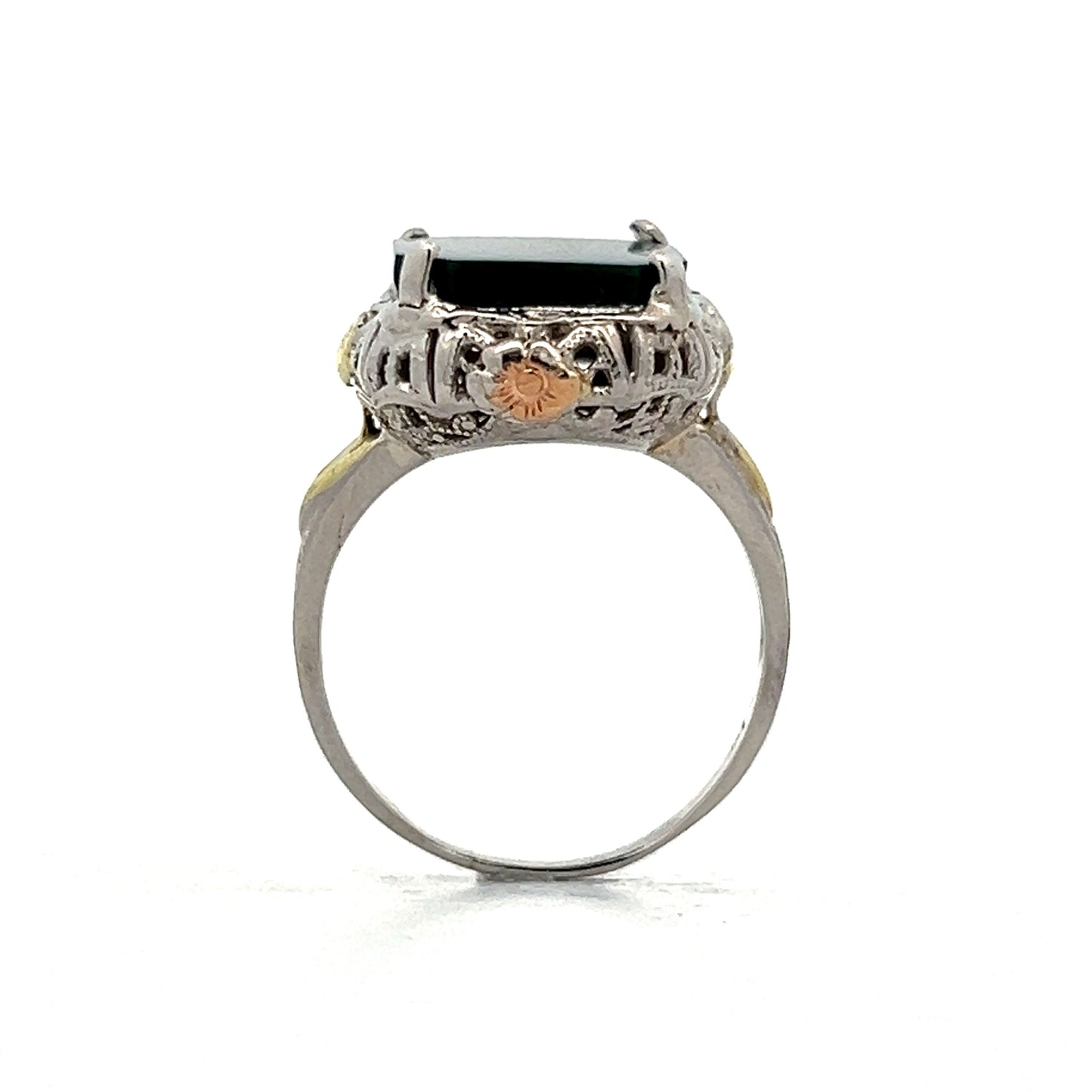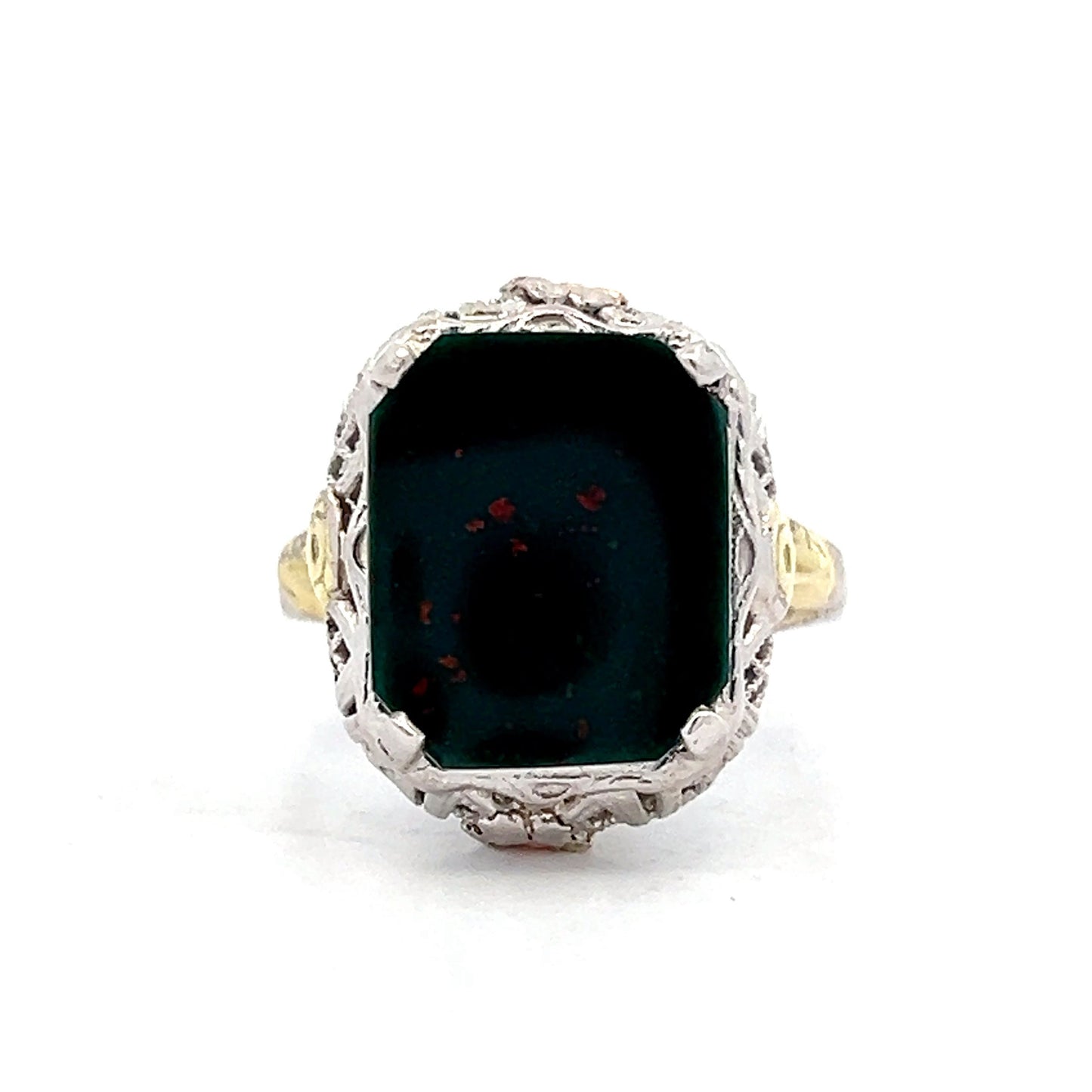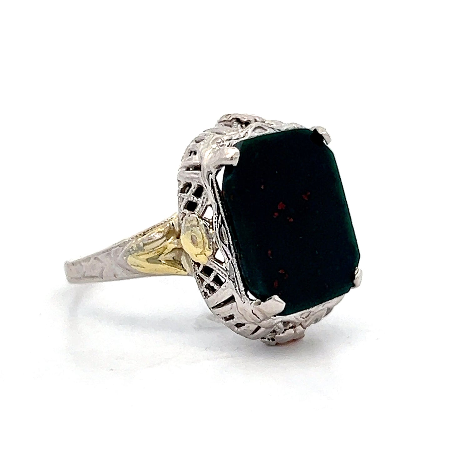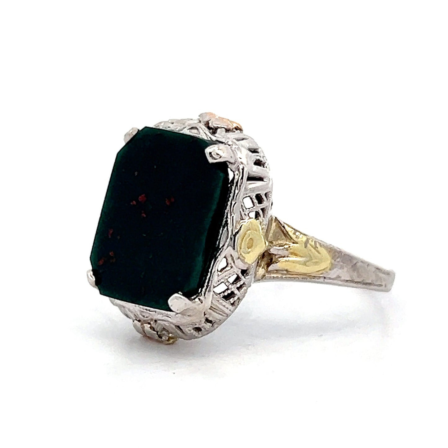 This Art Deco cocktail ring is crafted in 14 karat white gold, featuring a 2.96 carat bloodstone. The cabochon cut emphasizes the stone's deep, rich colors. The ring is adorned with intricate filigree detailing and floral accents in yellow and rose gold. The four-prong setting securely holds the bloodstone, ensuring it remains the focal point. This ring is perfect for adding a touch of vintage artistry to your collection and is ideal for special occasions.