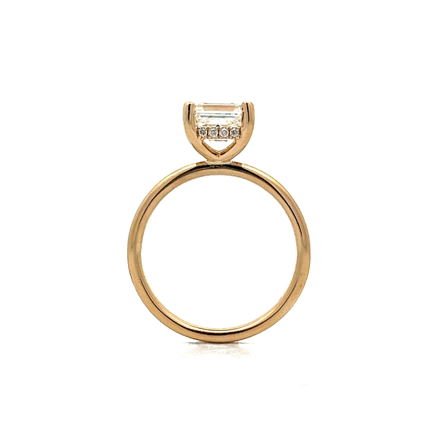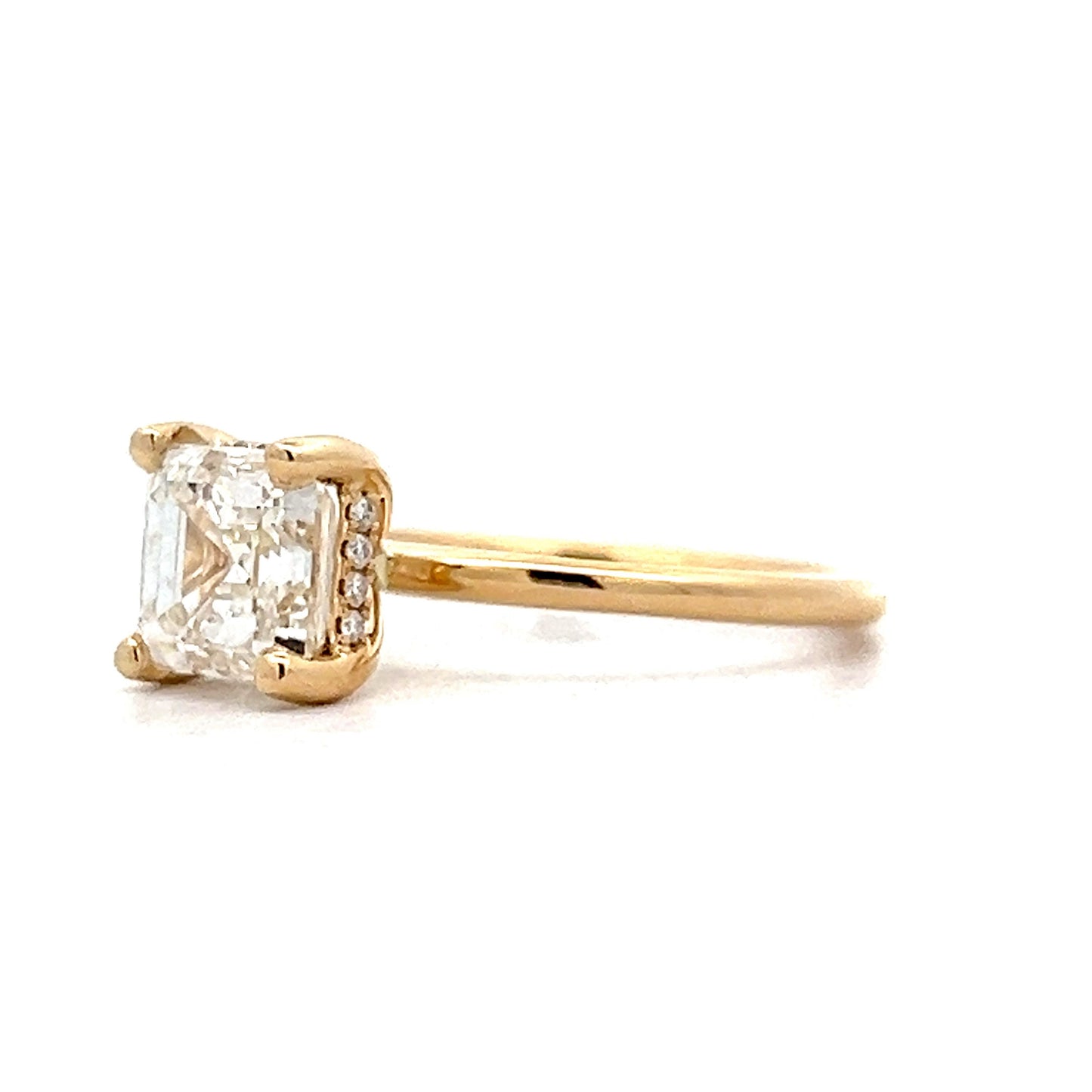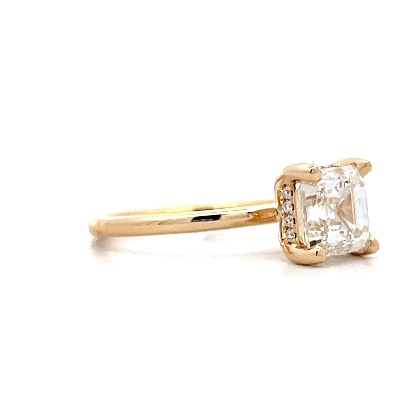 This solitaire engagement ring features a 2.02 carat Asscher cut diamond in 14k yellow gold. The center diamond features a beautiful Asscher cut with linear facets and a powerful brilliance. The diamond is set in four prongs for a timeless solitaire look. Twinkling around the center diamond, sixteen (16) accent diamonds are set in a hidden halo arrangement, adding an elegant sparkle to the underside of the ring. A very unique solitaire engagement ring, this one is definitely going to turn heads.
