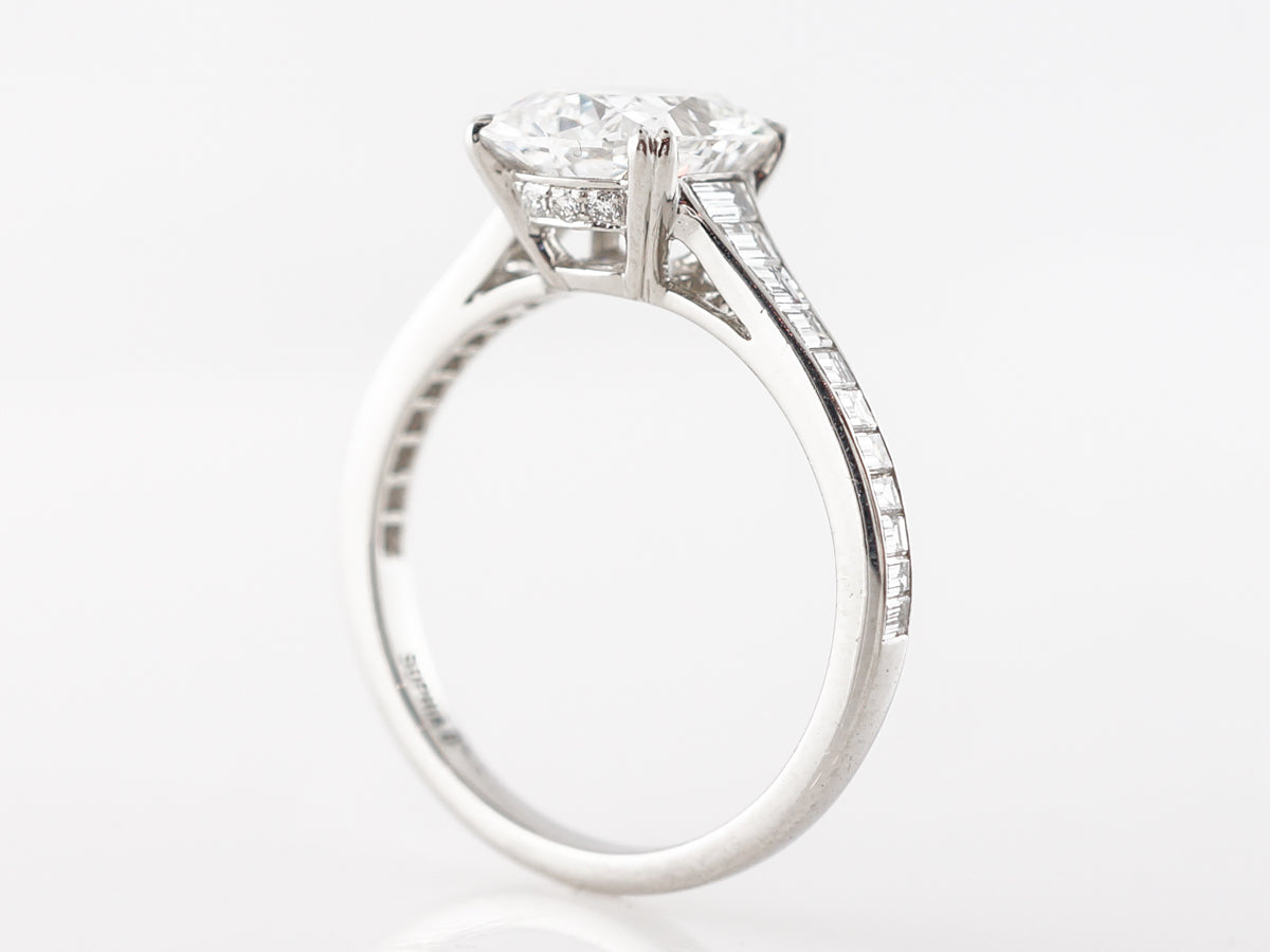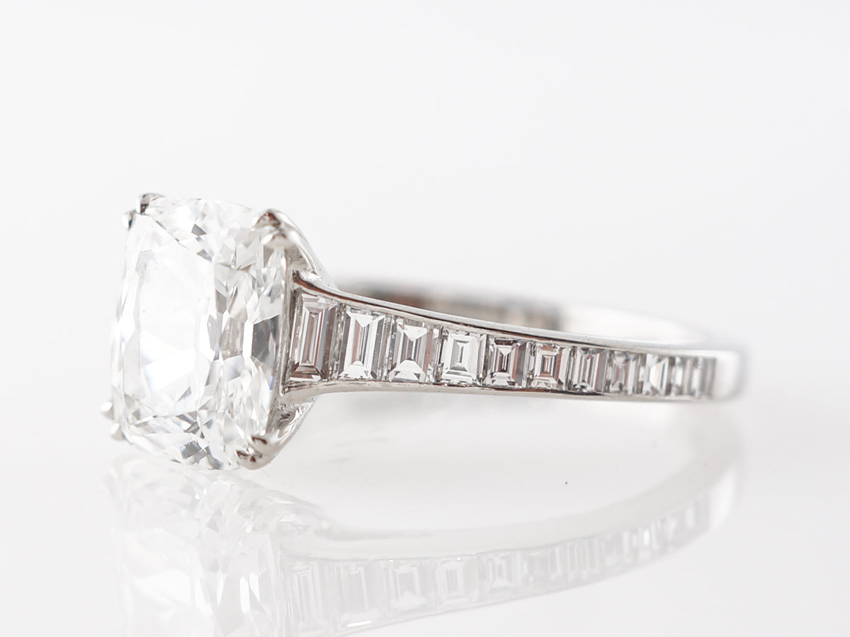 2 Carat Cushion Cut Diamond Engagement Ring in Platinum. This stunning modern engagement ring features a 2.00 carat F color cushion cut diamond with 1.25 carats of baguette accents and is set in platinum. The center stone is set with double prongs creating a very open basket to let in maximum light. The shoulders feature a gently tapered row of channel set baguettes finishing halfway down the shank. This clean and elegant ring makes brilliant use of its wonderful clear and white center diamond with sophisticated accents on the shoulders and the basket.