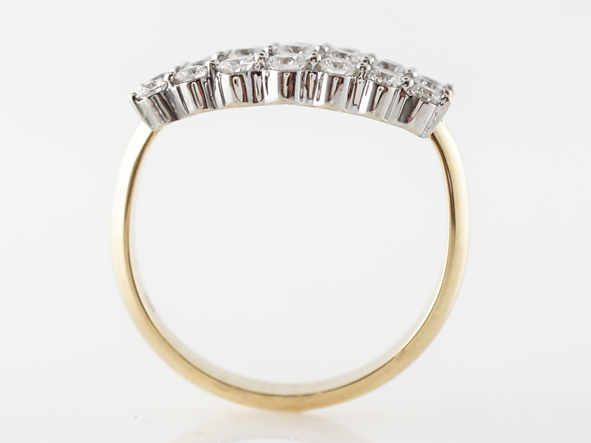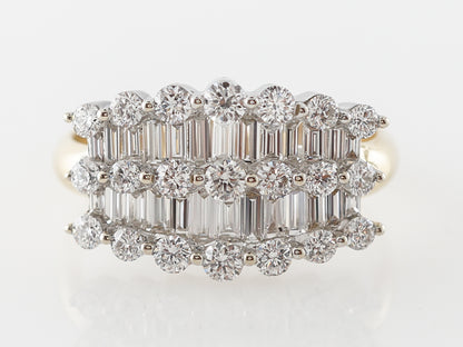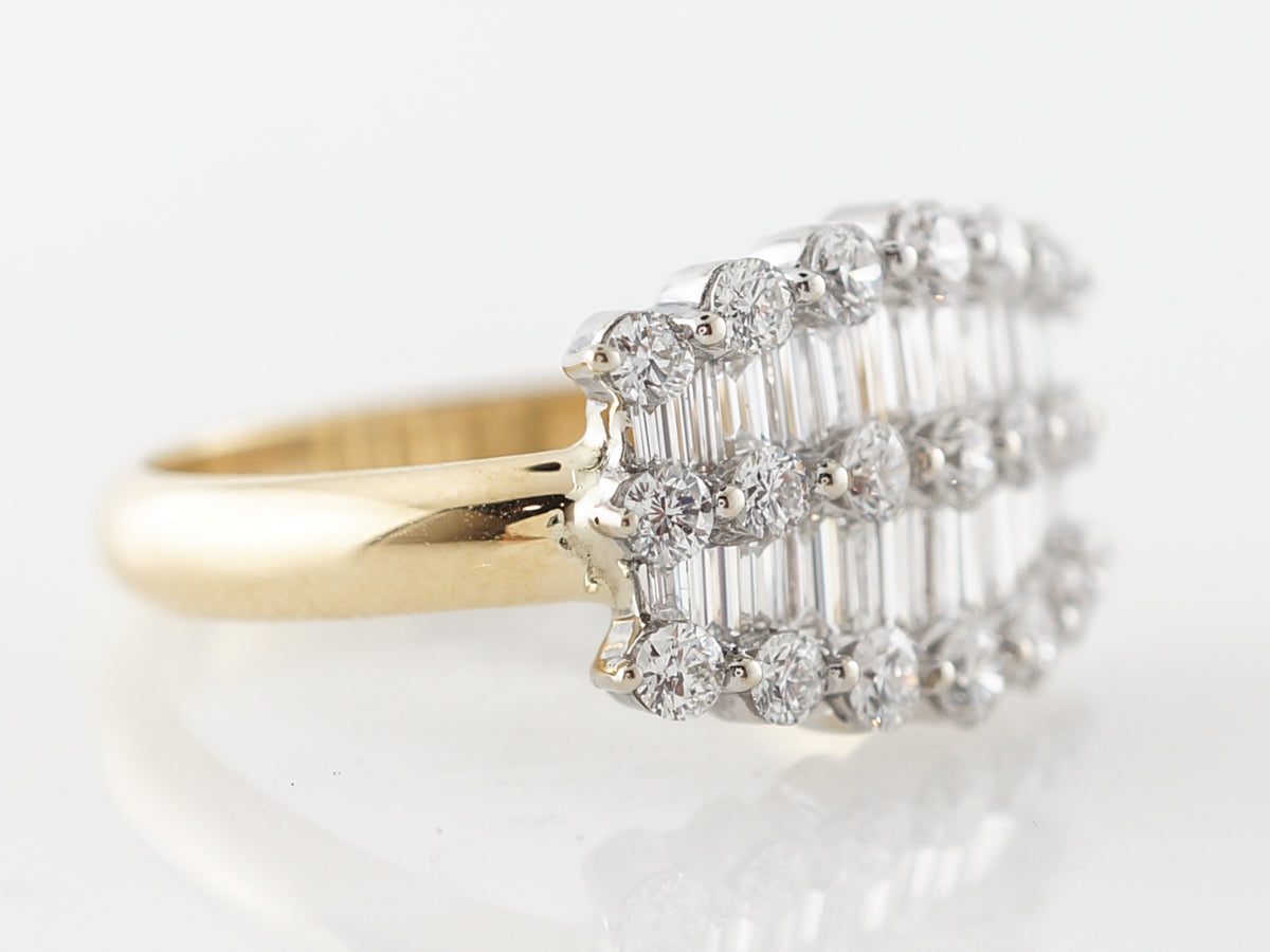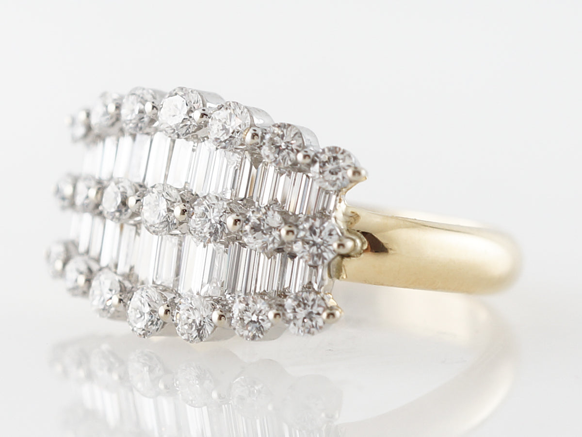 2 Carat Diamond Cluster Ring in 18k Yellow Gold. This is a fantastic right hand ring with 1.99 carats of round and baguette diamonds set in 18 karat white gold with an 18 karat yellow gold band. The cluster of diamonds follows three rows of Round Brilliant Cut diamonds separated by two rows of baguettes, which provides an impressive presence. The yellow gold band offers a nice amount of contrast with the white of the diamond and setting gold.