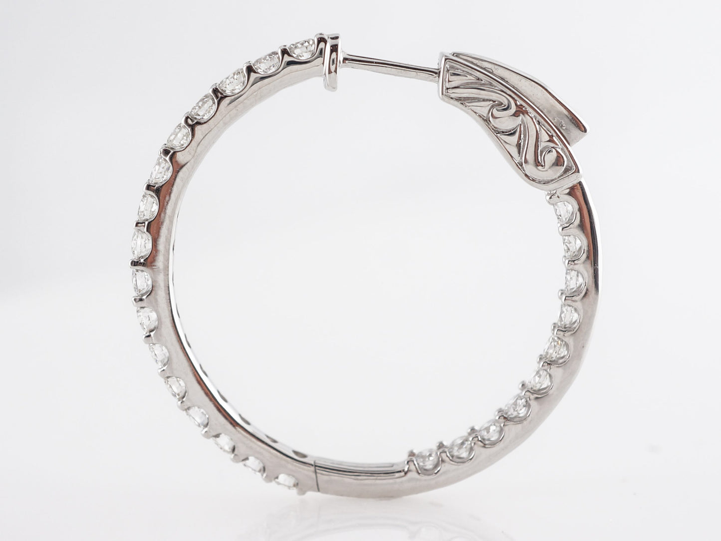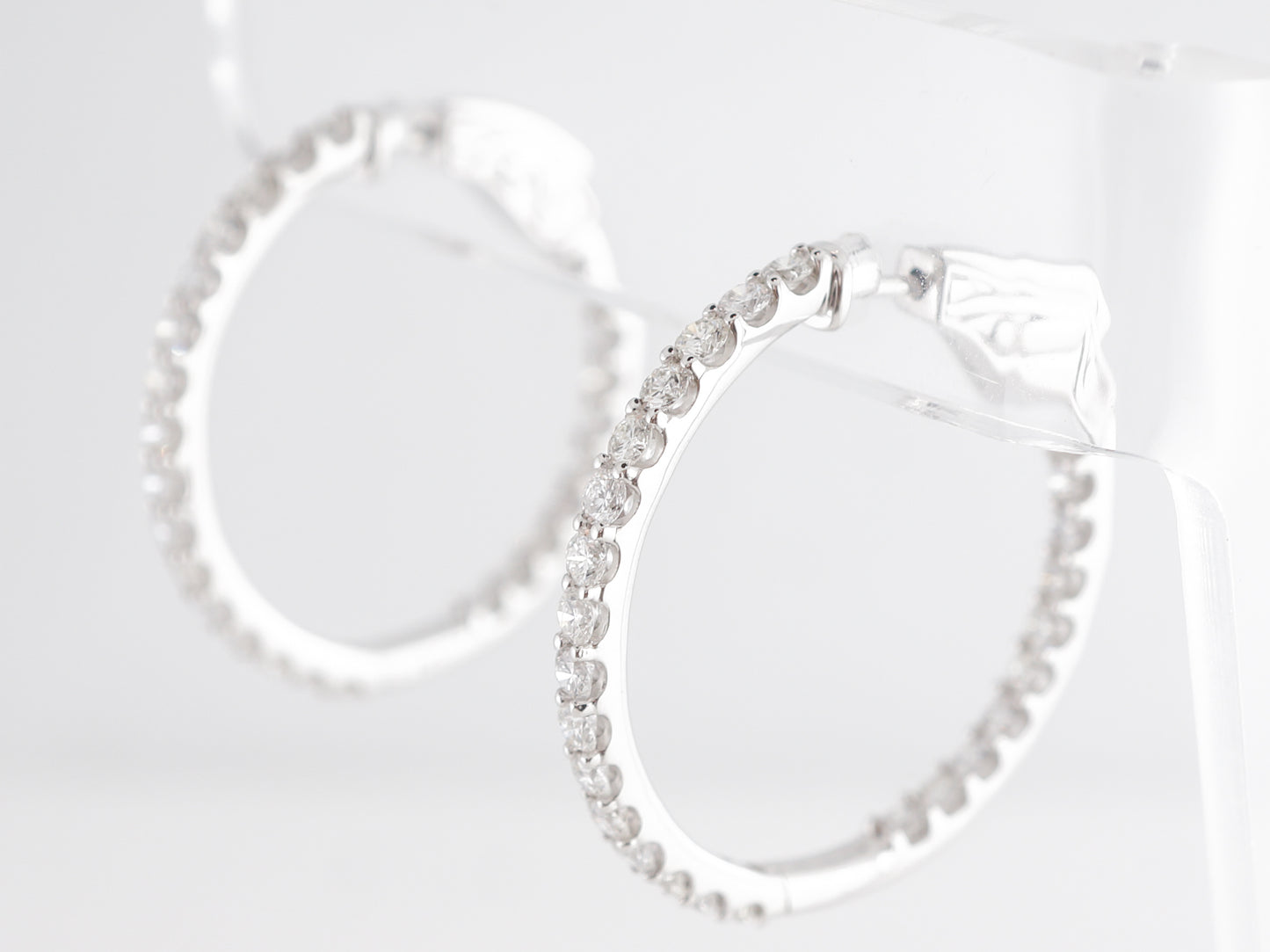 2 Carat Diamond Hoop Earrings in 14k White Gold. These fashionable inside-out hoop earrings feature 2.00 carats of sparkling diamonds set in 14 karat white gold. Fifty-two (52) .04 carat diamonds line the fronts of the medium-sized hoops. For a pop of dimension and sparkle, these hoops will brighten up any outfit!