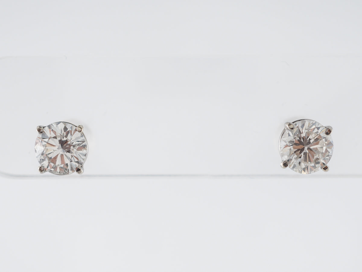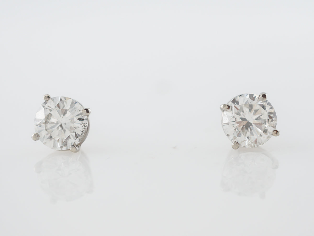 2 Carat Diamond Stud Earrings in 14k White Gold. These classic diamond ear studs are timeless in function and design. The 14 karat white gold four prong baskets hold two (2) round brilliant diamonds with a total weight of 2.15 carats. The diamonds are white with no visible inclusions. They are perfectly brilliant with great refraction.