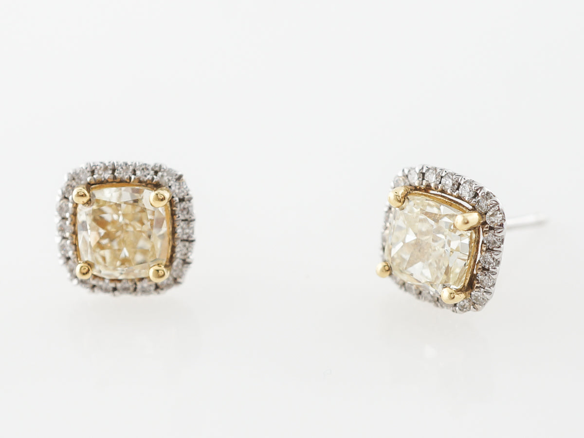 2 Carat Fancy Yellow Diamond Stud Earrings. These 2 carat diamond stud earrings are incredibly beautiful. The fancy yellow color, as well as the large yellow gold bead setting, inside a halo of twenty (20) white accent diamonds provides excellent contrast. The .60 carats of white diamonds also provide wonderful sparkle to enhance the yellow center stones. These would be fabulous for special occasions or everyday wear!