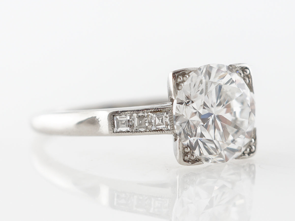 2 Carat Round Diamond Engagement Ring Platinum. This classic Mid-Century square prong diamond engagement ring that features a fabulous 2 carat round brilliant cut diamond at the center and finished in platinum. The shoulders are adorned with six (6) .04 carat accent diamonds that are bead set, with extremely fine milgrain detail outside of them. This is a clean, classic design made to make the diamond stand out as much as possible.