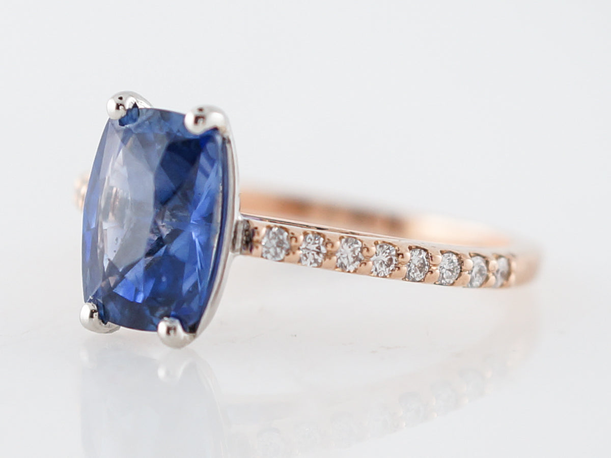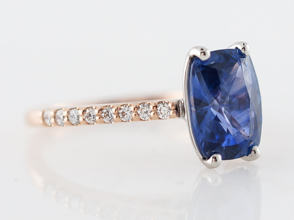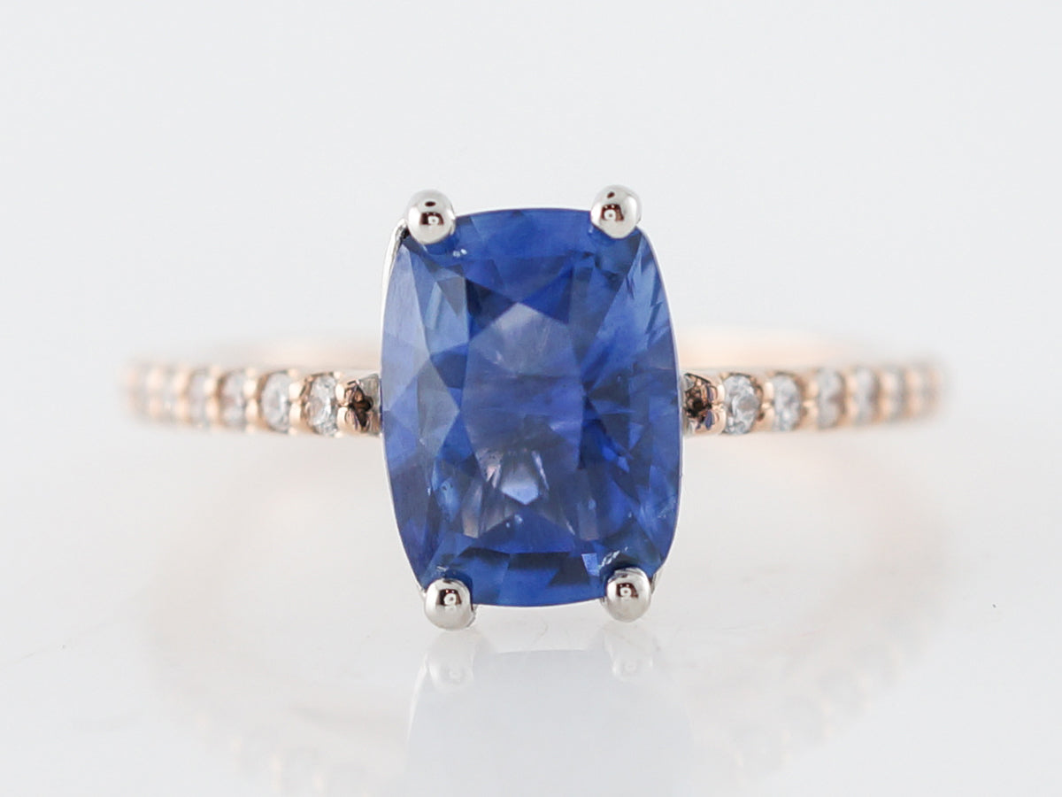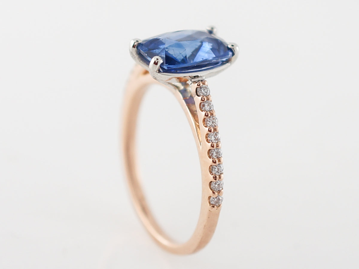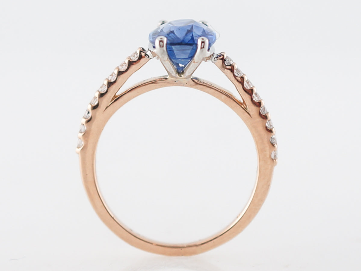 2 Carat Oval Cut Sapphire Engagement Ring in Rose Gold. This modern engagement ring uses the warm tones of 14k rose gold to contrast the cool nature of the 2.24 carat oval cut sapphire. The center stone is a oval cut and set with four (4) prongs. With diamonds extending half way around the shank and adding a touch of sparkle this ring would be great with a rose gold wedding band.
