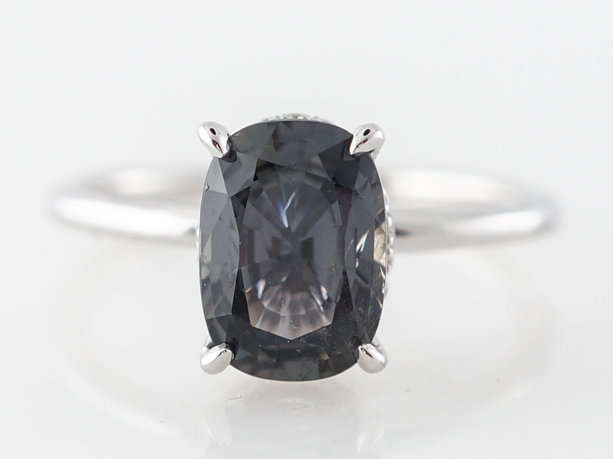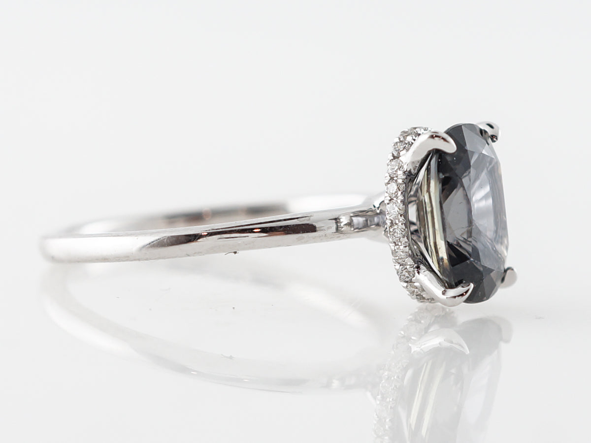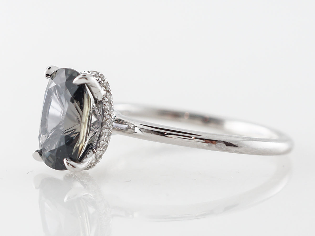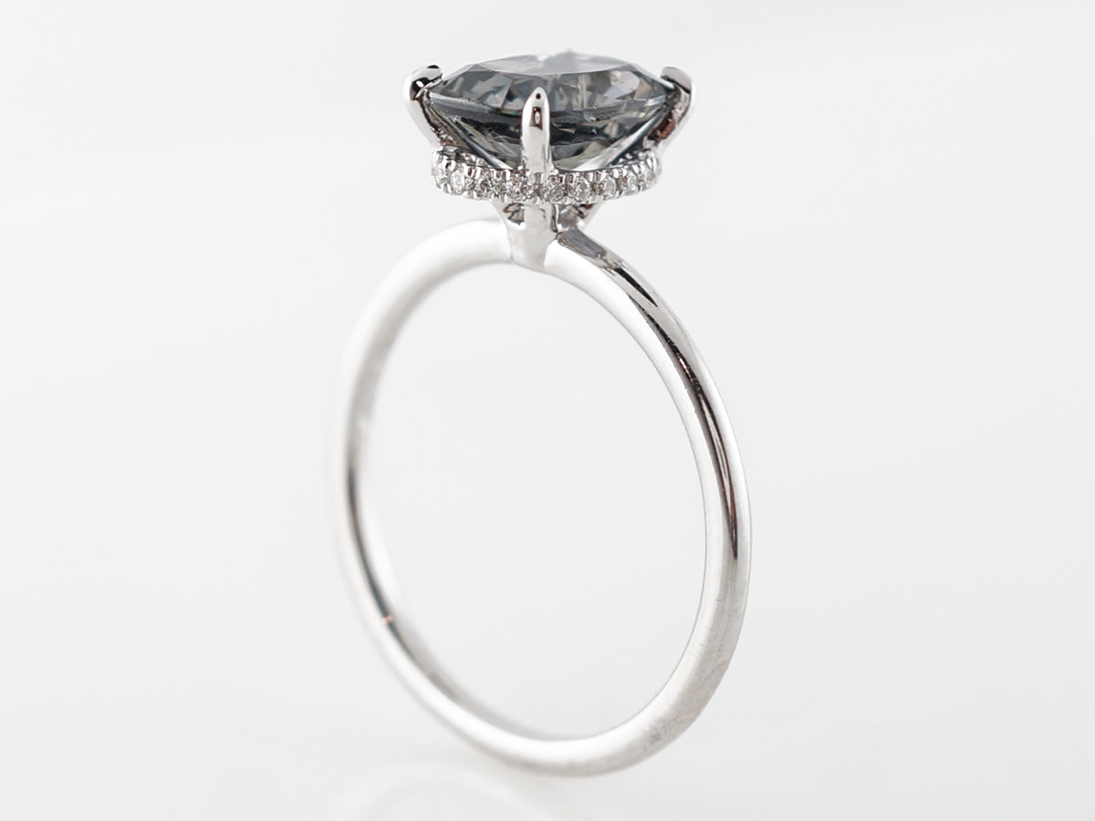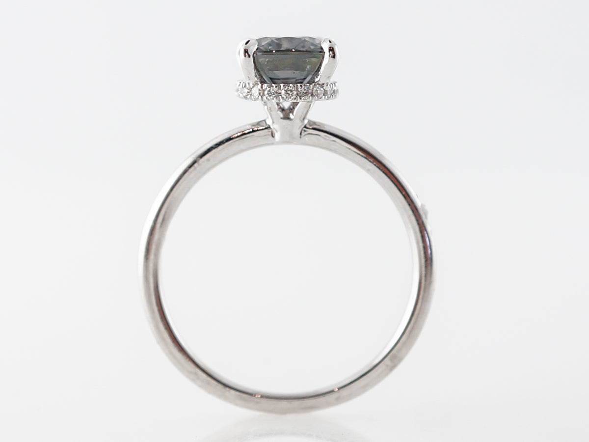 2 Carat Oval Sapphire Solitaire Engagement Ring in White Gold. This modern engagement ring features a 2.14 carat deep teal sapphire that is beautifully set in 14 karat white gold. The slender white gold band features a high polish and the center stone is held prominently above by four prongs. The gallery rail is adorned with a row of diamonds for some flash when viewed from the side profile. This is a fabulous ring for someone looking for a colored stone in a sleek and stylish setting.