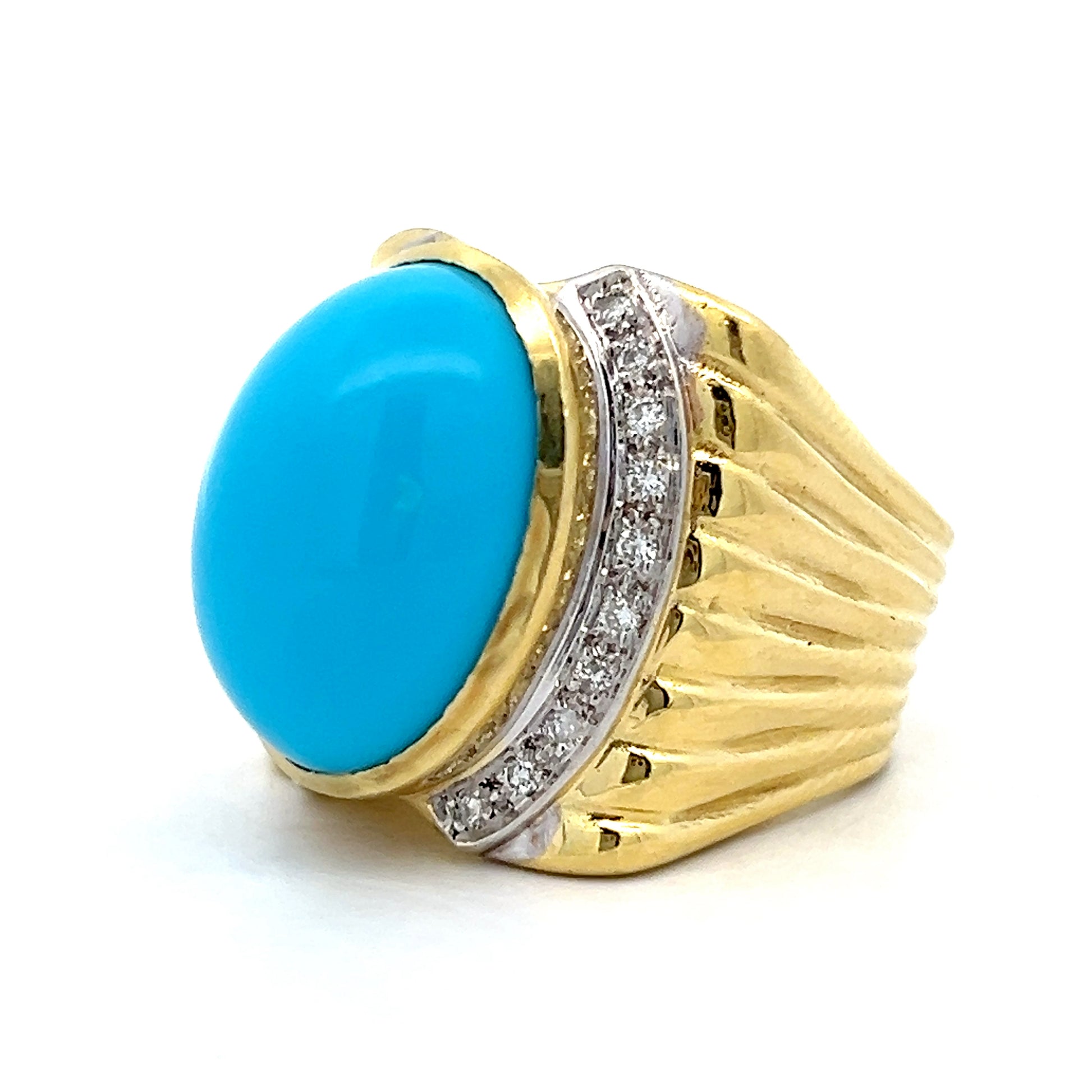 This Mid-Century cocktail ring features a 20.36 carat oval cabochon turquoise bezel-set in 18 karat yellow gold with ridged mounting details. Twenty round brilliant cut diamonds totaling .40 carats are set in 18 karat white gold, creating contrast against the vibrant turquoise centerpiece. The combination of yellow and white gold was popular during the Mid-Century period, when jewelers often mixed metals for dramatic effect. Each .02 carat diamond adds sparkle while the textured ridges along the mounting give the ring its distinctively large profile.