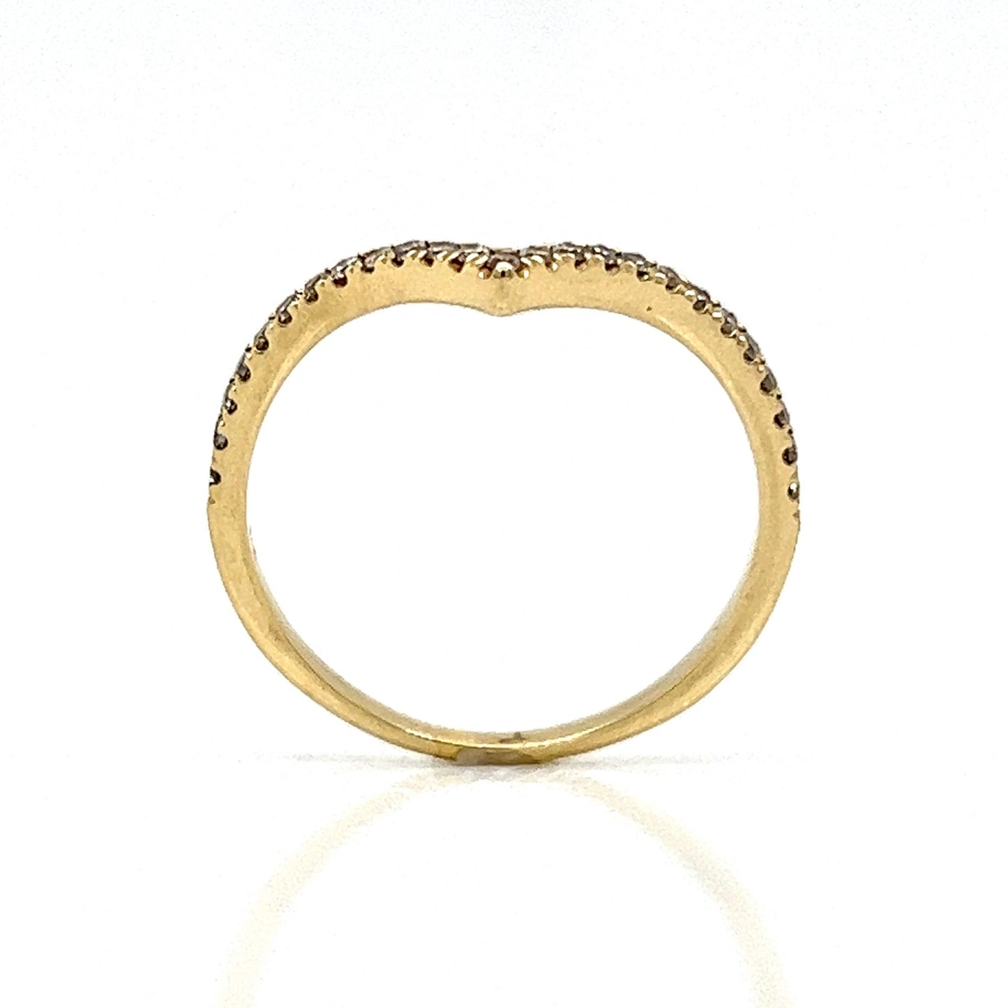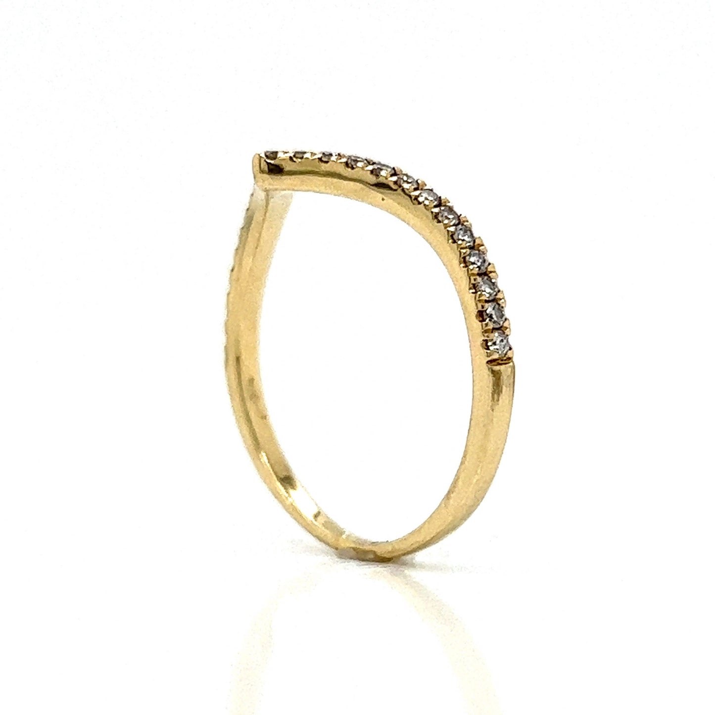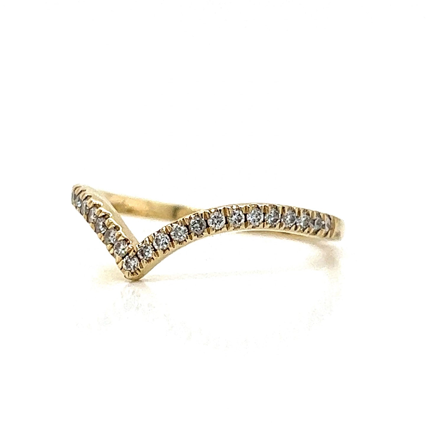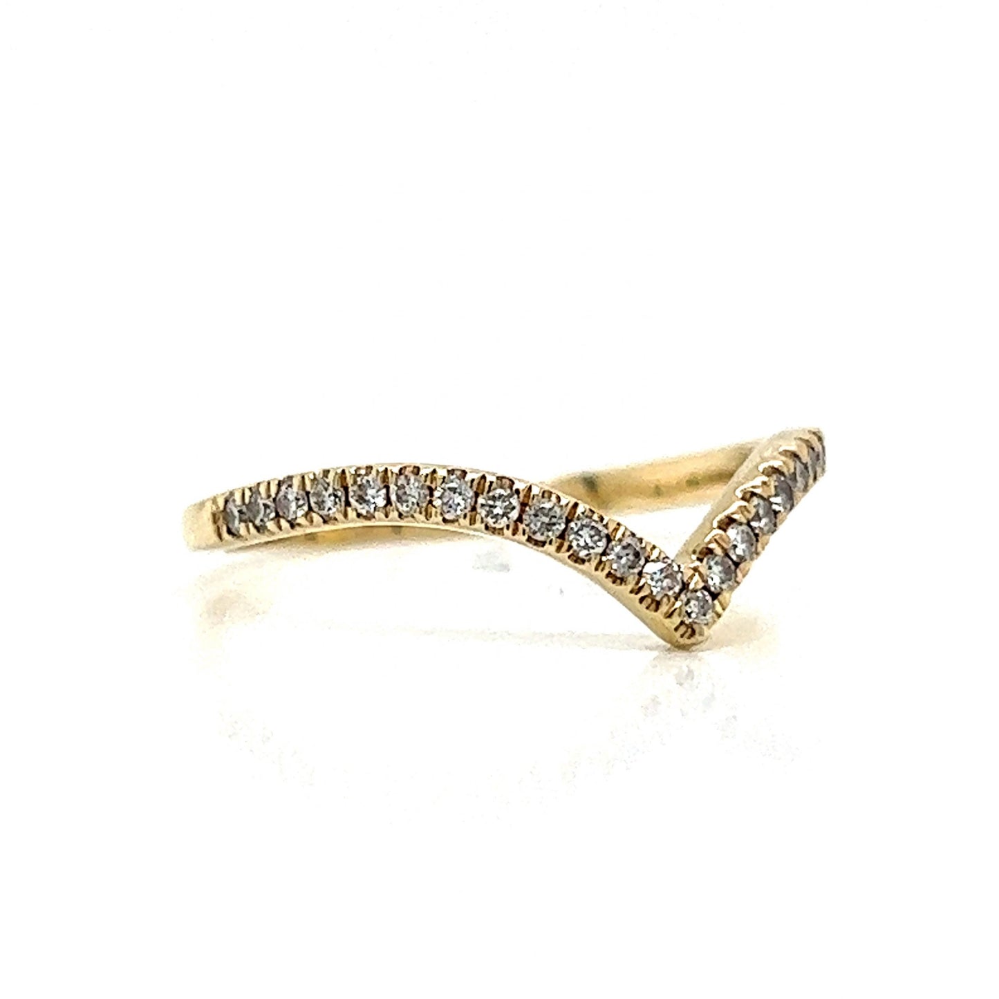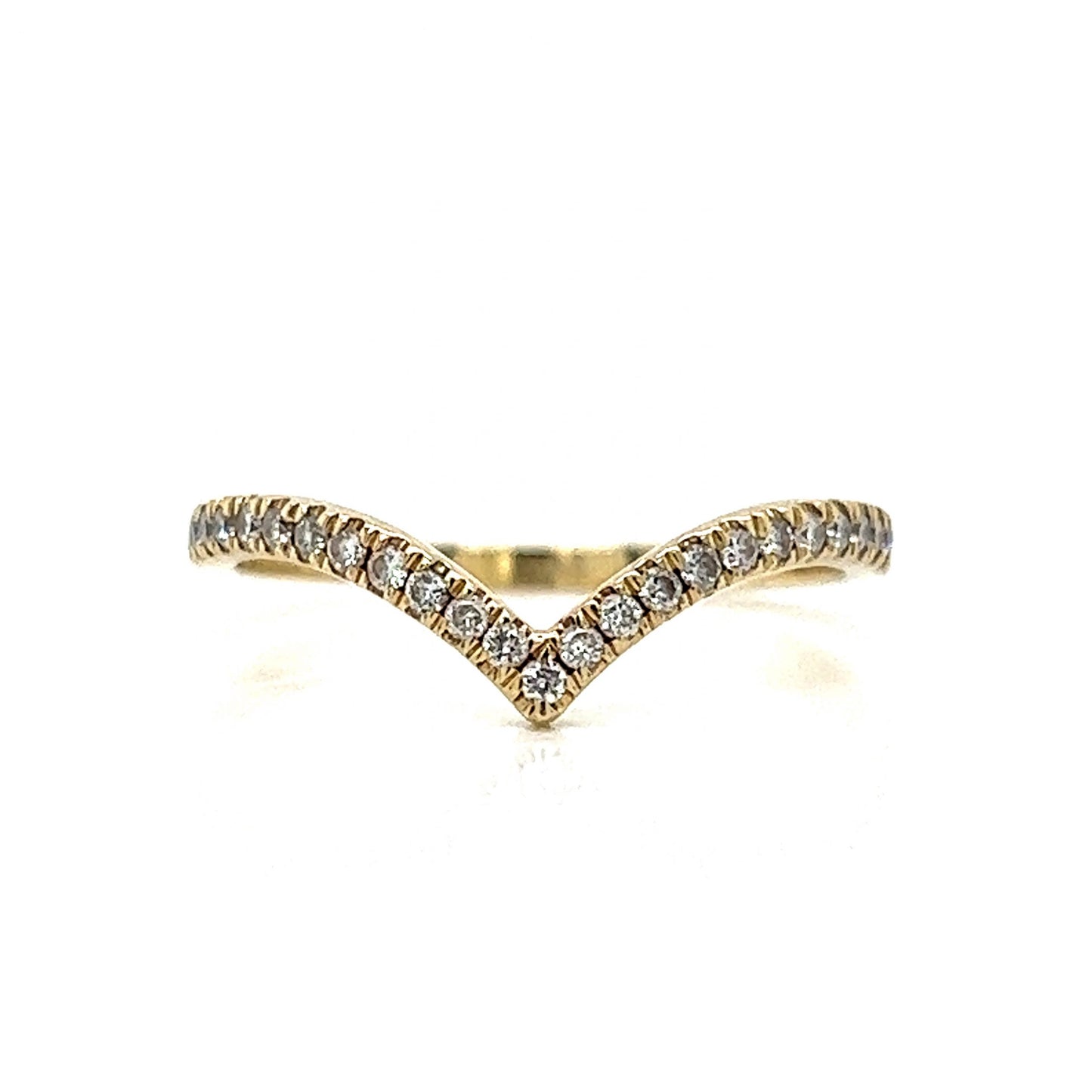 This dazzling, modern curved diamond wedding band features .20 carats of Round Brilliant cut diamonds in warm 14 karat yellow gold. Set in scallop prongs in an elegant “V” shape, twenty-five (25) near colorless diamonds sparkle against the yellow gold composition. Dainty stylish. With impressive brilliance and clarity, each diamond beautifully decorates the front of the notched band. Curved contoured wedding rings are great for stacking and leave space for the stone of an engagement ring.