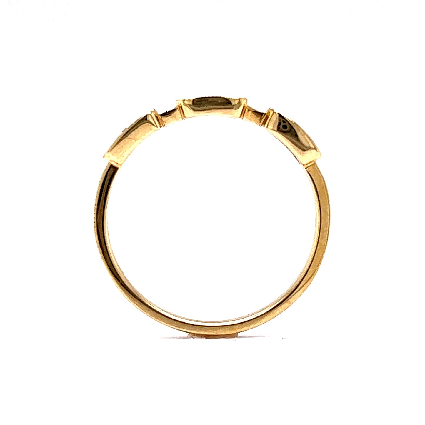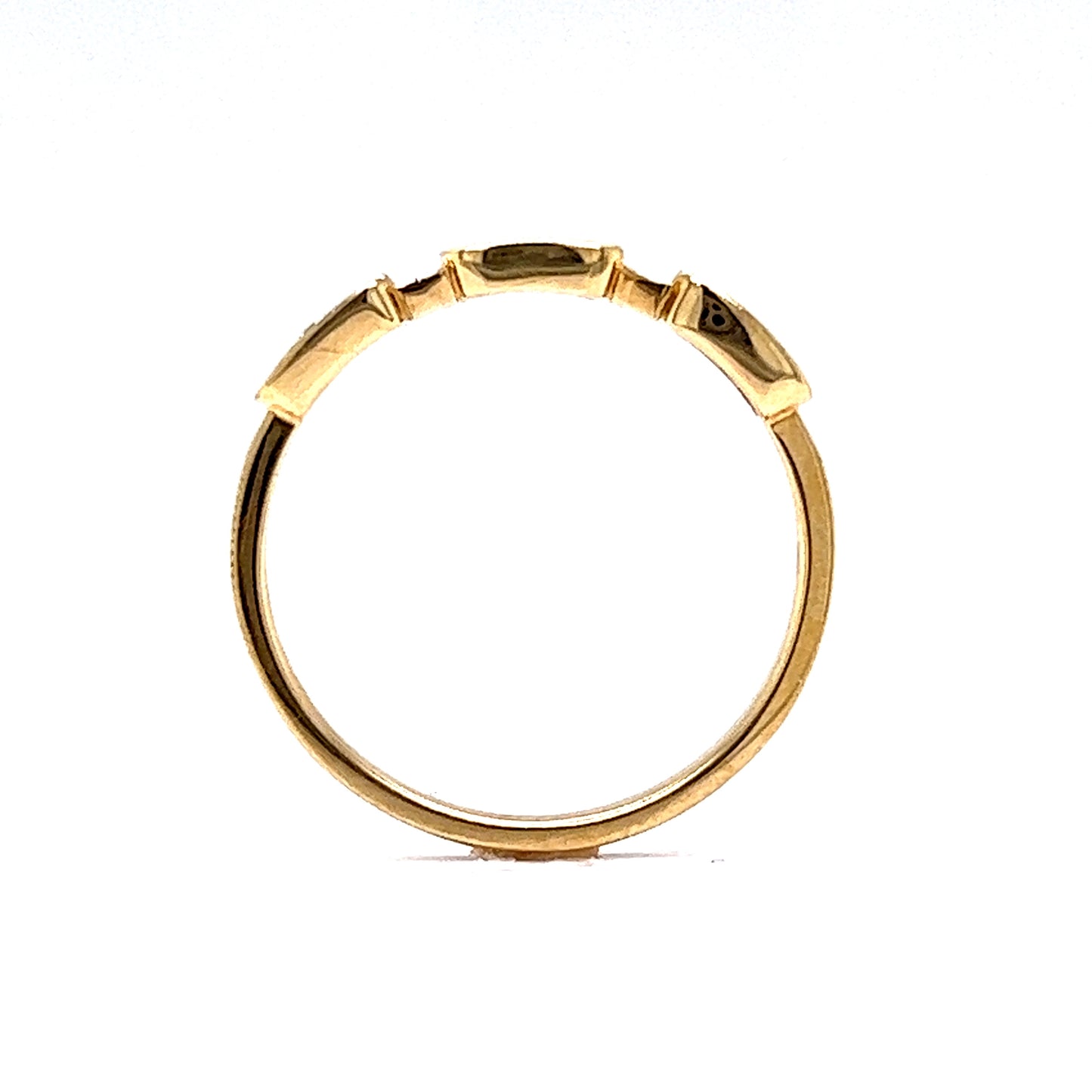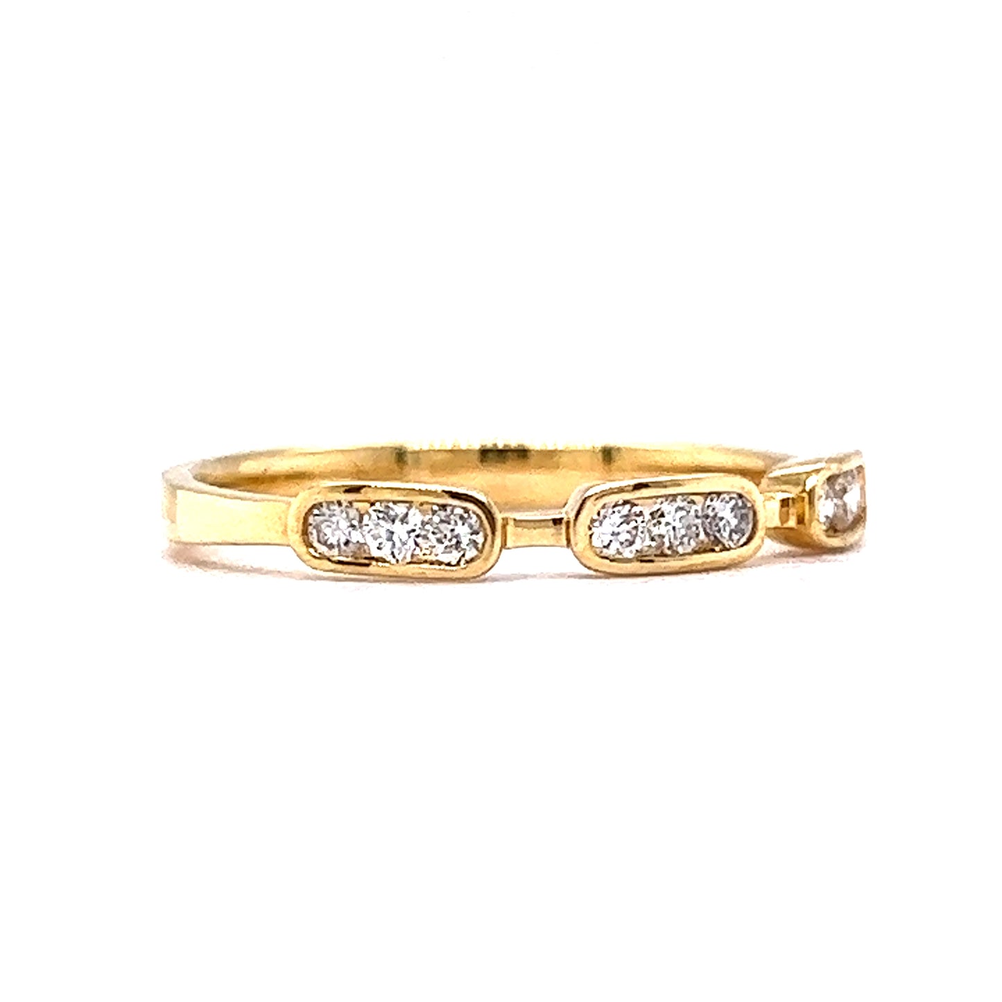 .20 Diamond Wedding Band in 18k Yellow Gold. This modern wedding band features .20 carats of diamonds finished in radiant 18 karat yellow gold. Nine (9) .022 carat near colorless diamonds are channel set in bold bezel mountings. Punctuating the ring for added texture and style, the bezels are finished on a flat profile, 18k yellow gold band. This chic ring can be worn as a wedding band or modern stacking ring!