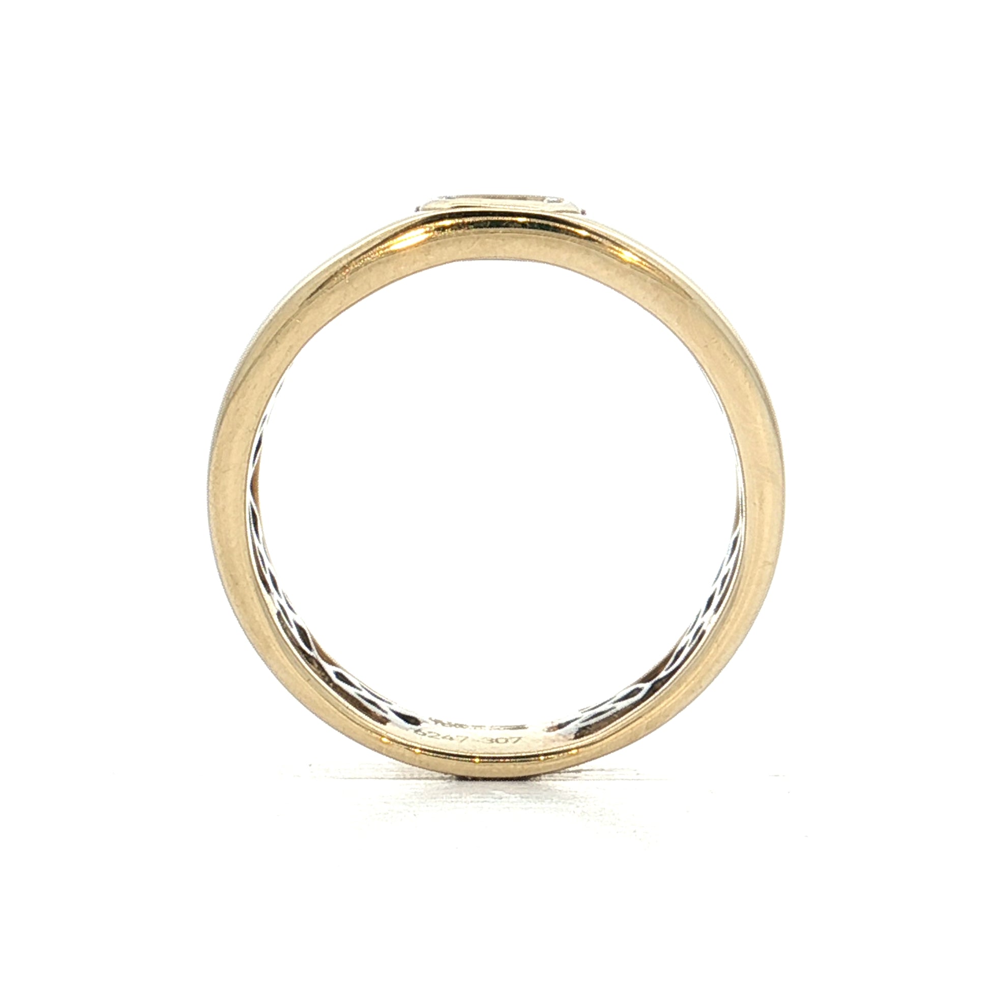 This 14 karat yellow gold stacking ring features a .20 carat emerald-cut diamond in a flush collet setting with platinum elements. The diamond has VS2/SI1 clarity, meaning it appears clean to the naked eye with only minor inclusions visible under magnification, and H/I color, which falls in the near-colorless range.